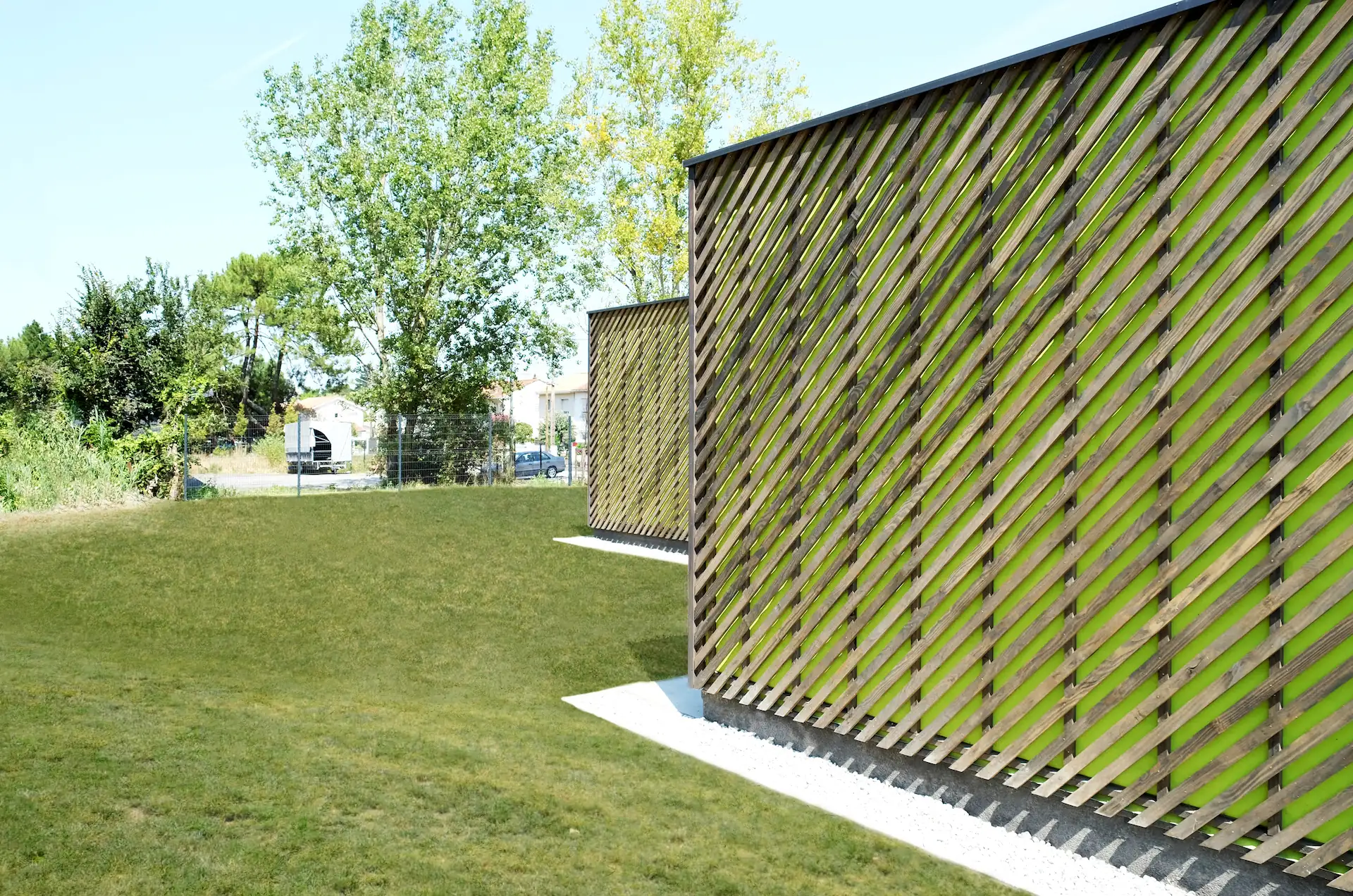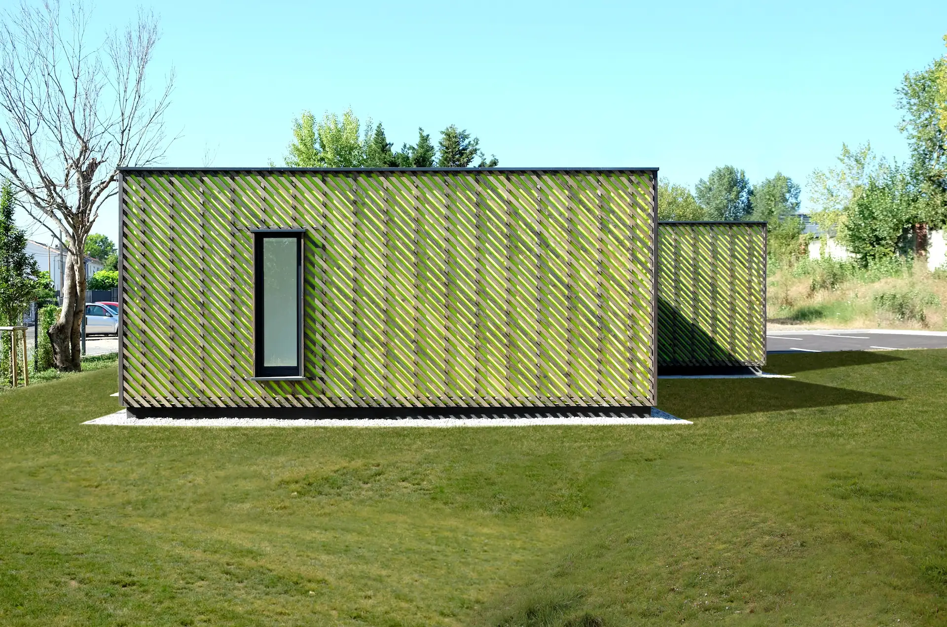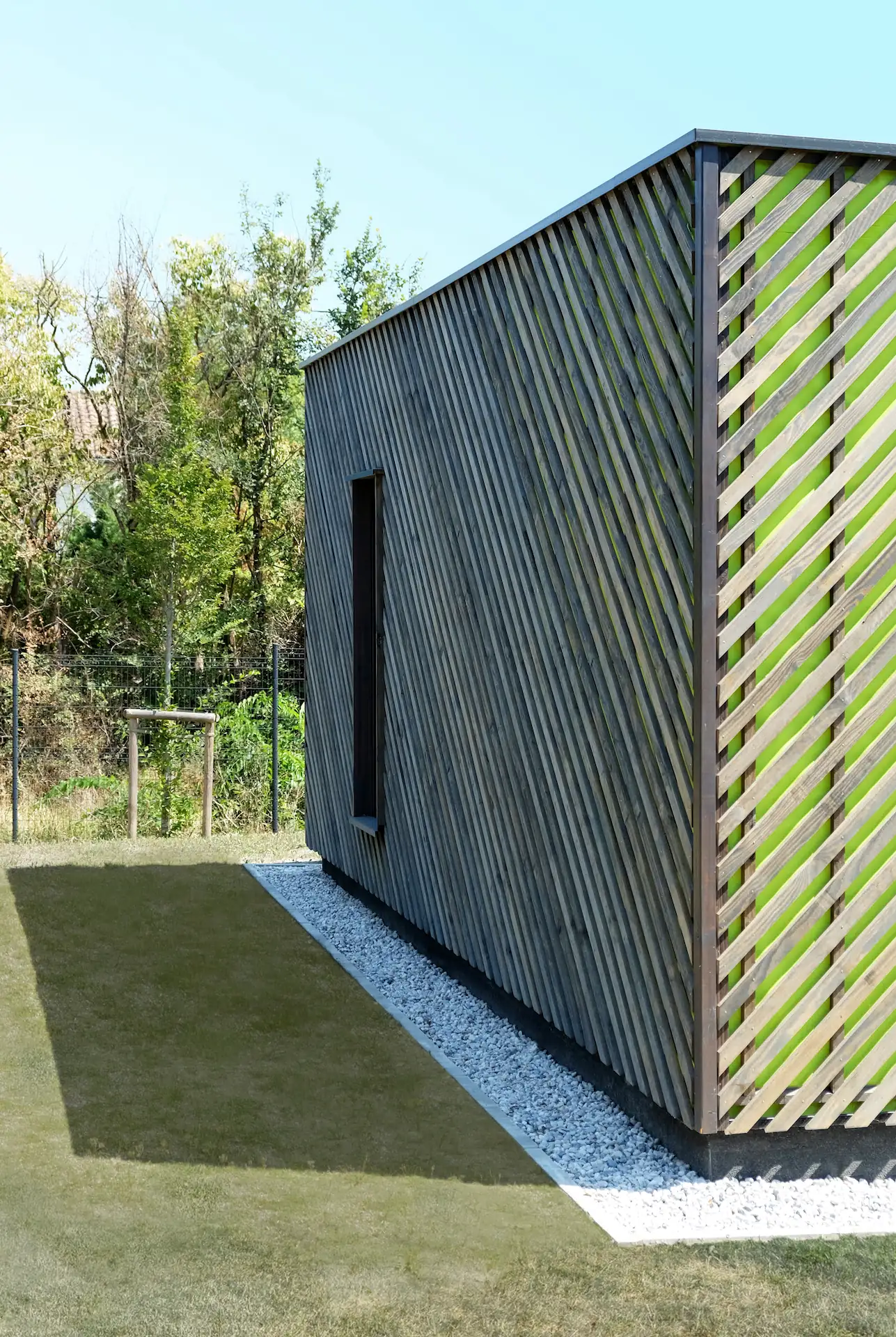 Sur fond de pare-pluie vert acide, l’ensemble joue visuellement avec la végétation environnante.