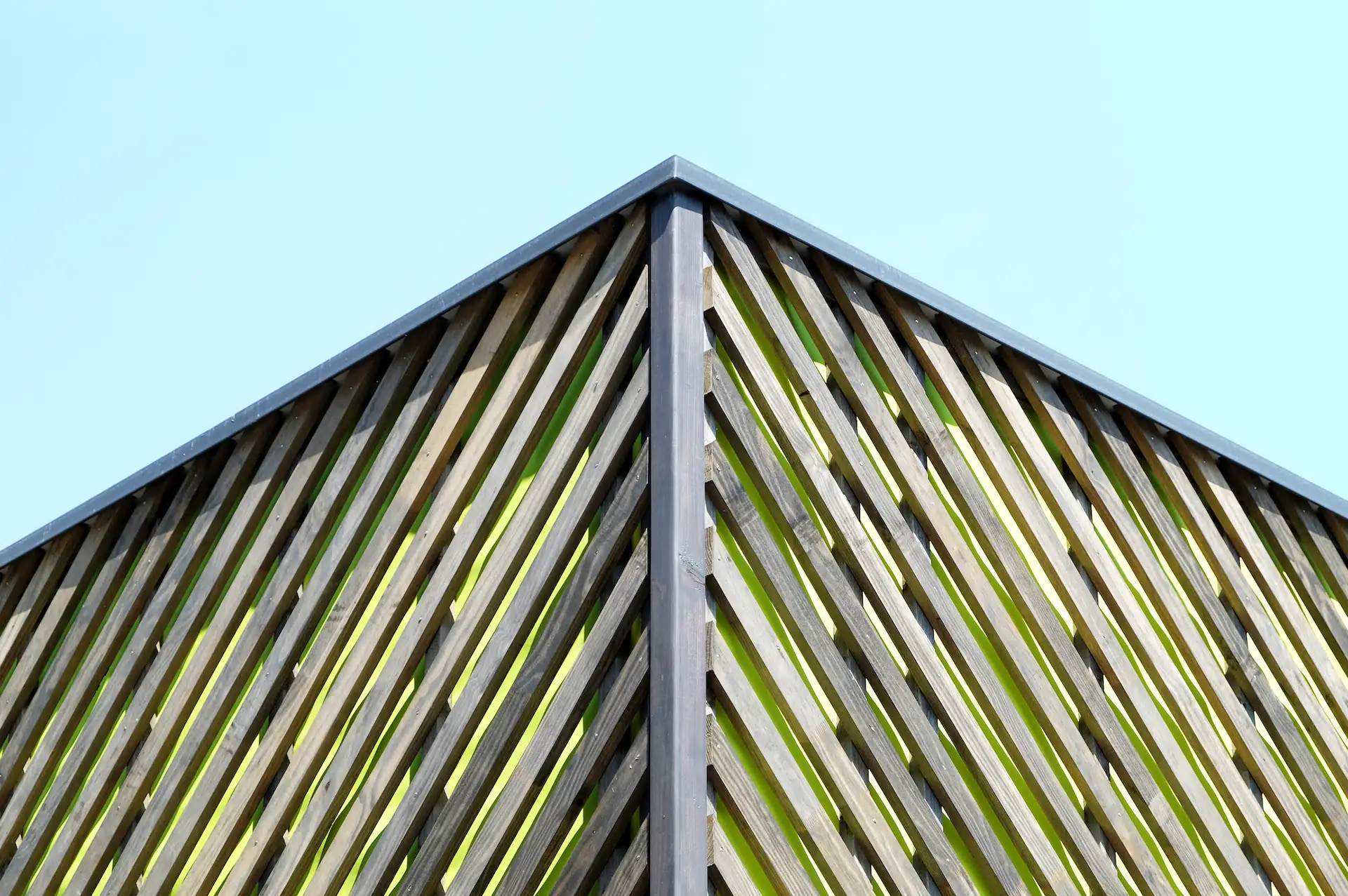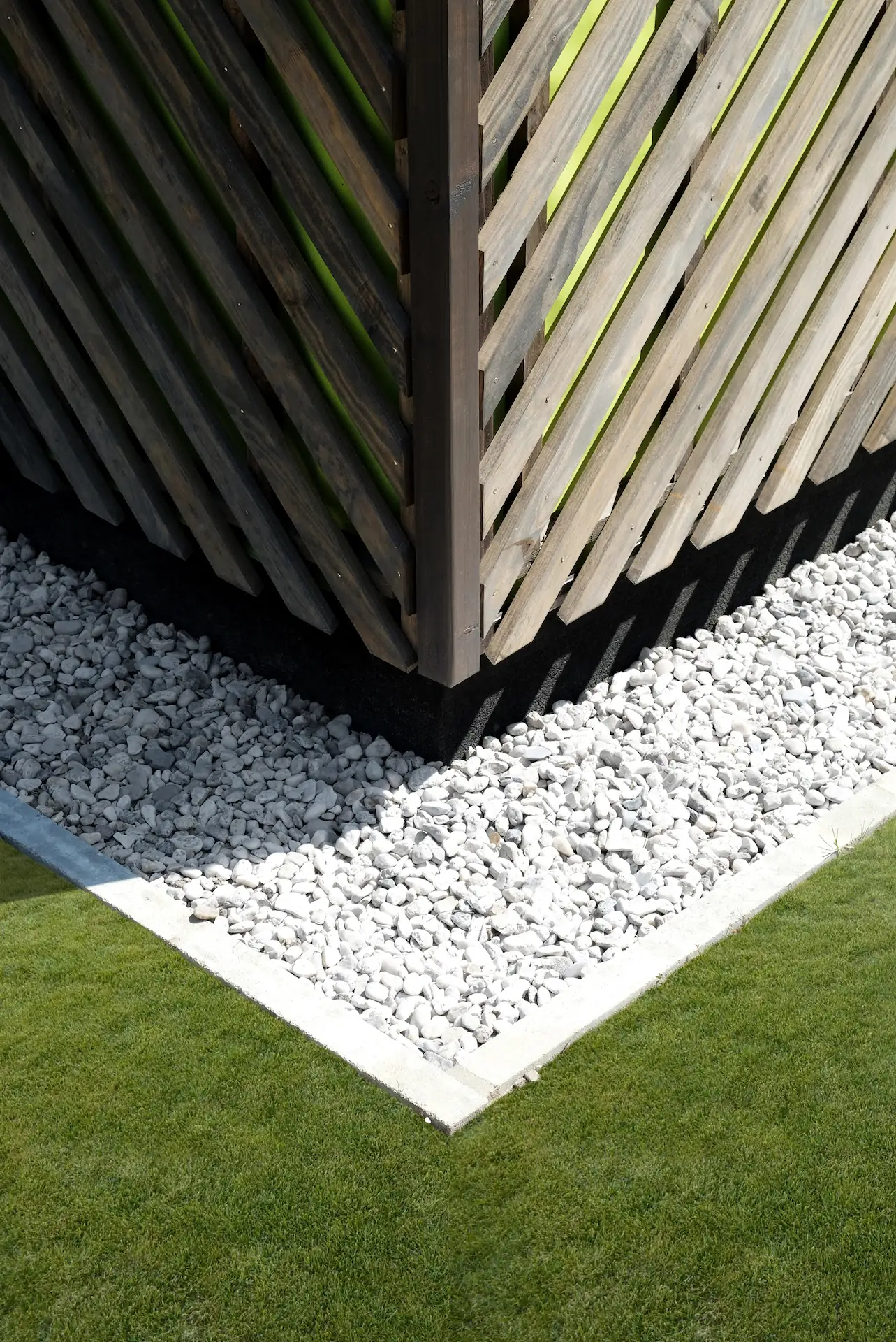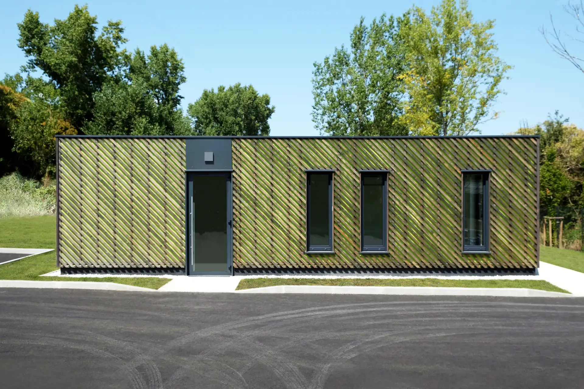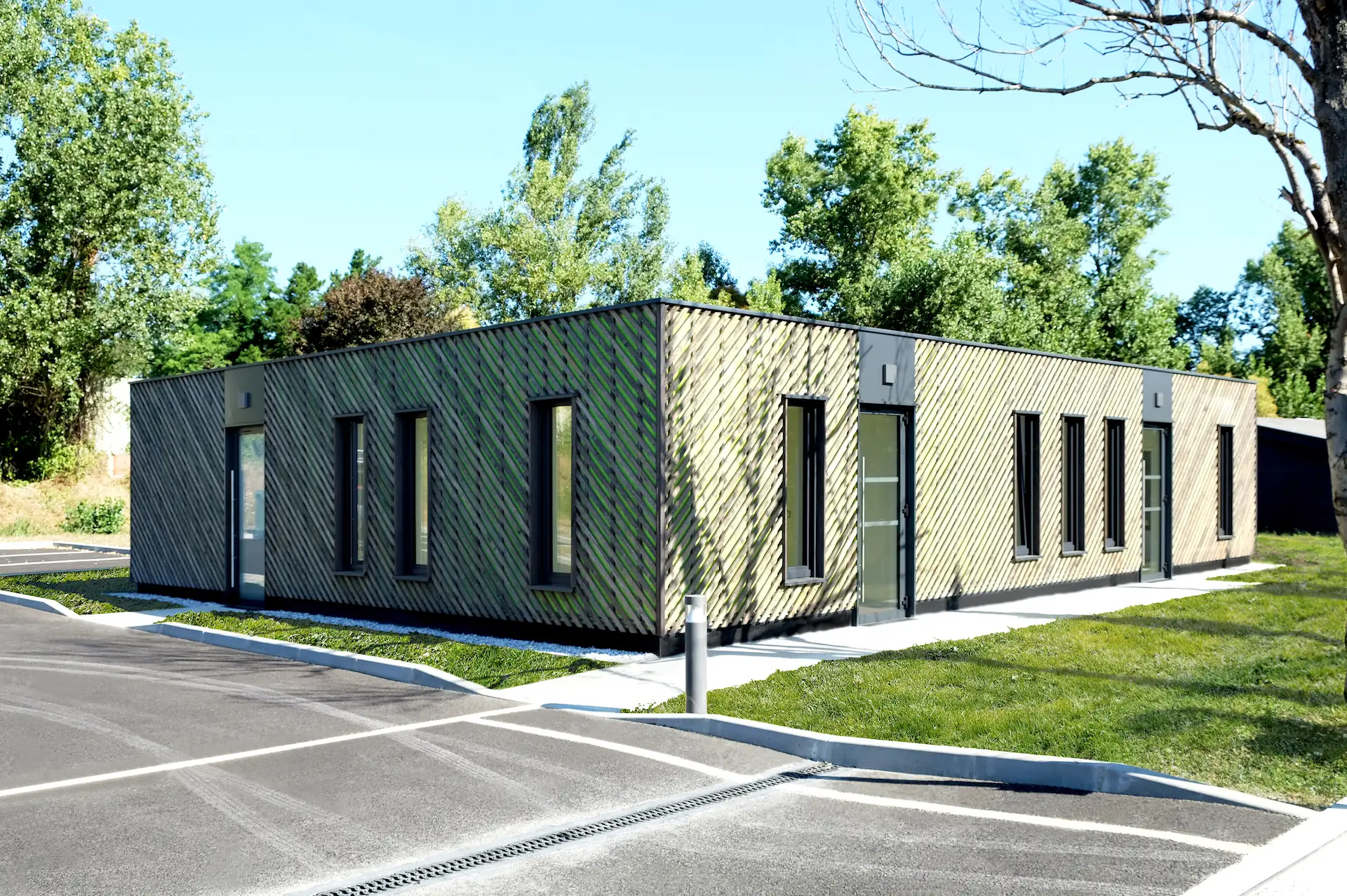 Sur fond de pare-pluie vert acide, l’ensemble joue visuellement avec la végétation environnante.