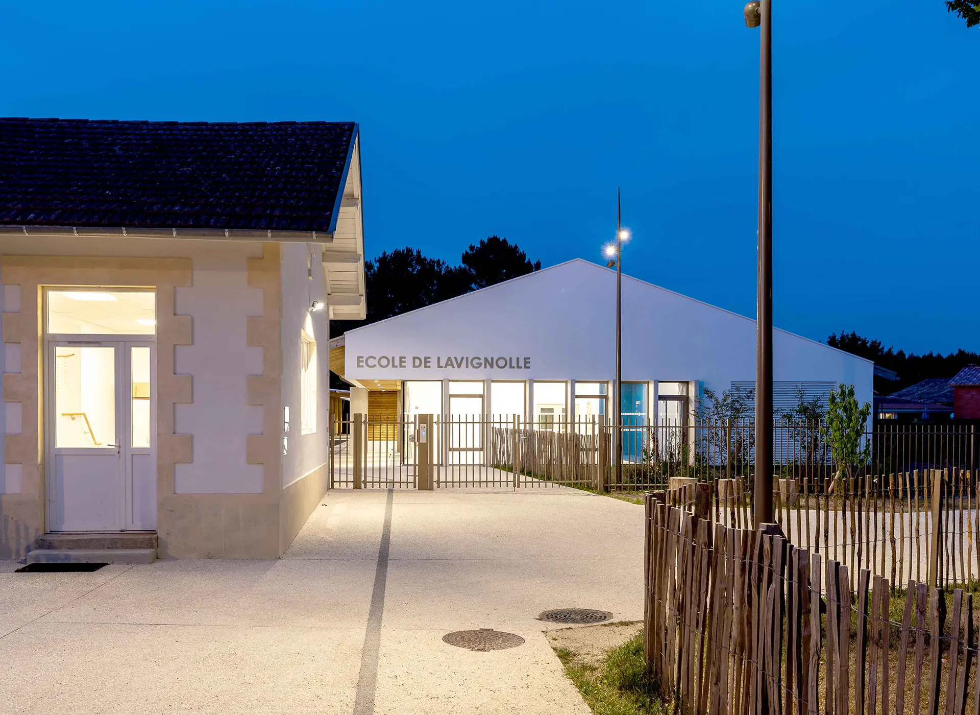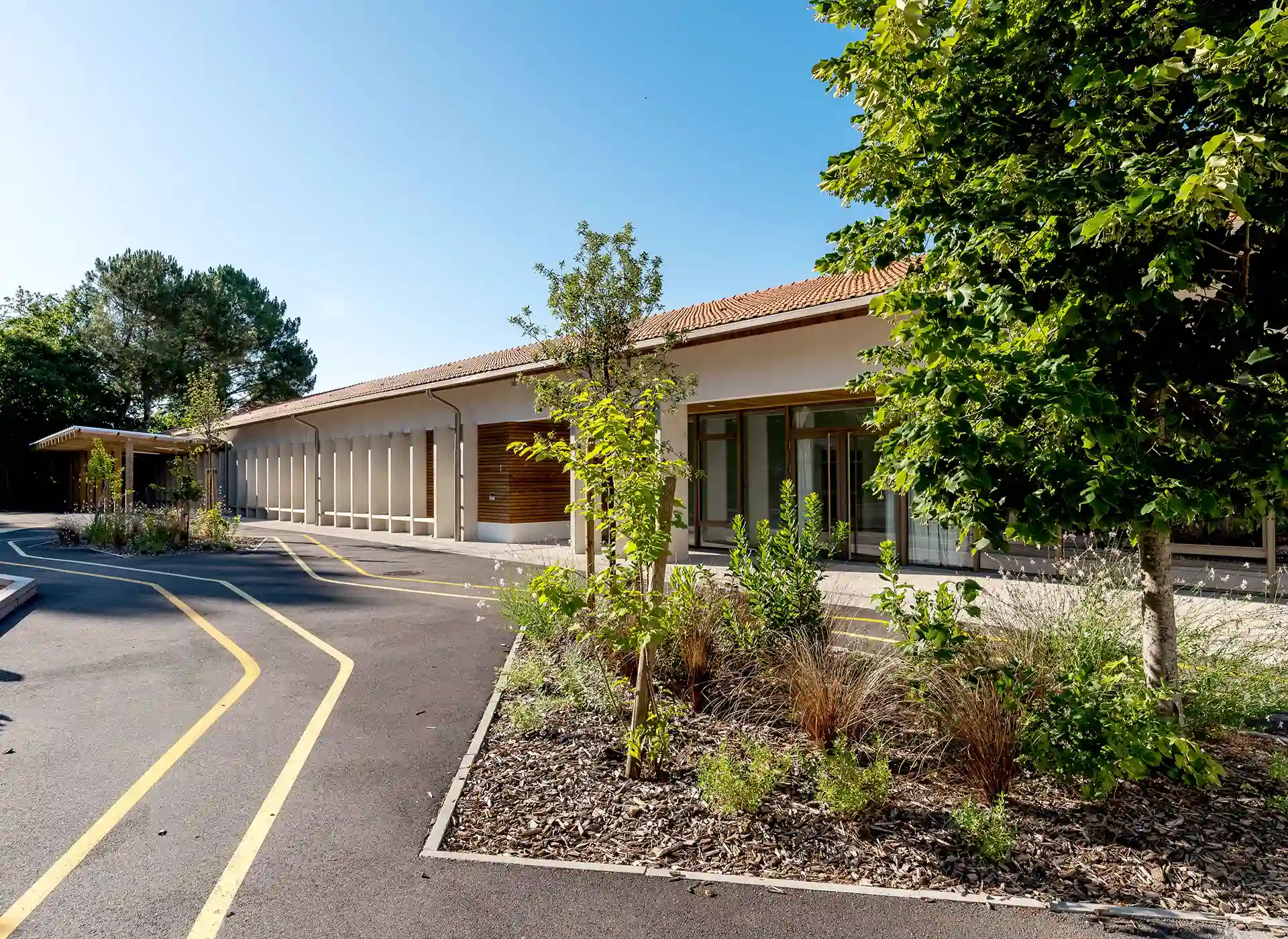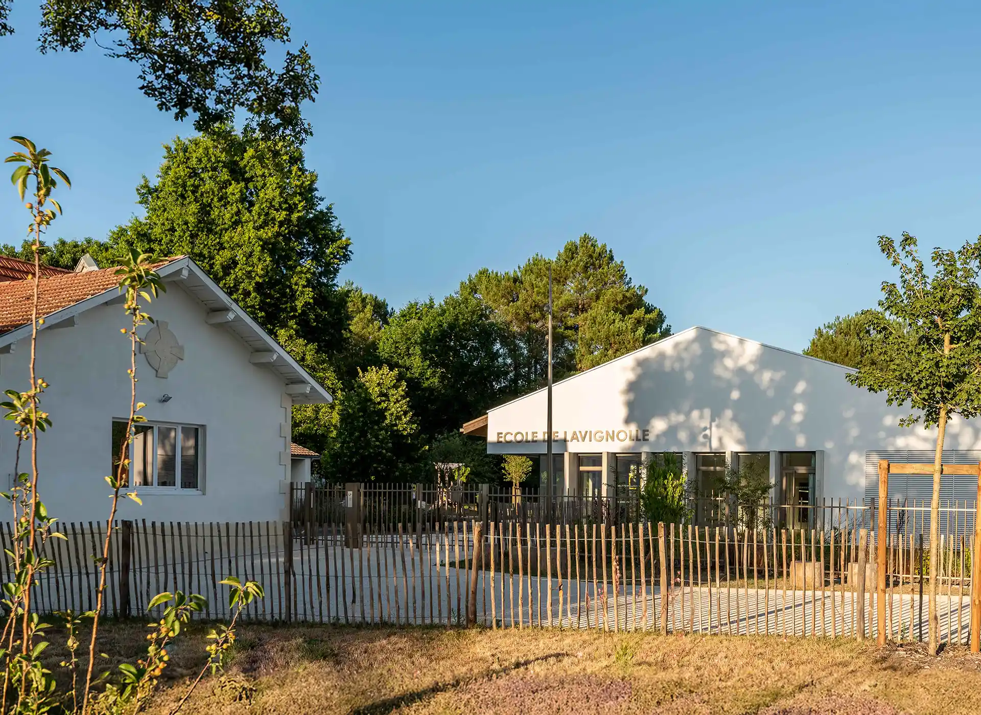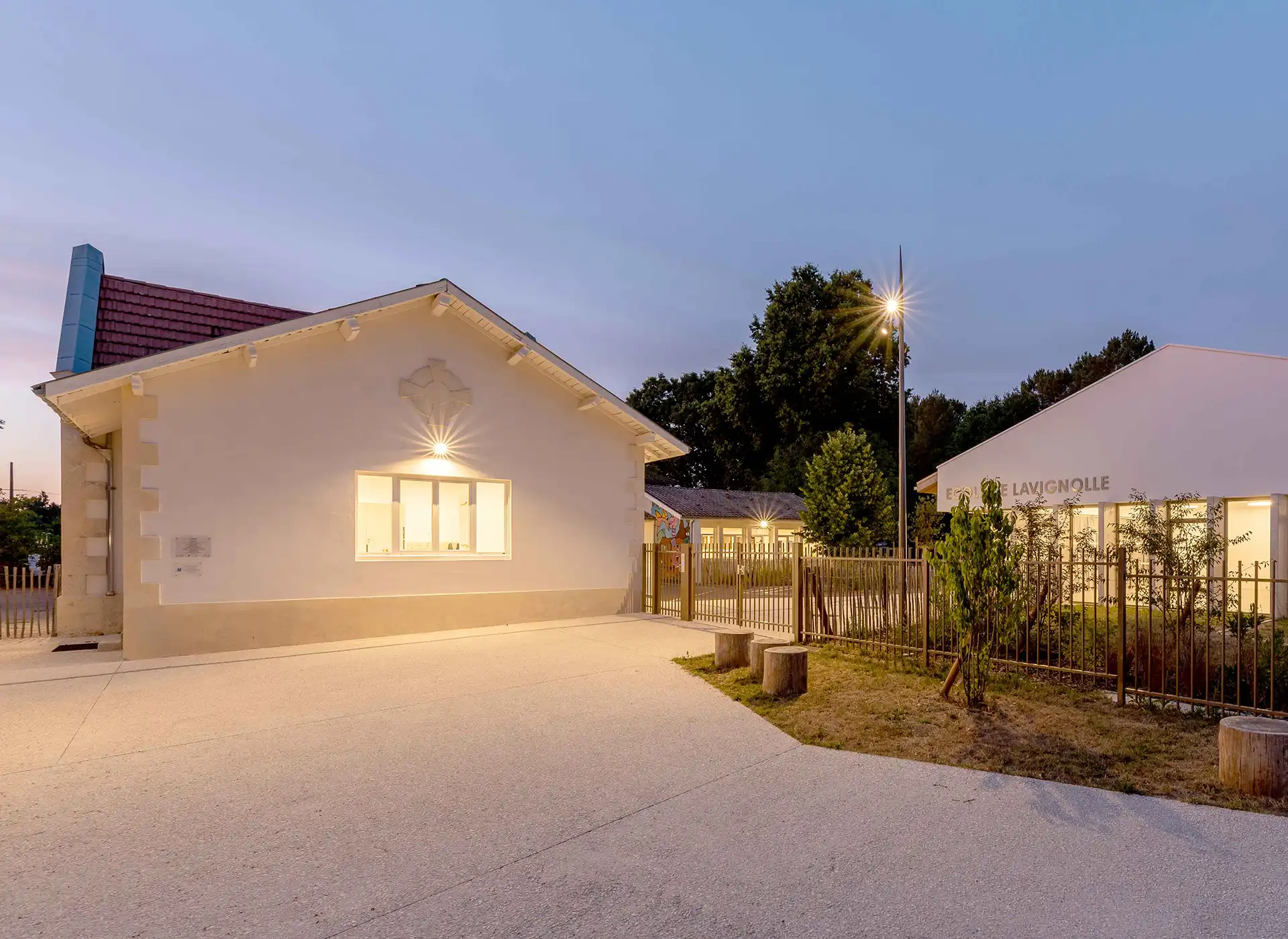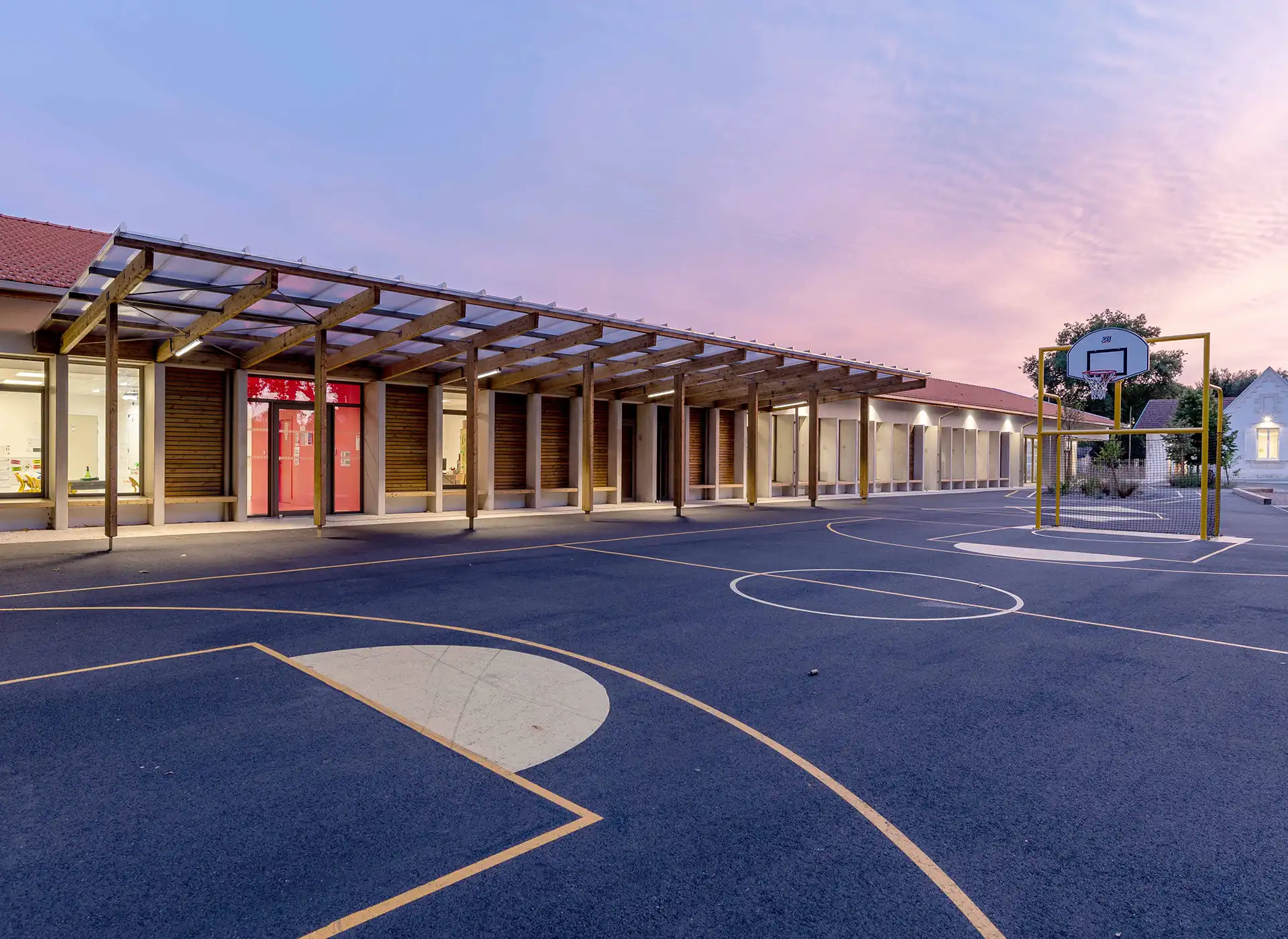 Ce projet s’inscrit dans un contexte marqué par une forte destructuration liée à l’accumulation de constructions préfabriquées et provisoires dans une cour entièrement imperméabilisée. L’intervention rend de la lisibilité à cet établissement à l’échelle familiale. Ainsi, un nouveau bâtiment linéaire, implanté au sud de la parcelle, regroupe l’ensemble des espaces pédagogiques et le pôle de restauration. En pignon ouest, une salle polyvalente mutualisable s’ouvre sur un parvis public. Le projet intègre également la réhabilitation du bâtiment historique de 1881, requalifié pour accueillir des espaces périscolaires . Enfin, La recomposition des espaces extérieurs aboutit à une cour unitaire dans une démarche de désimperméabilisation et de mise en relation avec la lisière forestière voisine.