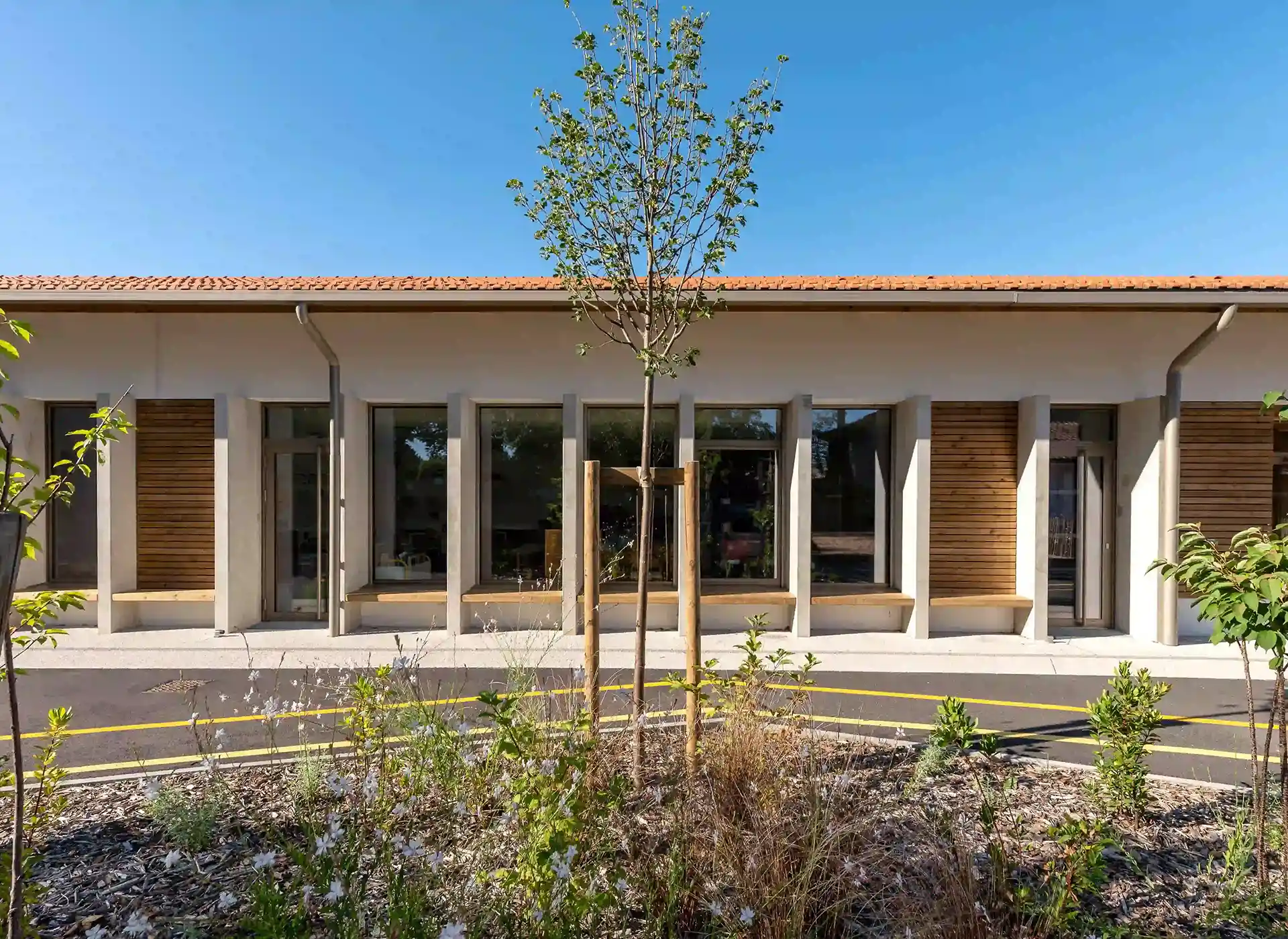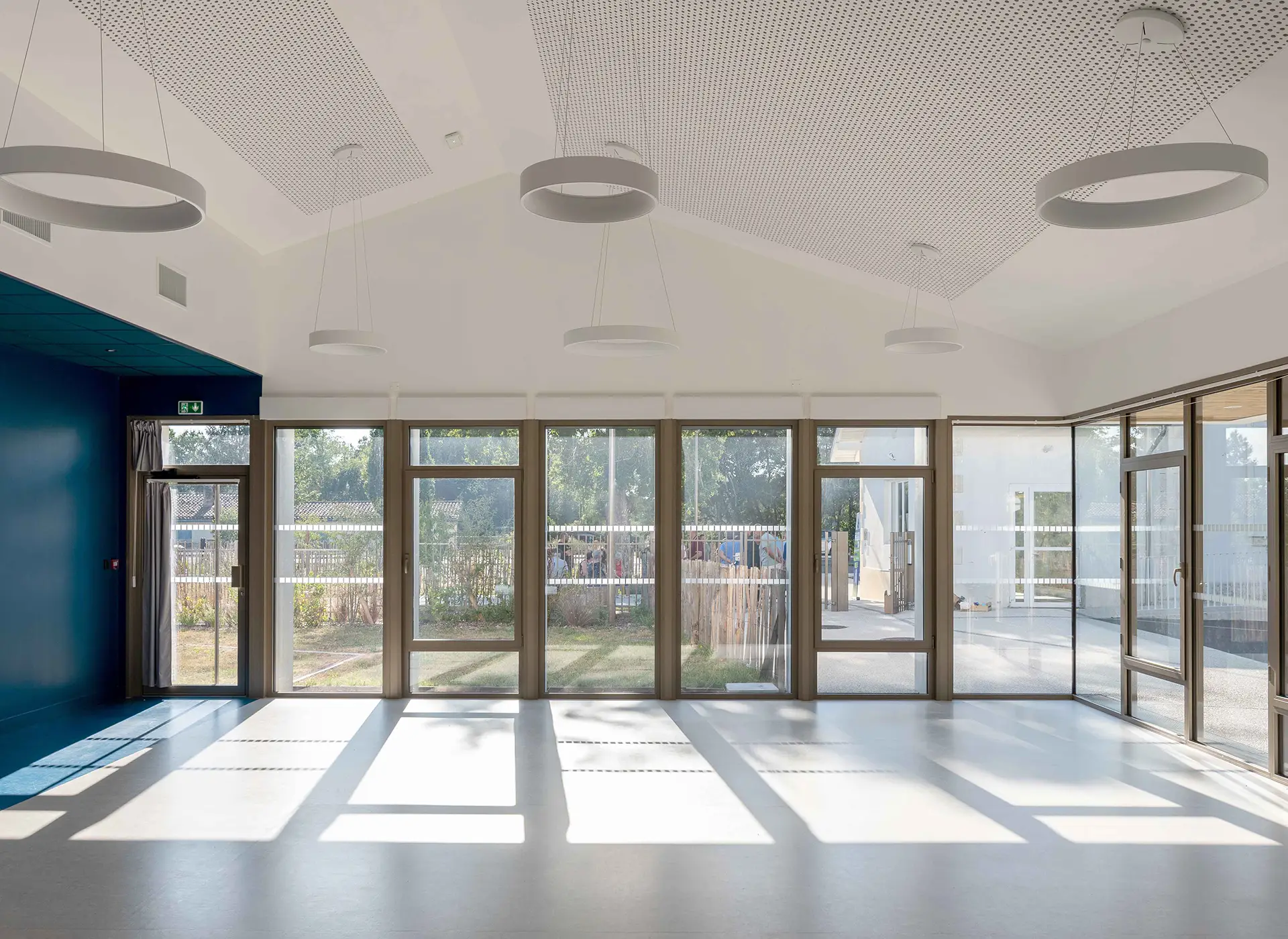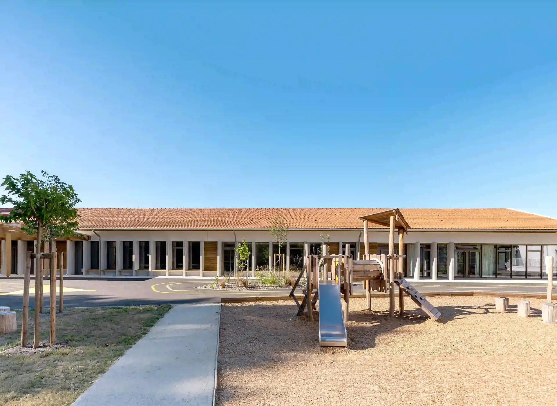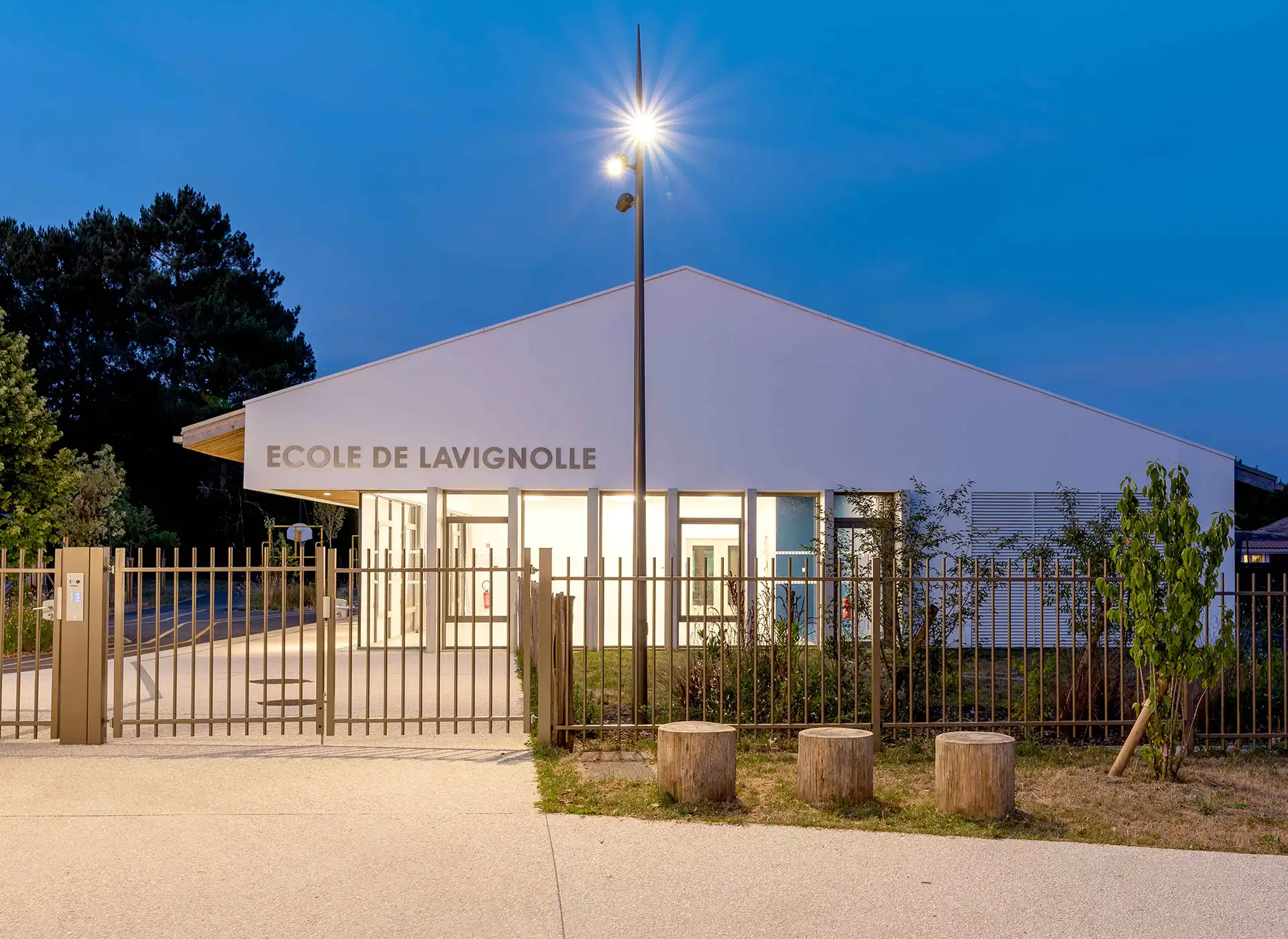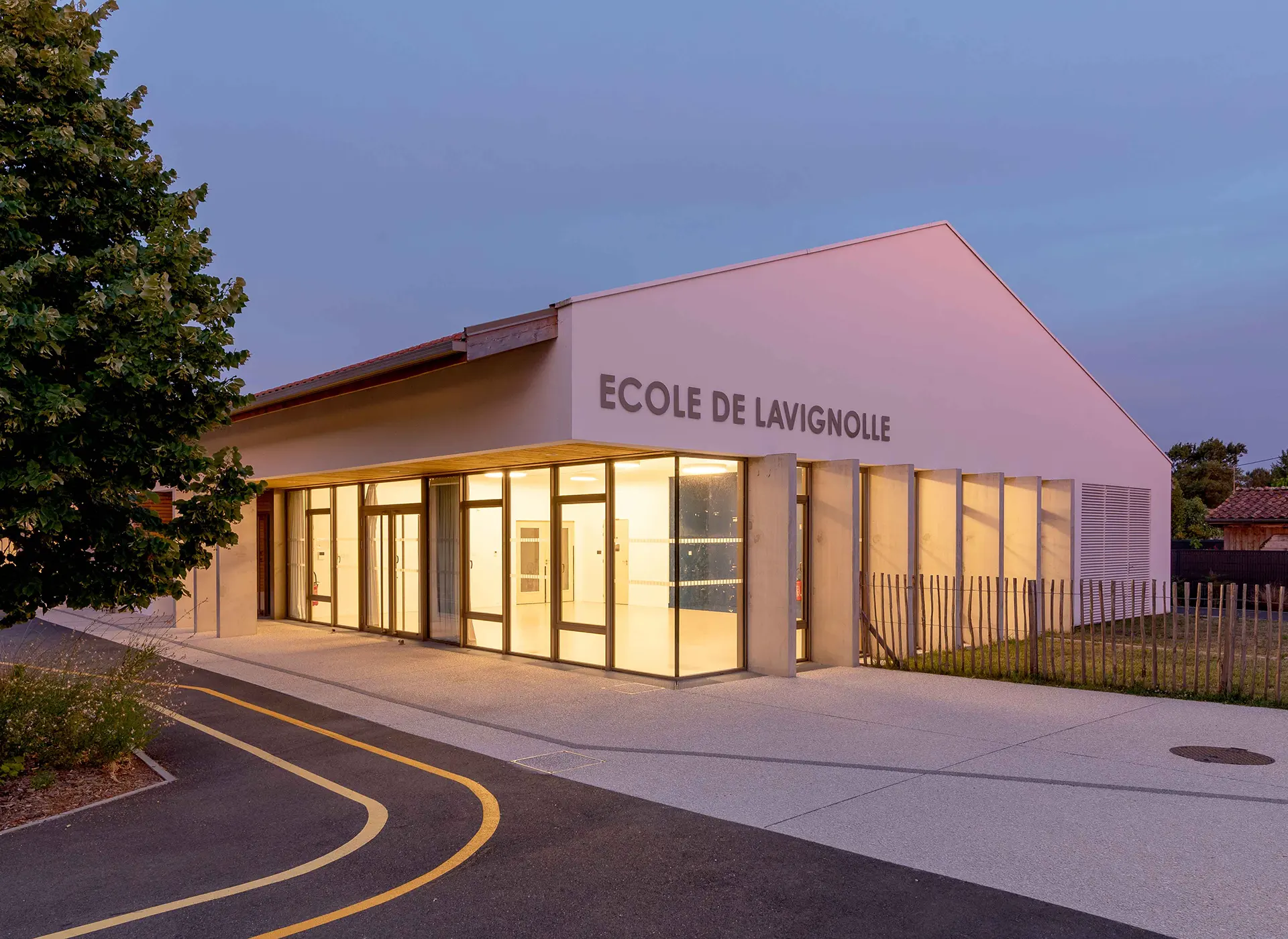 Ce projet s’inscrit dans un contexte marqué par une forte destructuration liée à l’accumulation de constructions préfabriquées et provisoires dans une cour entièrement imperméabilisée. L’intervention rend de la lisibilité à cet établissement à l’échelle familiale. Ainsi, un nouveau bâtiment linéaire, implanté au sud de la parcelle, regroupe l’ensemble des espaces pédagogiques et le pôle de restauration. En pignon ouest, une salle polyvalente mutualisable s’ouvre sur un parvis public. Le projet intègre également la réhabilitation du bâtiment historique de 1881, requalifié pour accueillir des espaces périscolaires . Enfin, La recomposition des espaces extérieurs aboutit à une cour unitaire dans une démarche de désimperméabilisation et de mise en relation avec la lisière forestière voisine.