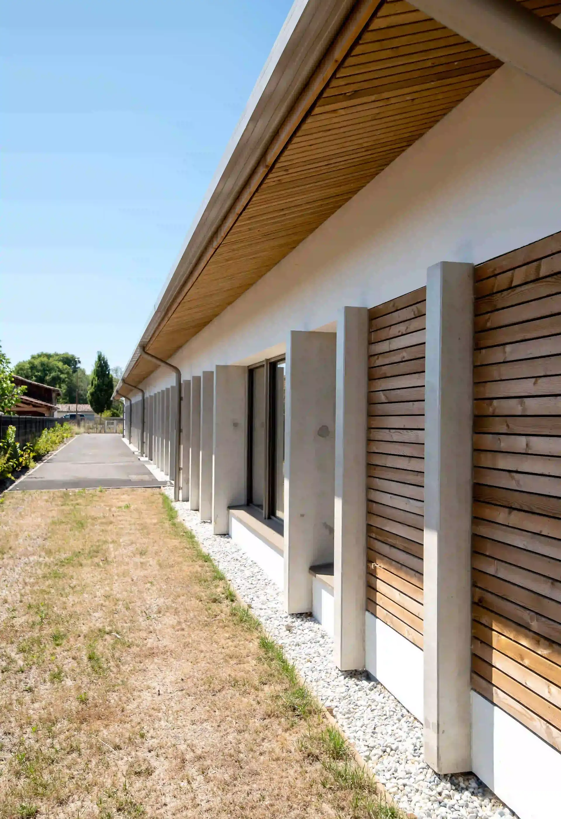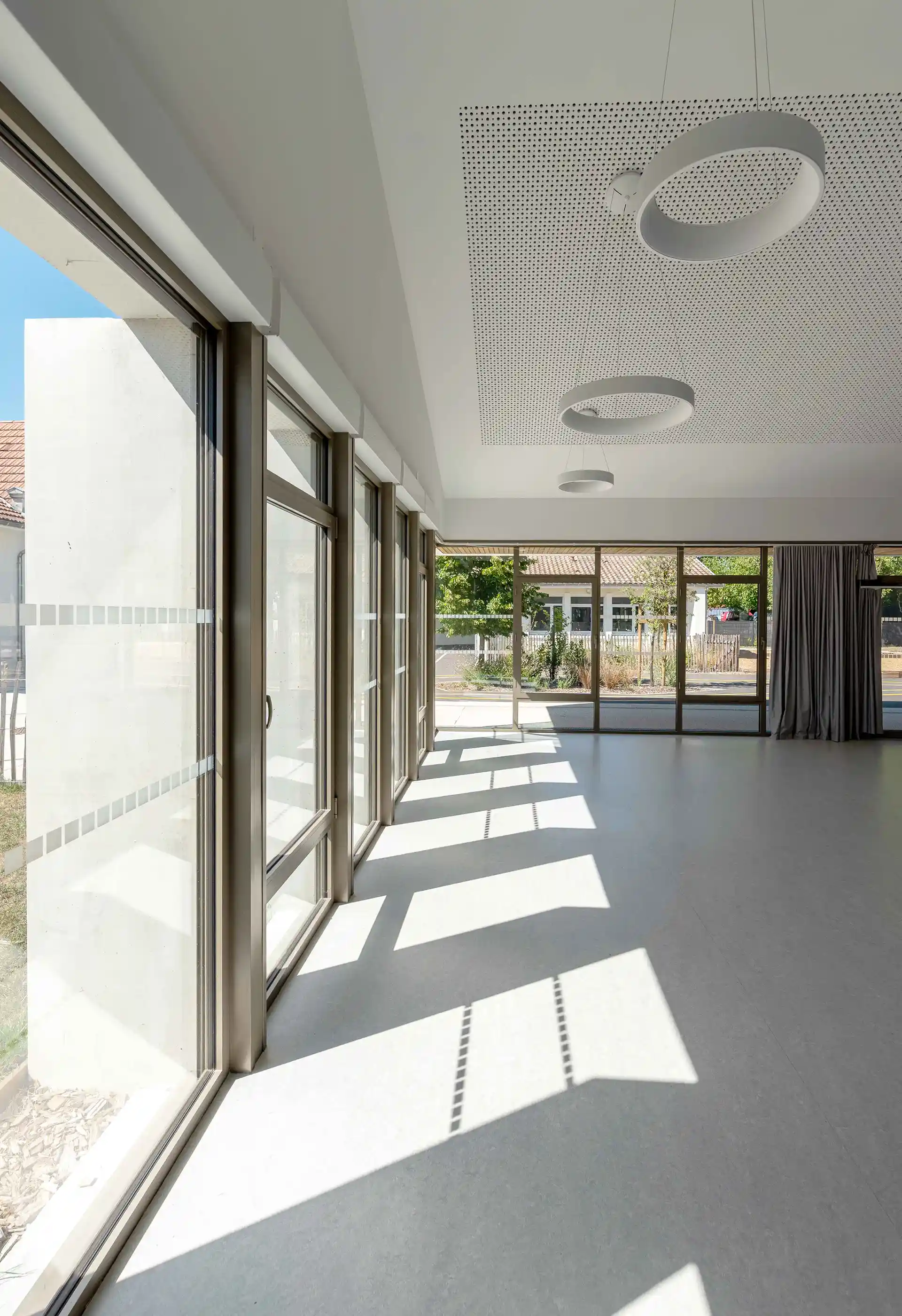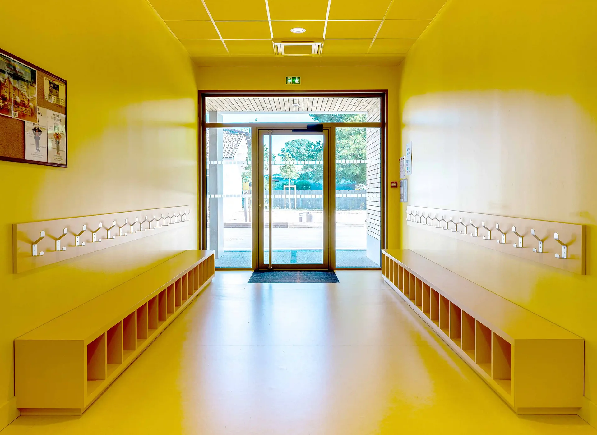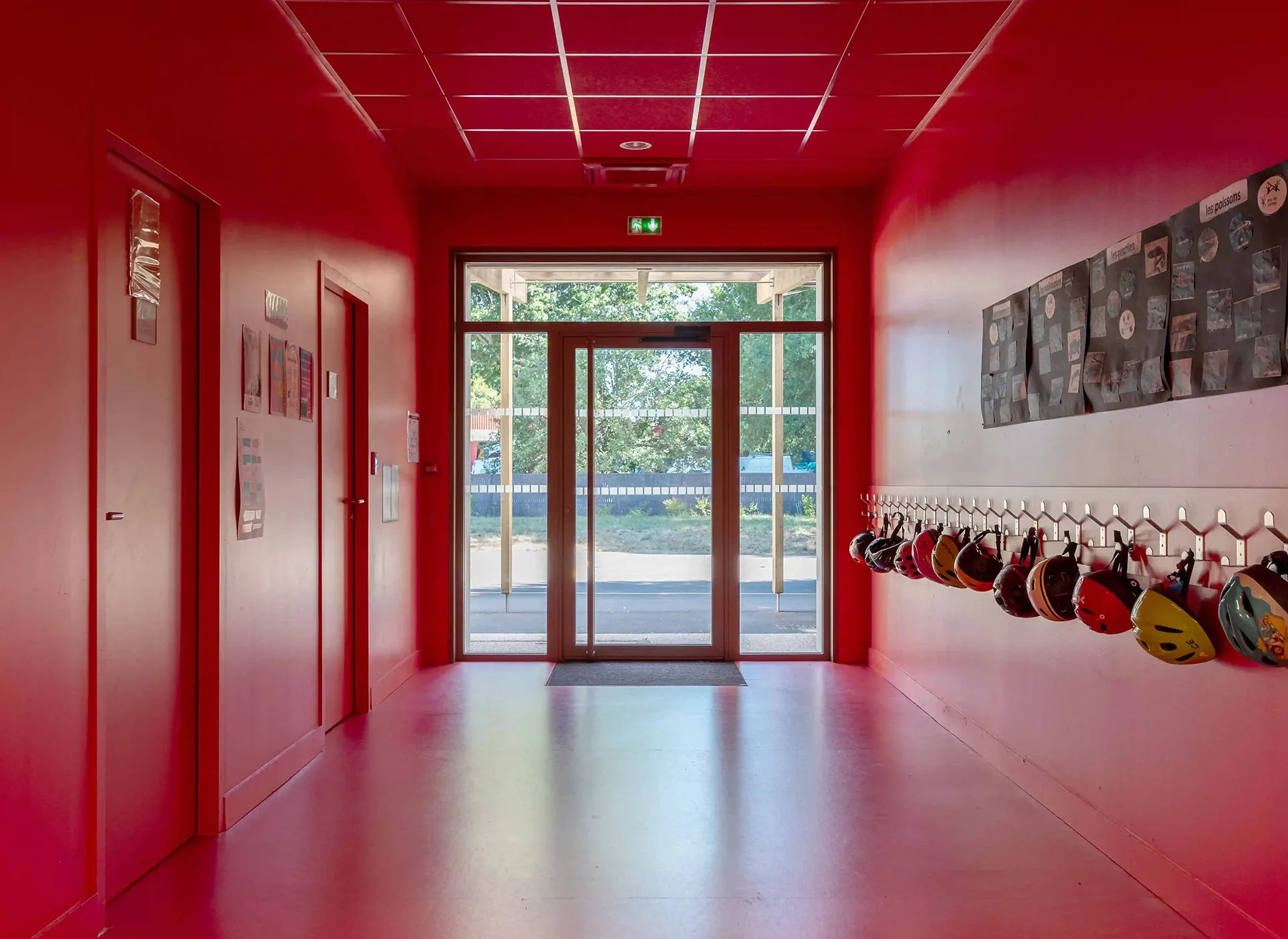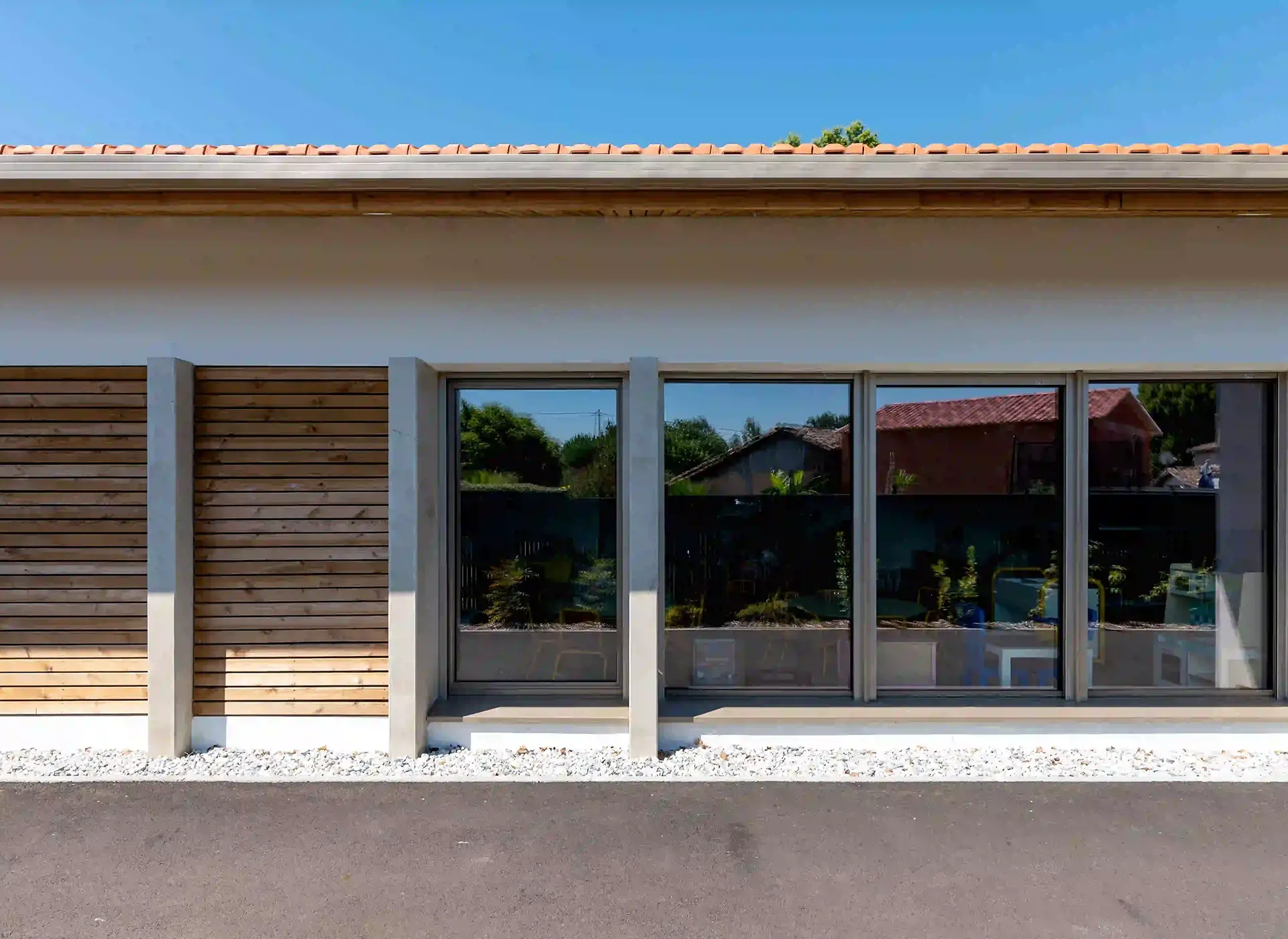 Ce projet s’inscrit dans un contexte marqué par une forte destructuration liée à l’accumulation de constructions préfabriquées et provisoires dans une cour entièrement imperméabilisée. L’intervention rend de la lisibilité à cet établissement à l’échelle familiale. Ainsi, un nouveau bâtiment linéaire, implanté au sud de la parcelle, regroupe l’ensemble des espaces pédagogiques et le pôle de restauration. En pignon ouest, une salle polyvalente mutualisable s’ouvre sur un parvis public. Le projet intègre également la réhabilitation du bâtiment historique de 1881, requalifié pour accueillir des espaces périscolaires . Enfin, La recomposition des espaces extérieurs aboutit à une cour unitaire dans une démarche de désimperméabilisation et de mise en relation avec la lisière forestière voisine.