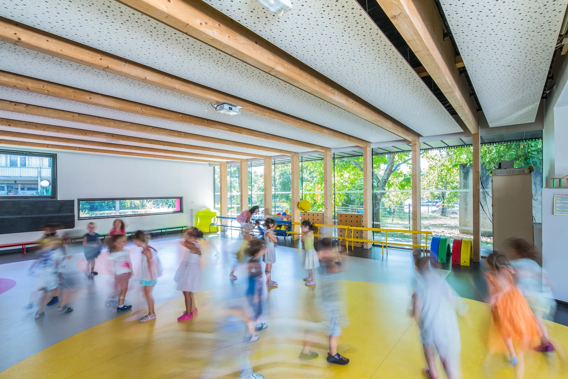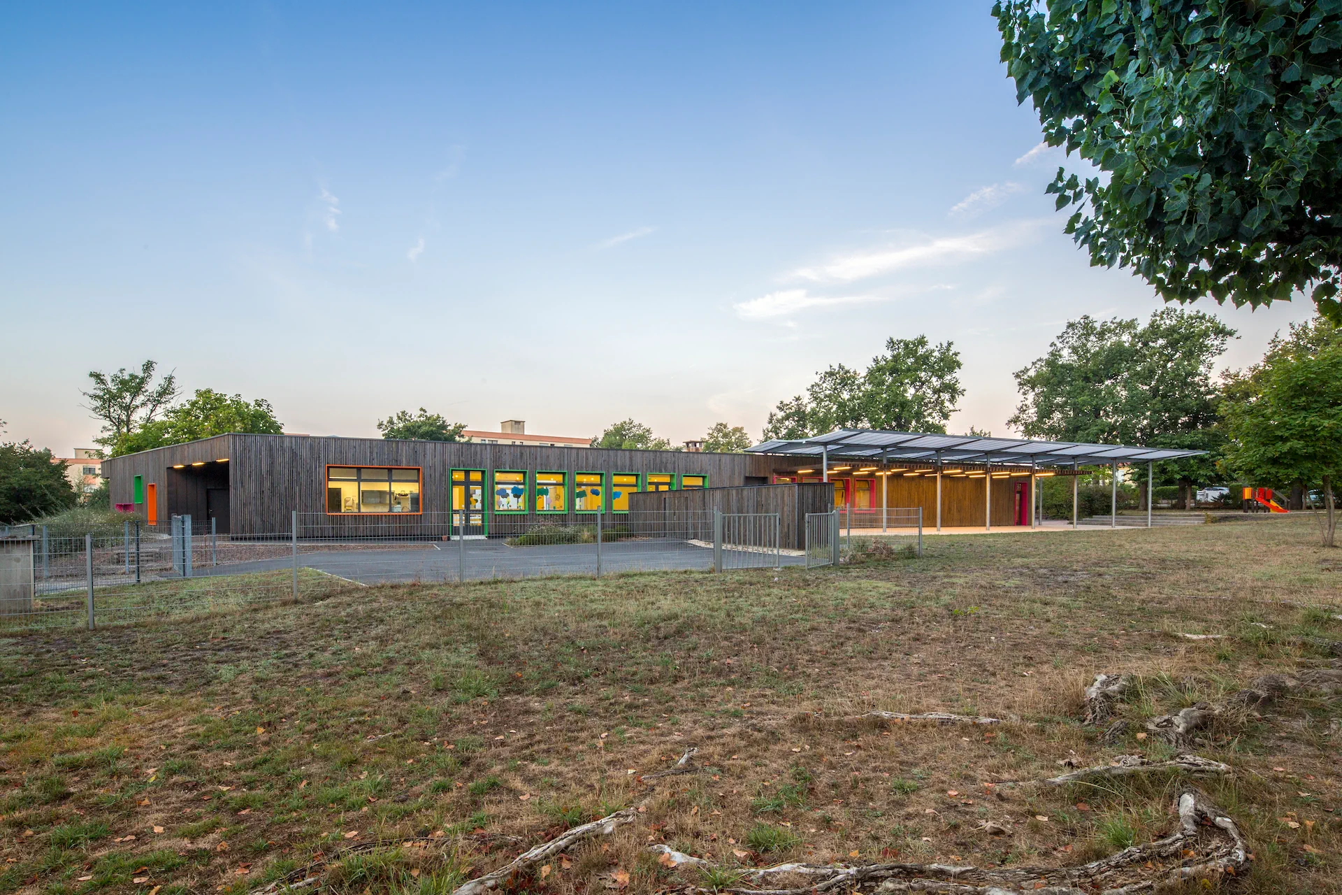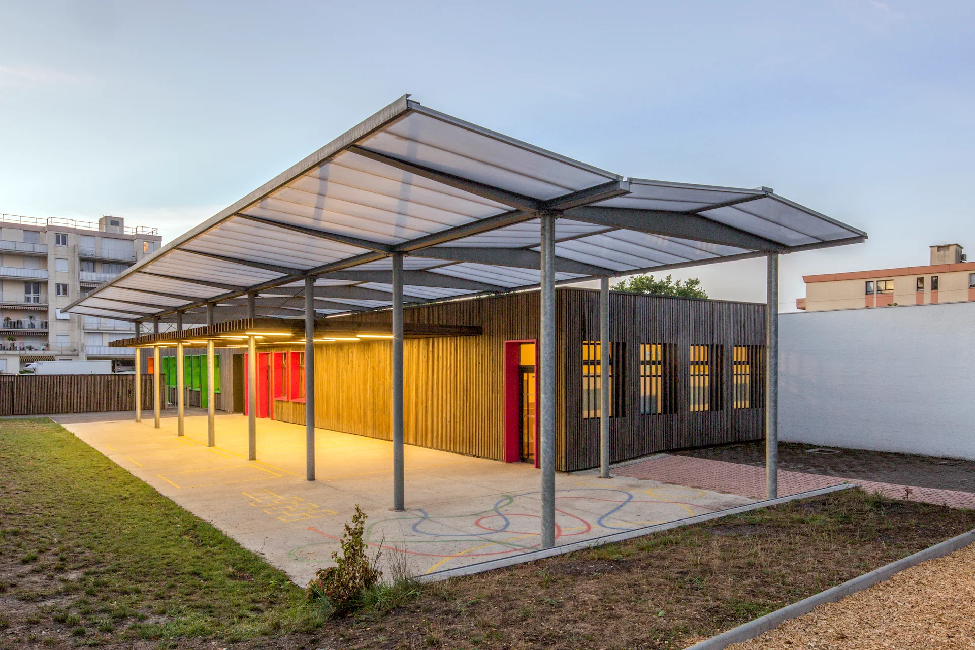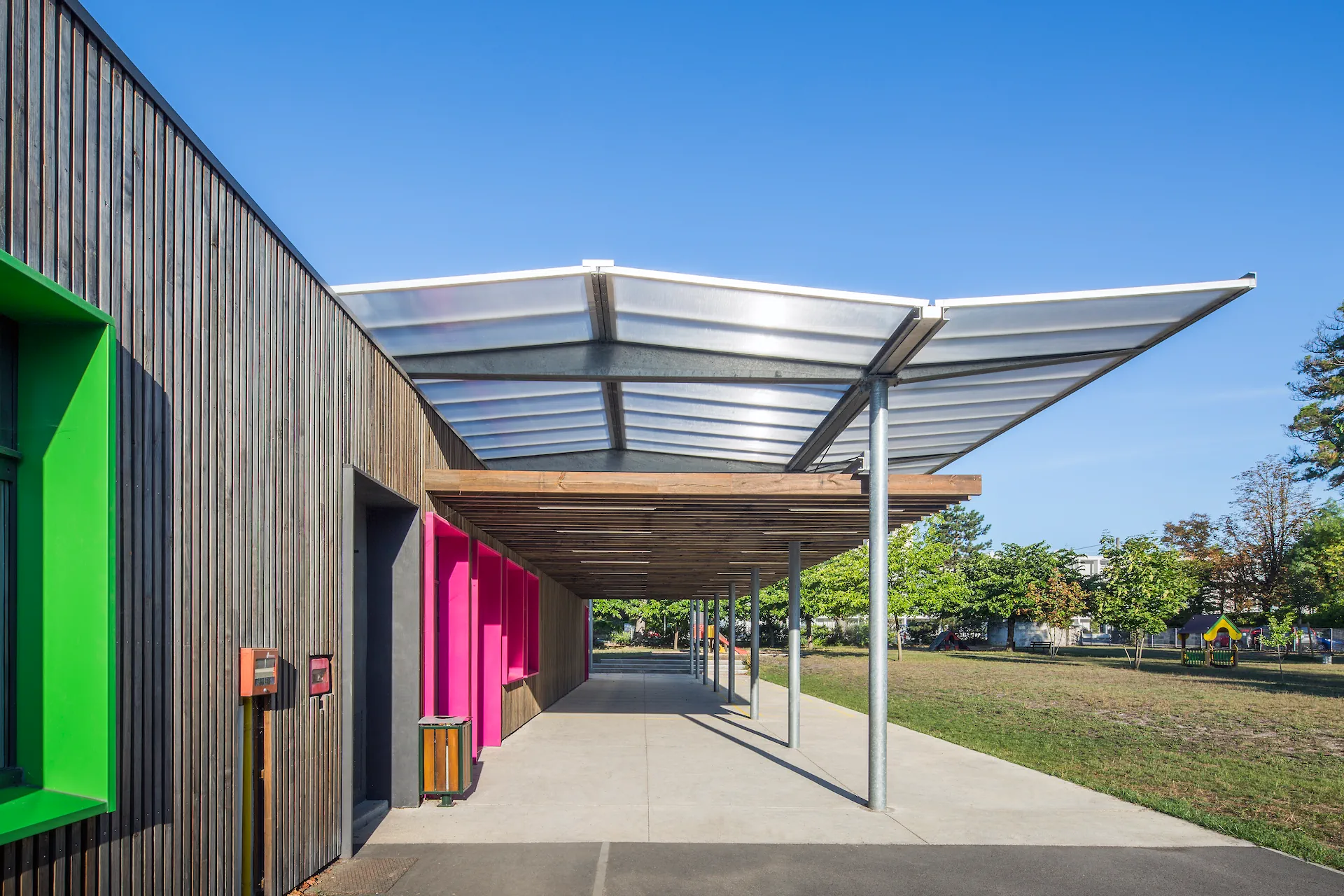 L’école s’ouvre enfin sur son parc, par la construction d’un vaste préau de 200m².