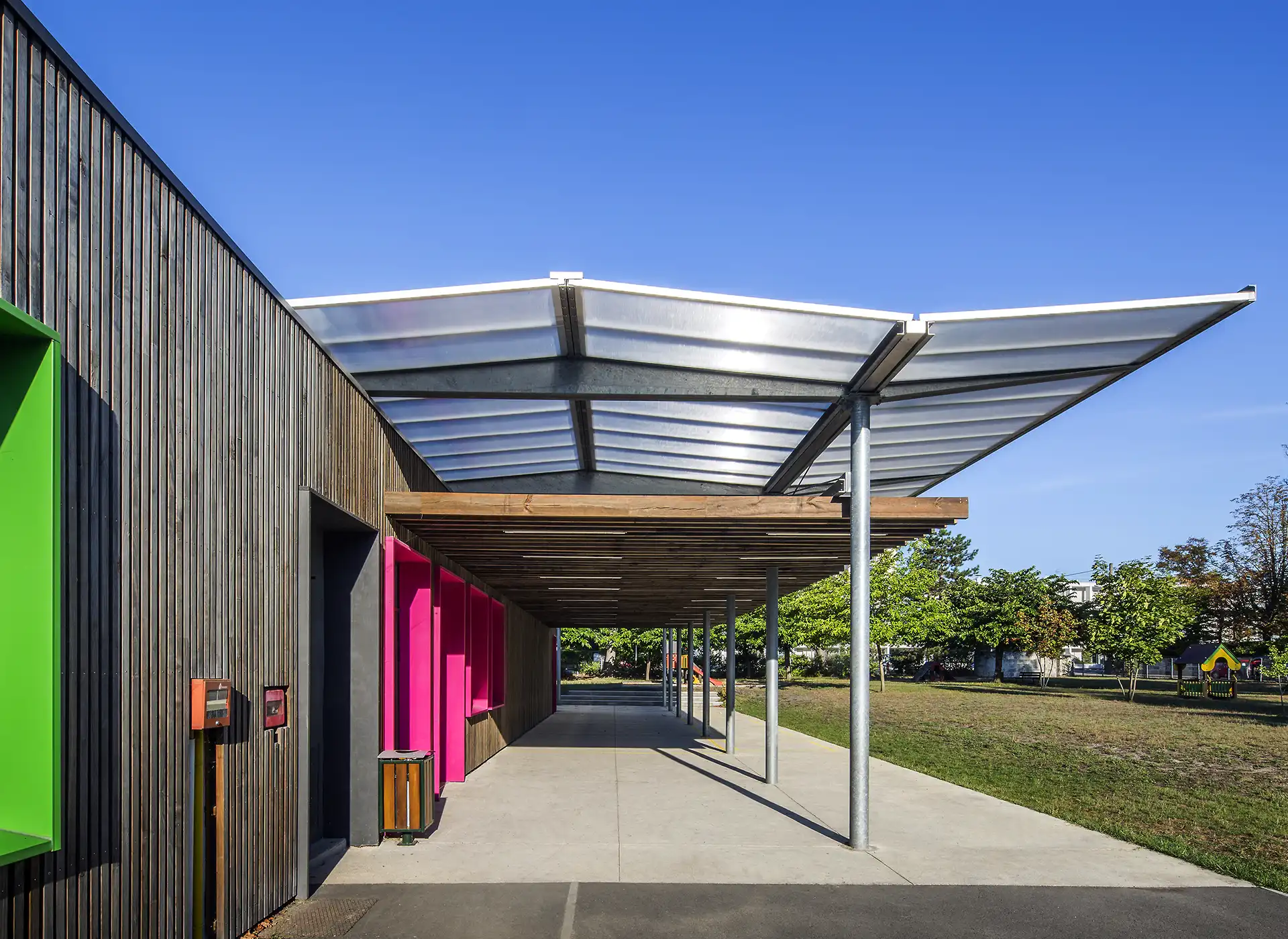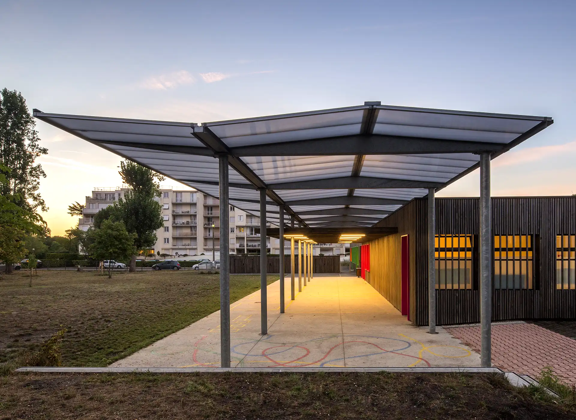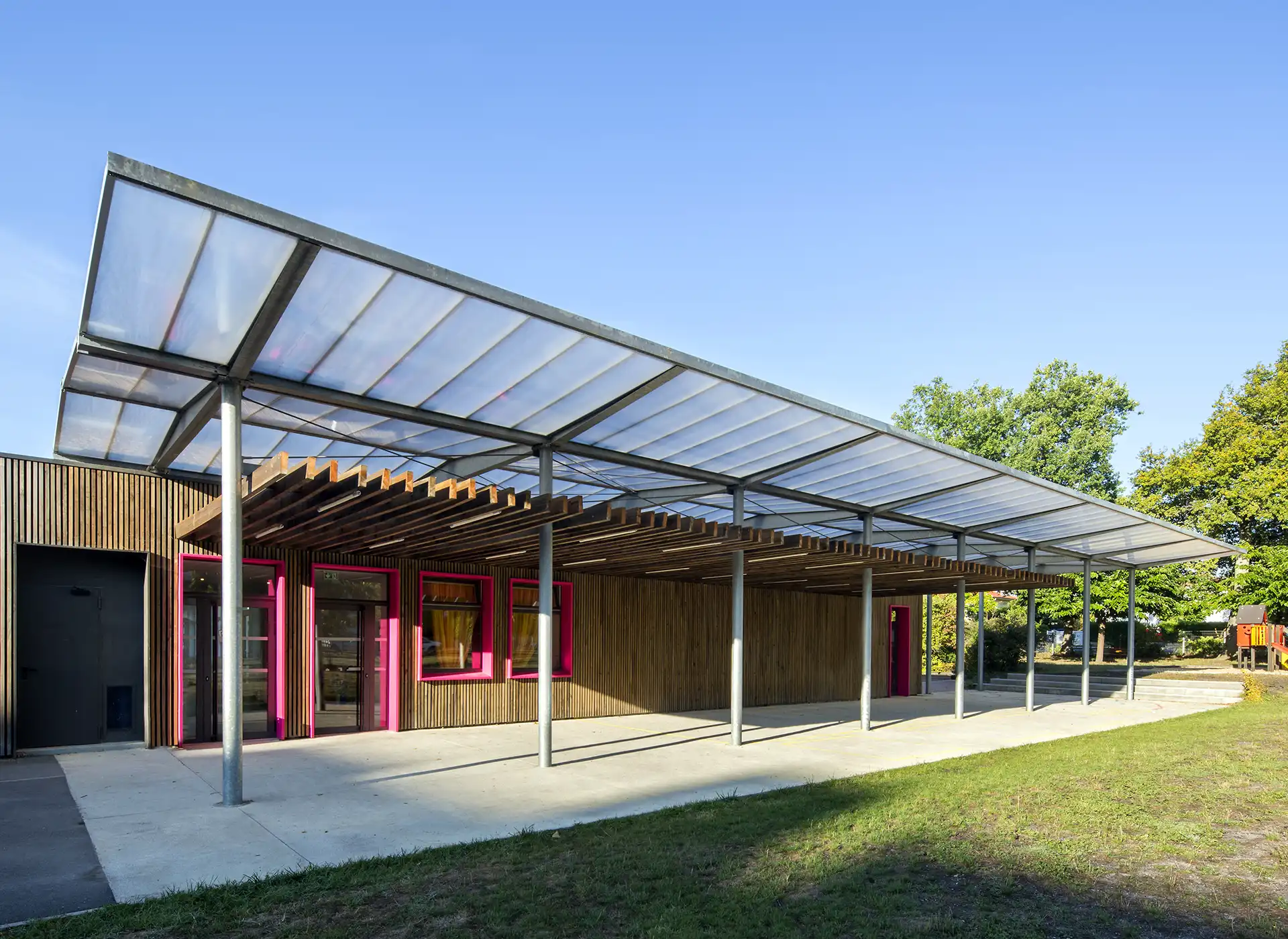 L’extension, qui intègre principalement une vaste salle de motricité et la nouvelle cuisine, est implantée parallèlement à la rue du Parc. Elle articule le nouveau fonctionnement de l’établissement autour d’un second patio, pendant d’un patio préexistant. Les aménagements paysagers de ces derniers sont traités de façon différenciée (minéral et végétal), leur conférant un rôle de repères spatiaux pour les enfants. Au nord, l’école s’ouvre enfin sur son parc, par la construction d’un vaste préau de 200m² constitué d’une charpente d’acier couverte de polycarbonate translucide.