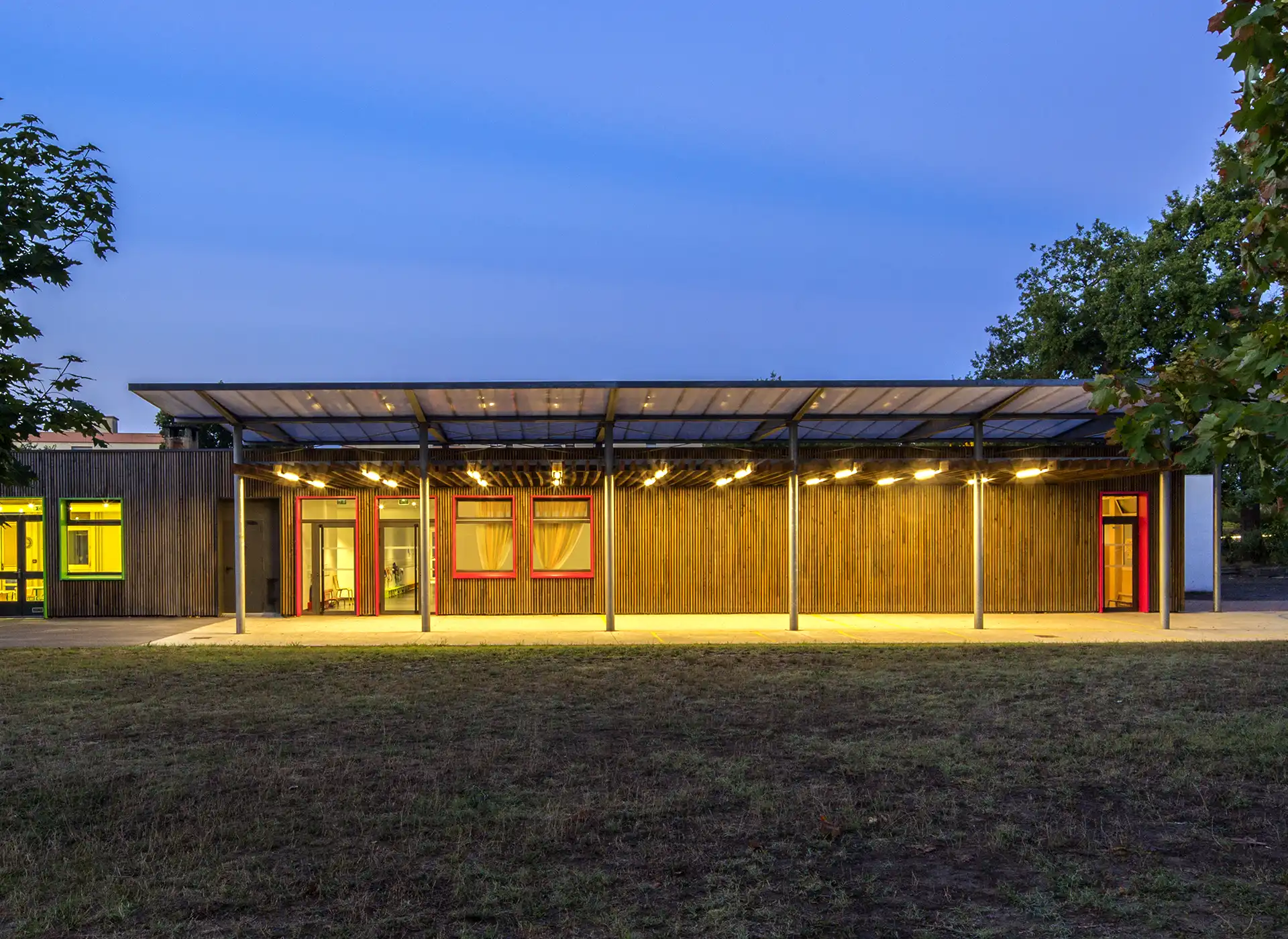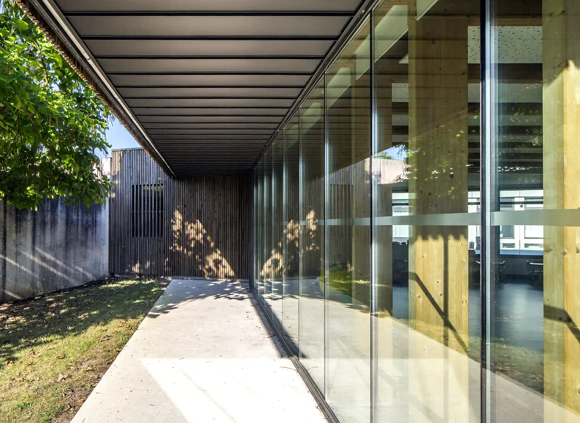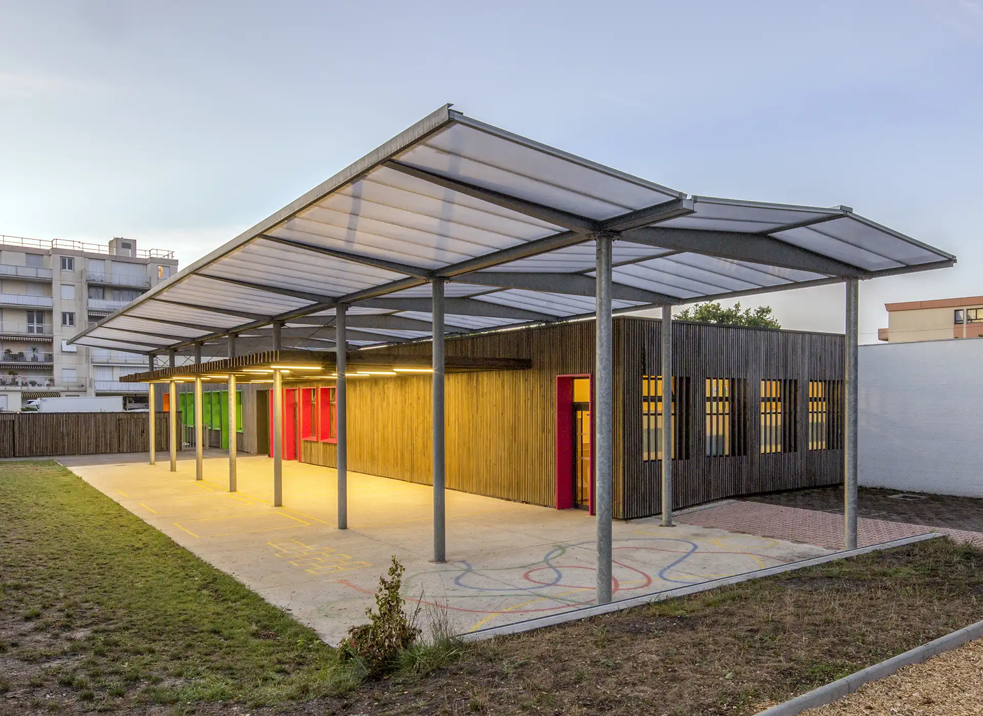 L’extension, qui intègre principalement une vaste salle de motricité et la nouvelle cuisine, est implantée parallèlement à la rue du Parc. Elle articule le nouveau fonctionnement de l’établissement autour d’un second patio, pendant d’un patio préexistant. Les aménagements paysagers de ces derniers sont traités de façon différenciée (minéral et végétal), leur conférant un rôle de repères spatiaux pour les enfants. Au nord, l’école s’ouvre enfin sur son parc, par la construction d’un vaste préau de 200m² constitué d’une charpente d’acier couverte de polycarbonate translucide.