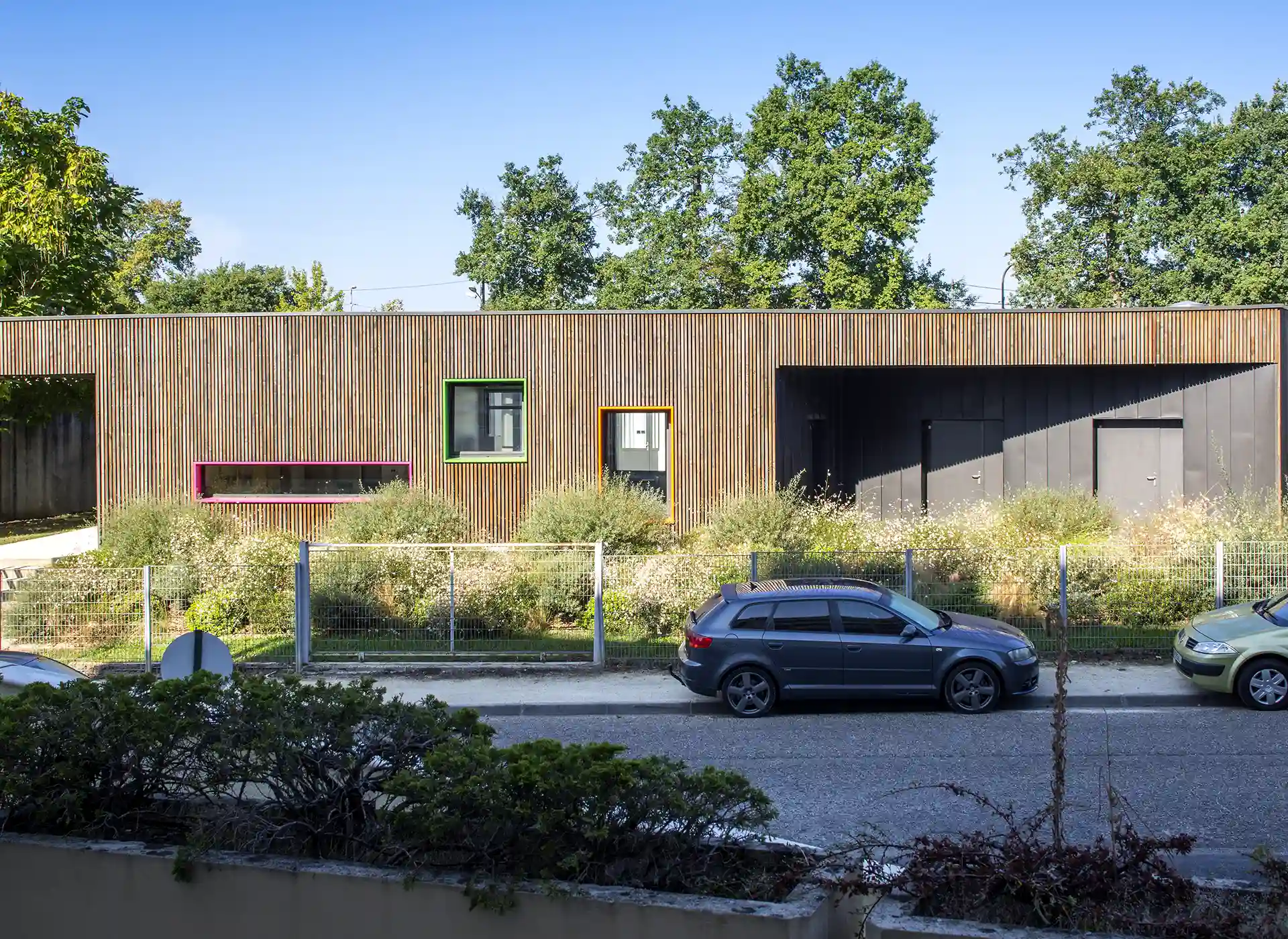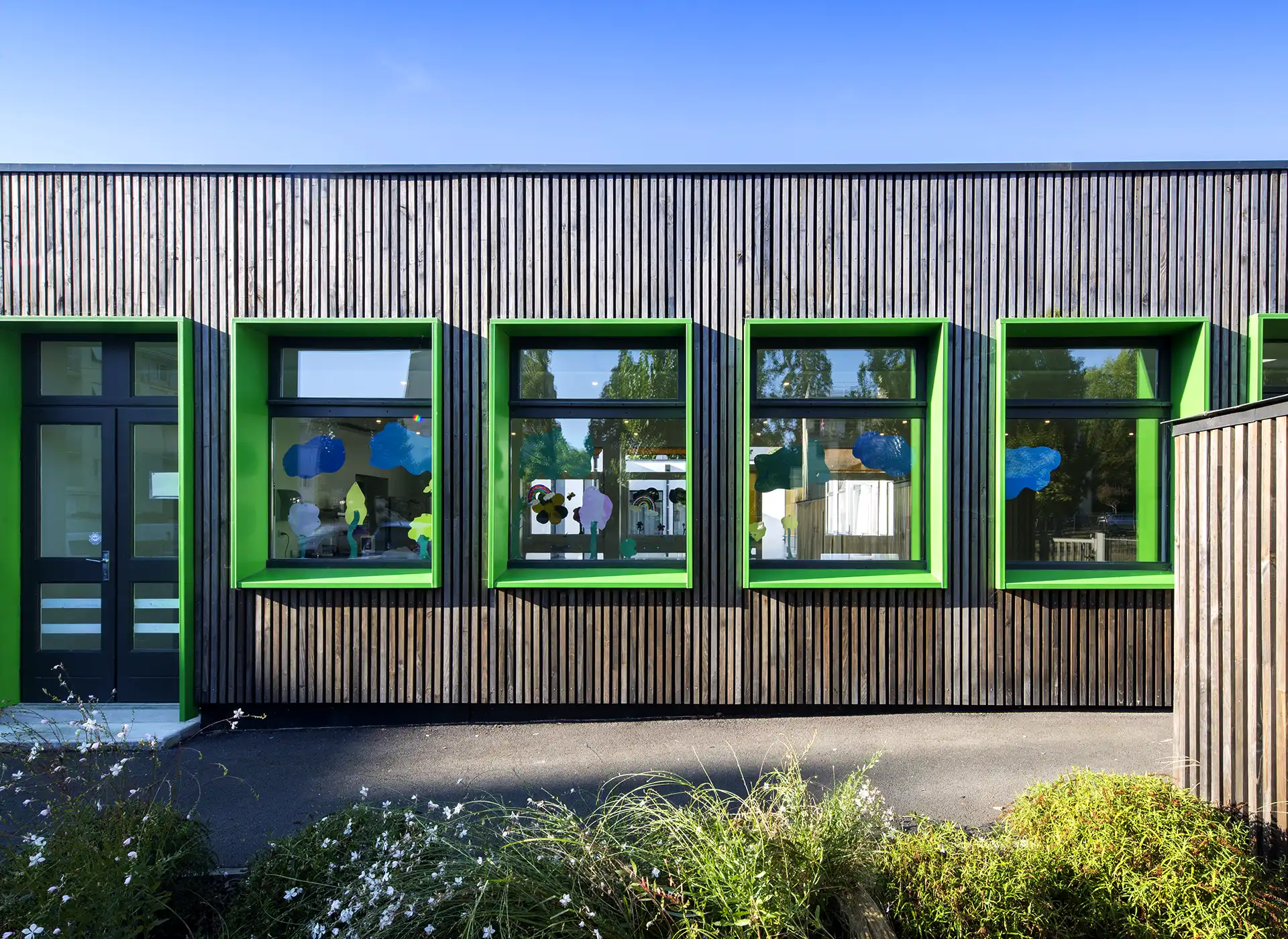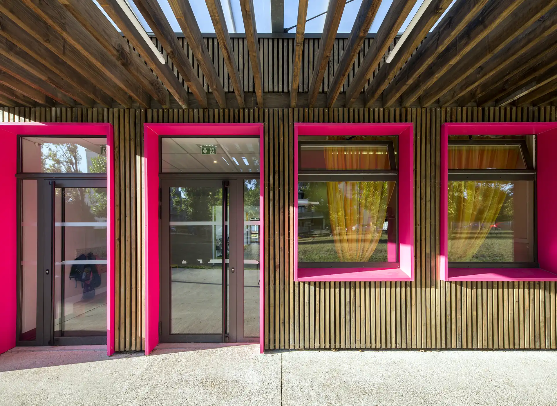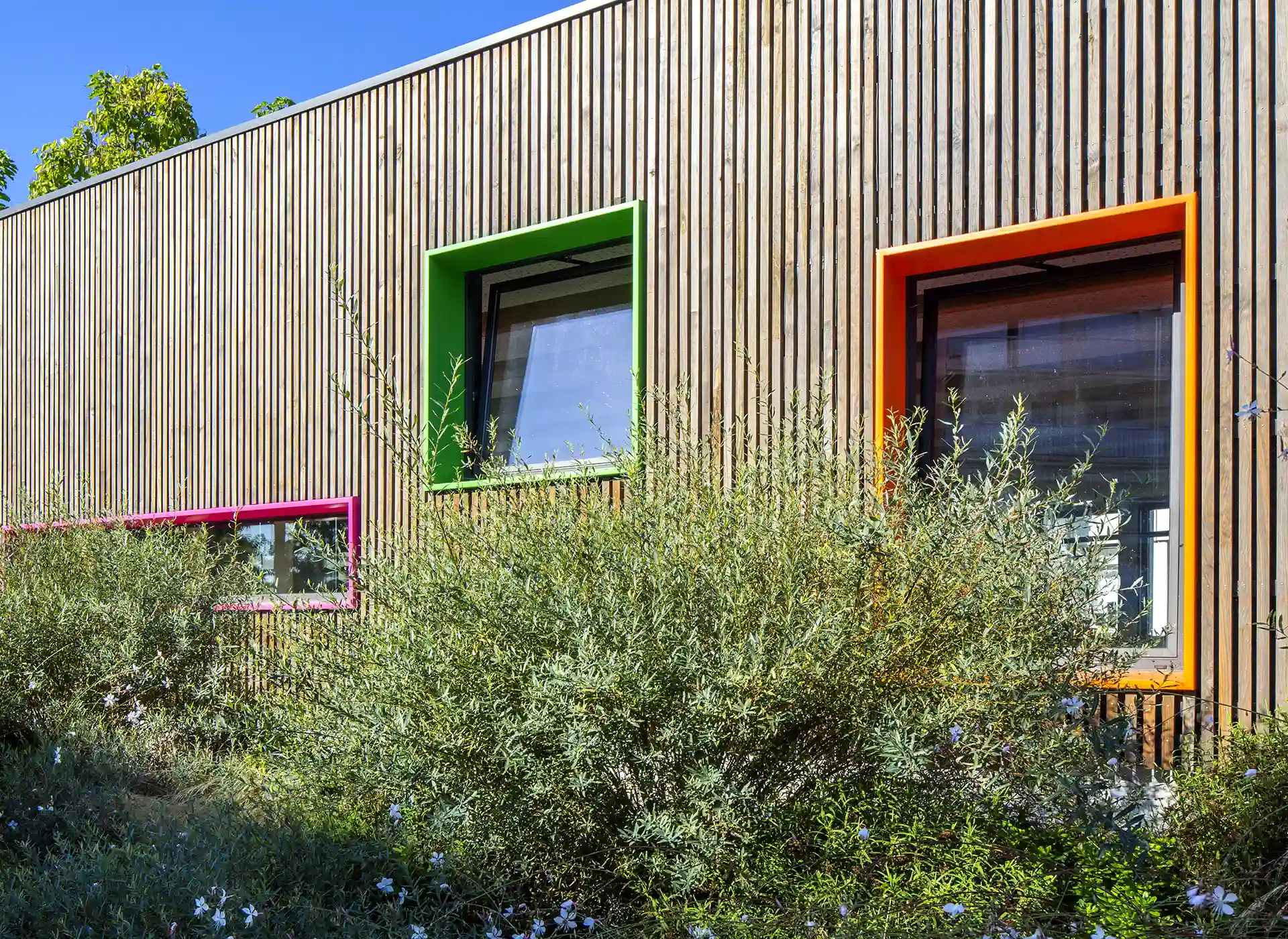 L’image de l’école dans le quartier est profondément refondue, par l’application sur certaines façades d’une ITE protégée par une vêture en bois des landes, et de grands cadres colorés marquant les baies.