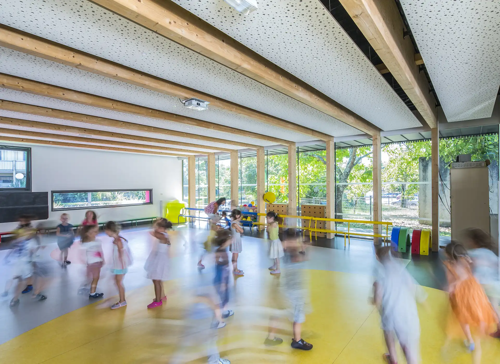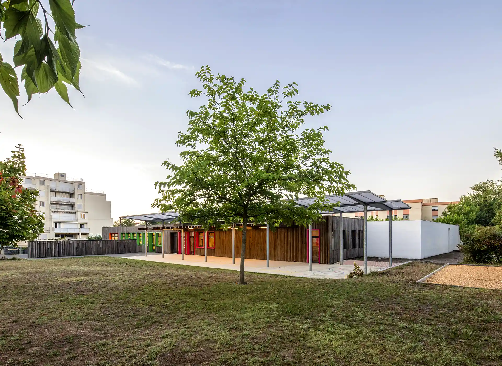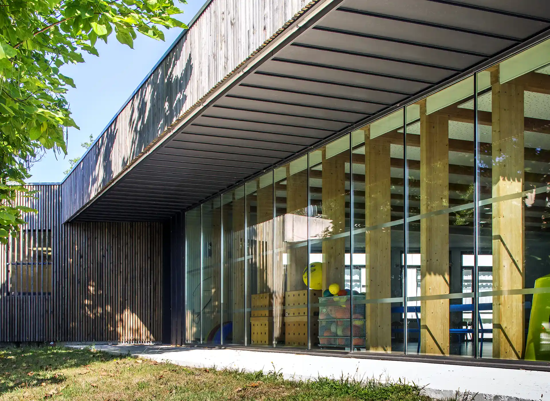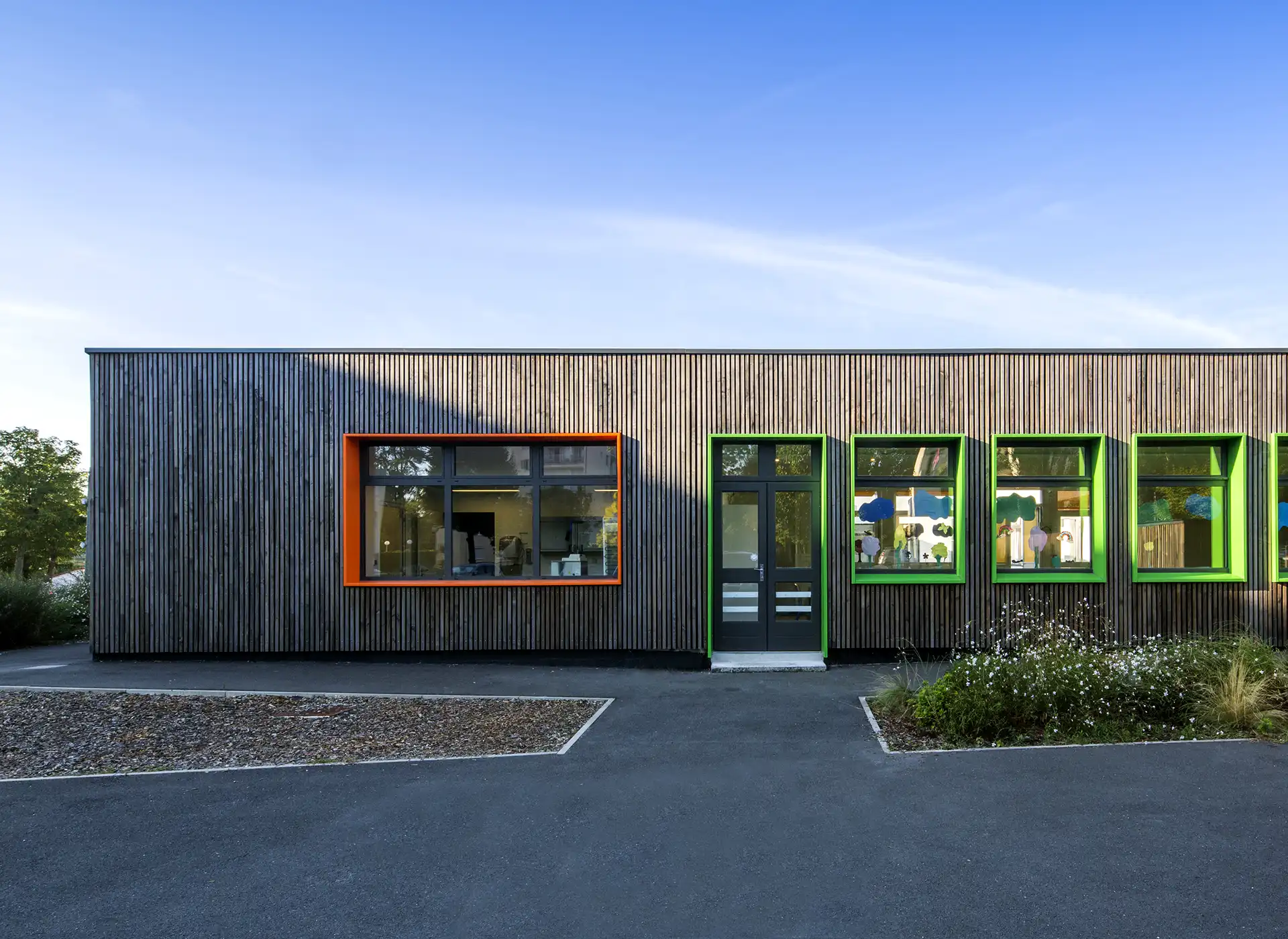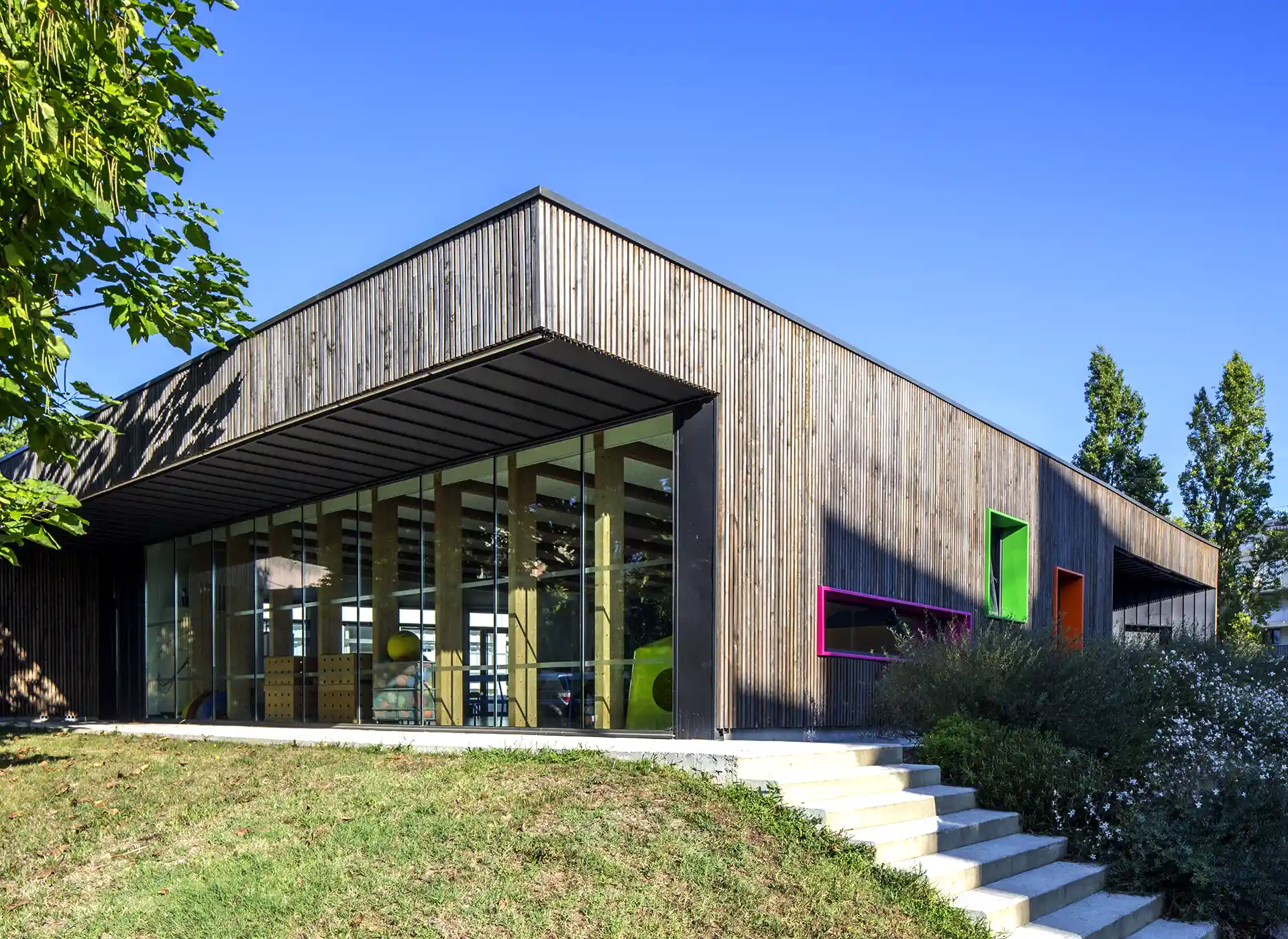 L’image de l’école dans le quartier est profondément refondue, par l’application sur certaines façades d’une ITE protégée par une vêture en bois des landes, et de grands cadres colorés marquant les baies.