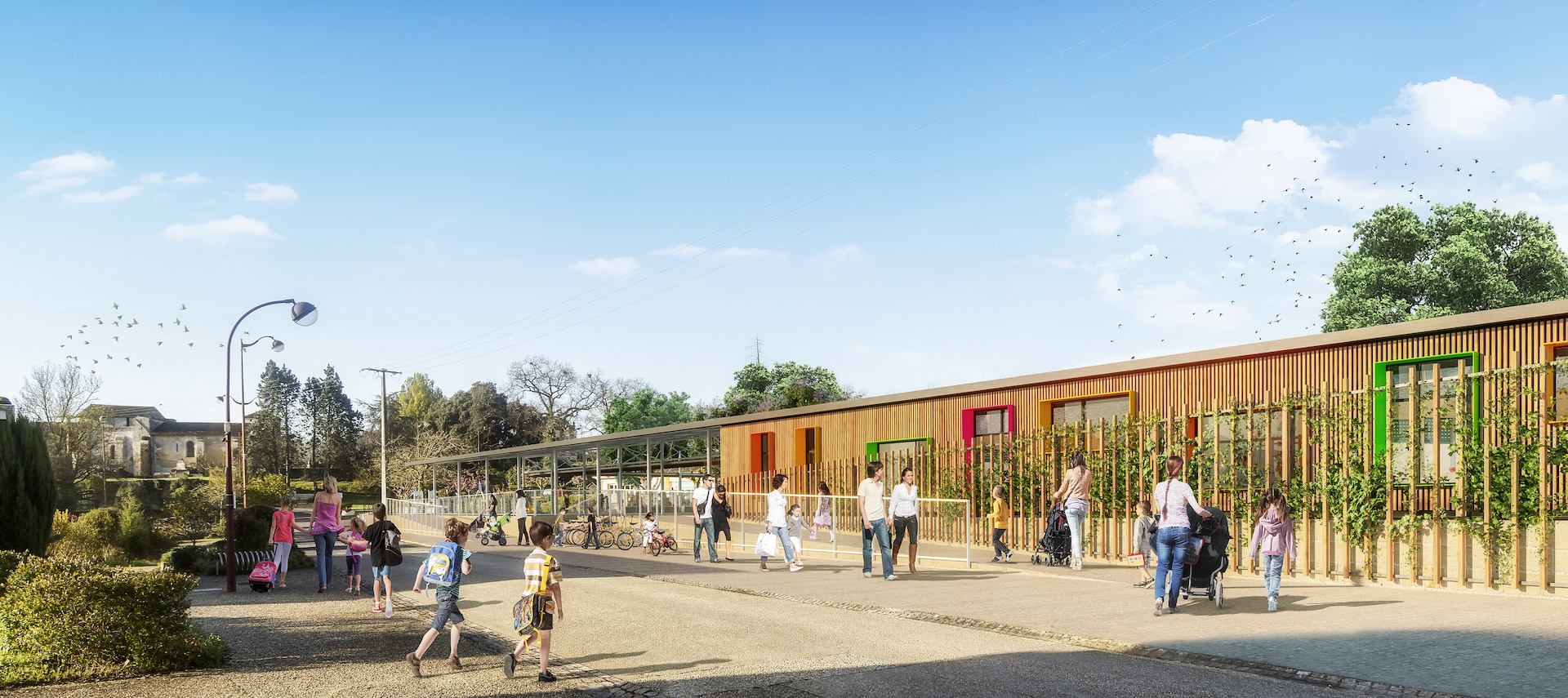 L’extension de l’école élémentaire fait face à la mairie, et se prolonge par un généreux préau. Ce dernier intègre le nouvel accès depuis le parvis commun à la mairie, la maison des arts et la médiathèque.
