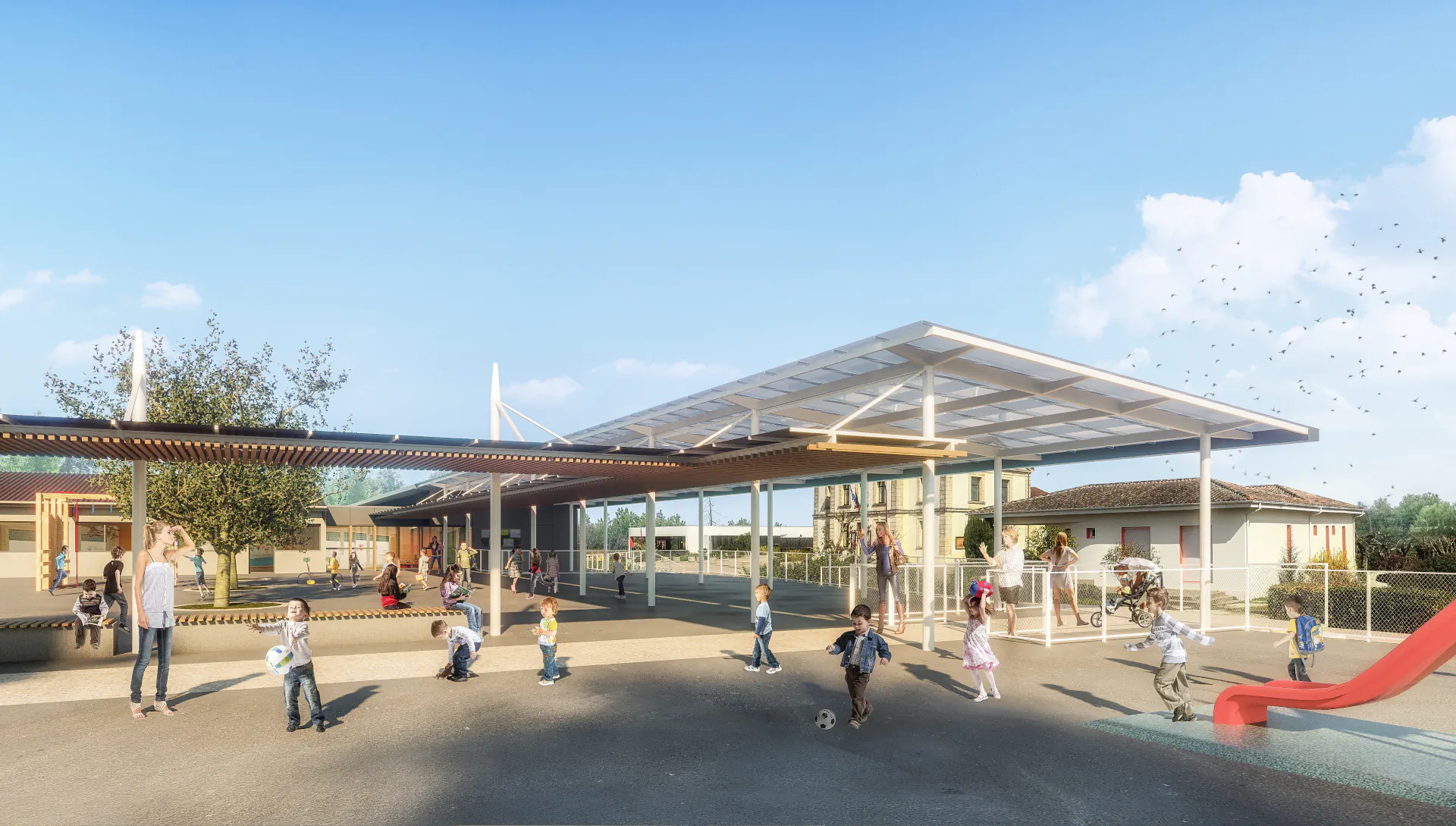 Le projet propose à la fois de restructurer le Groupe Scolaire en réorganisant ses fonctions, et de conforter son rôle d’équipement majeur du cœur du bourg.