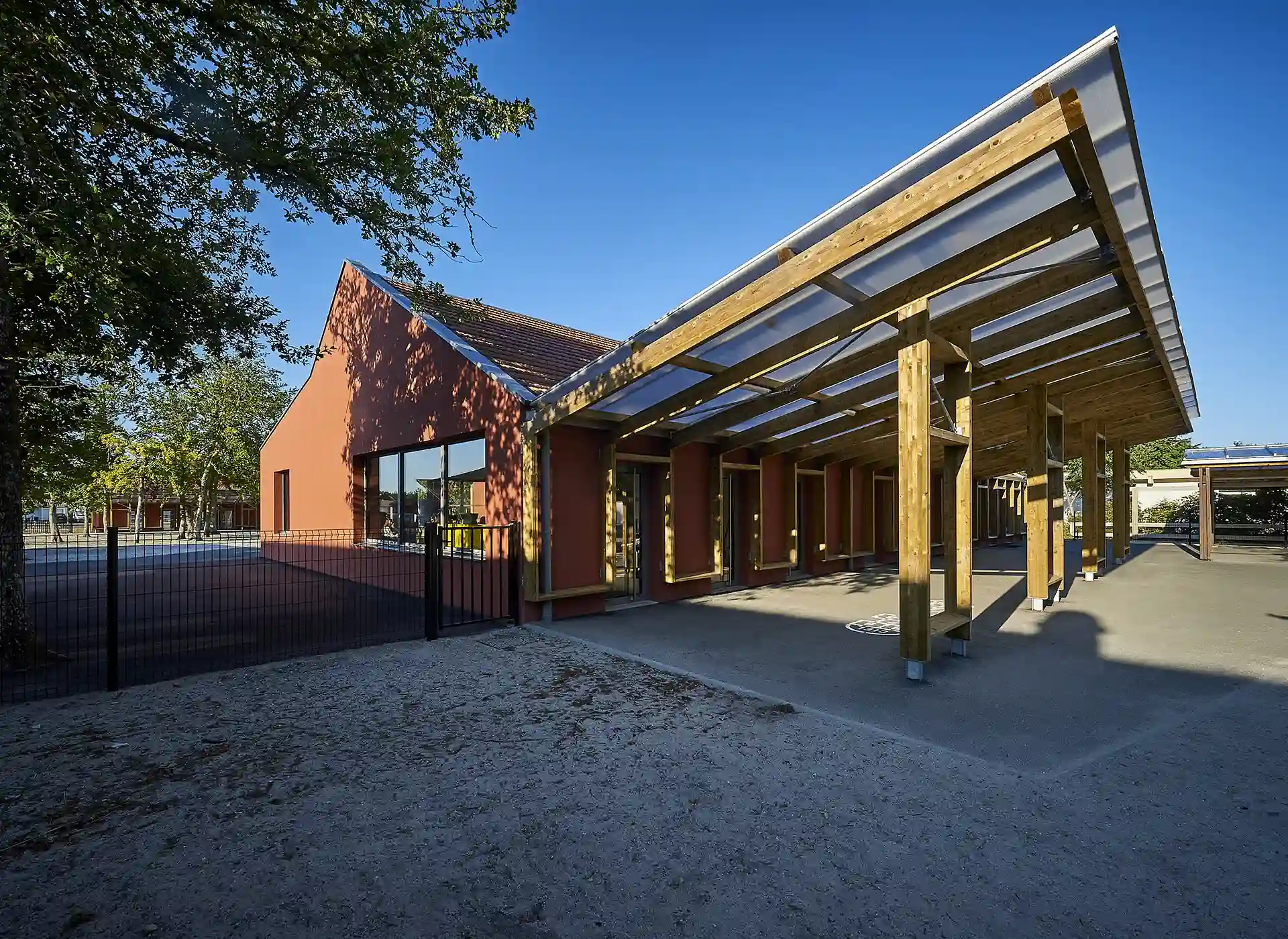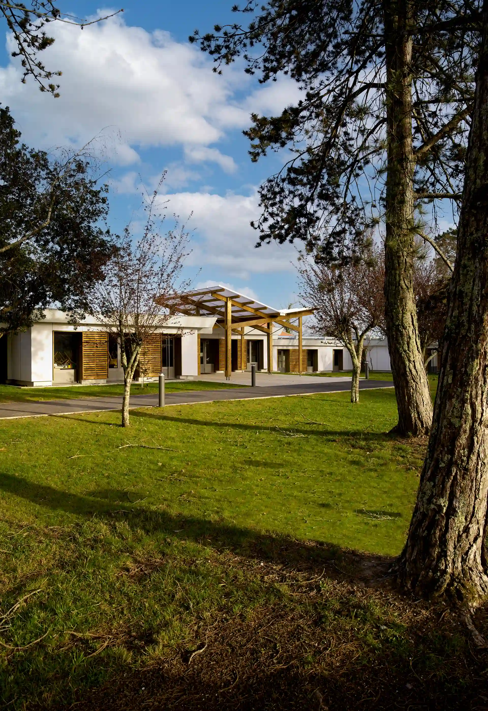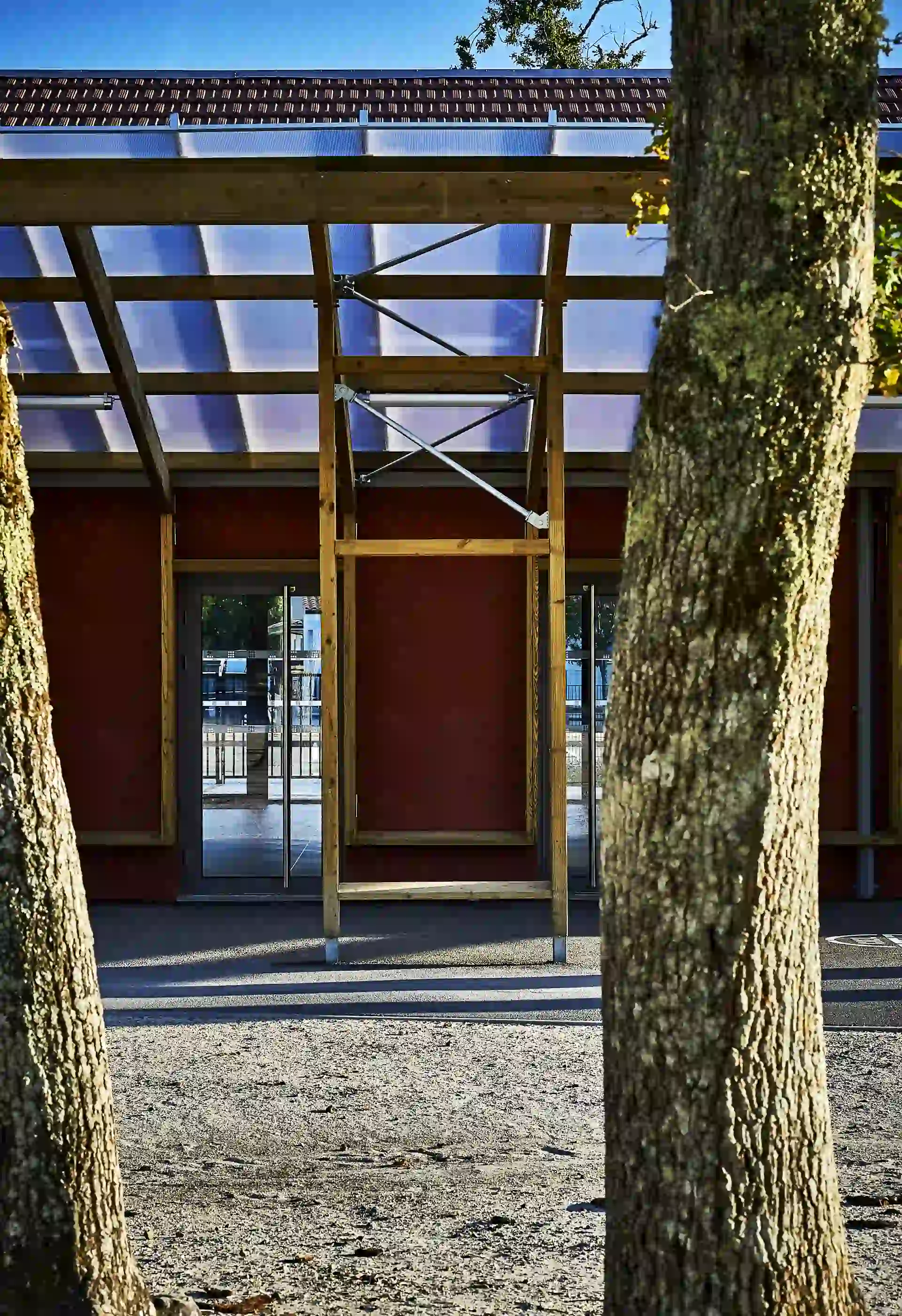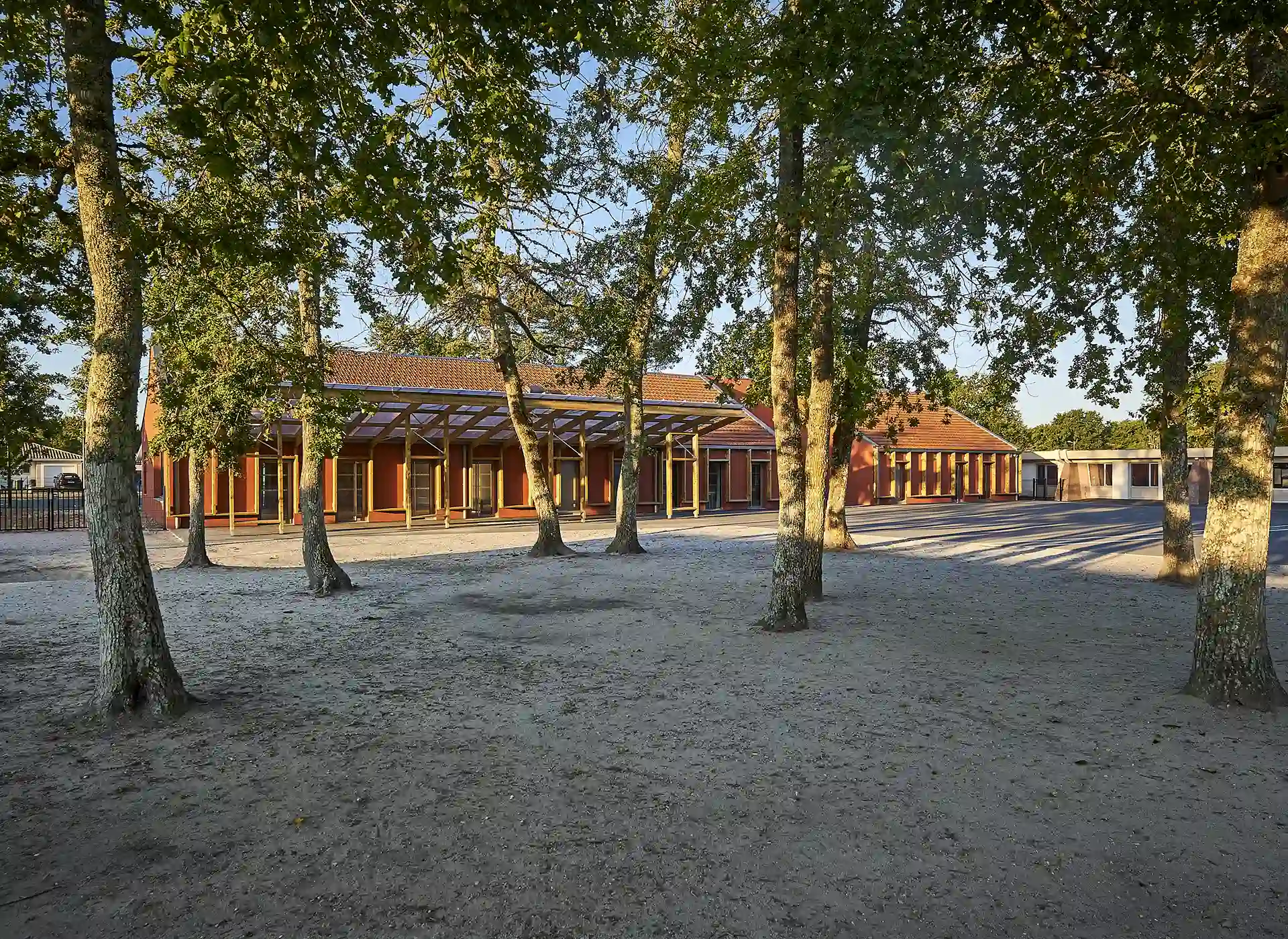 L’expression des extensions se base sur une réinterprétation contemporaine de l’architecture sud-girondine, avec des pignons, des murs longs pans et des pentes de toitures affirmés. La couleur rouge des constructions rappelle la briqueterie régionale qui occupait autrefois le site. S’inspirant du graphisme des colombages, des épines verticales en bois rythment les façades.