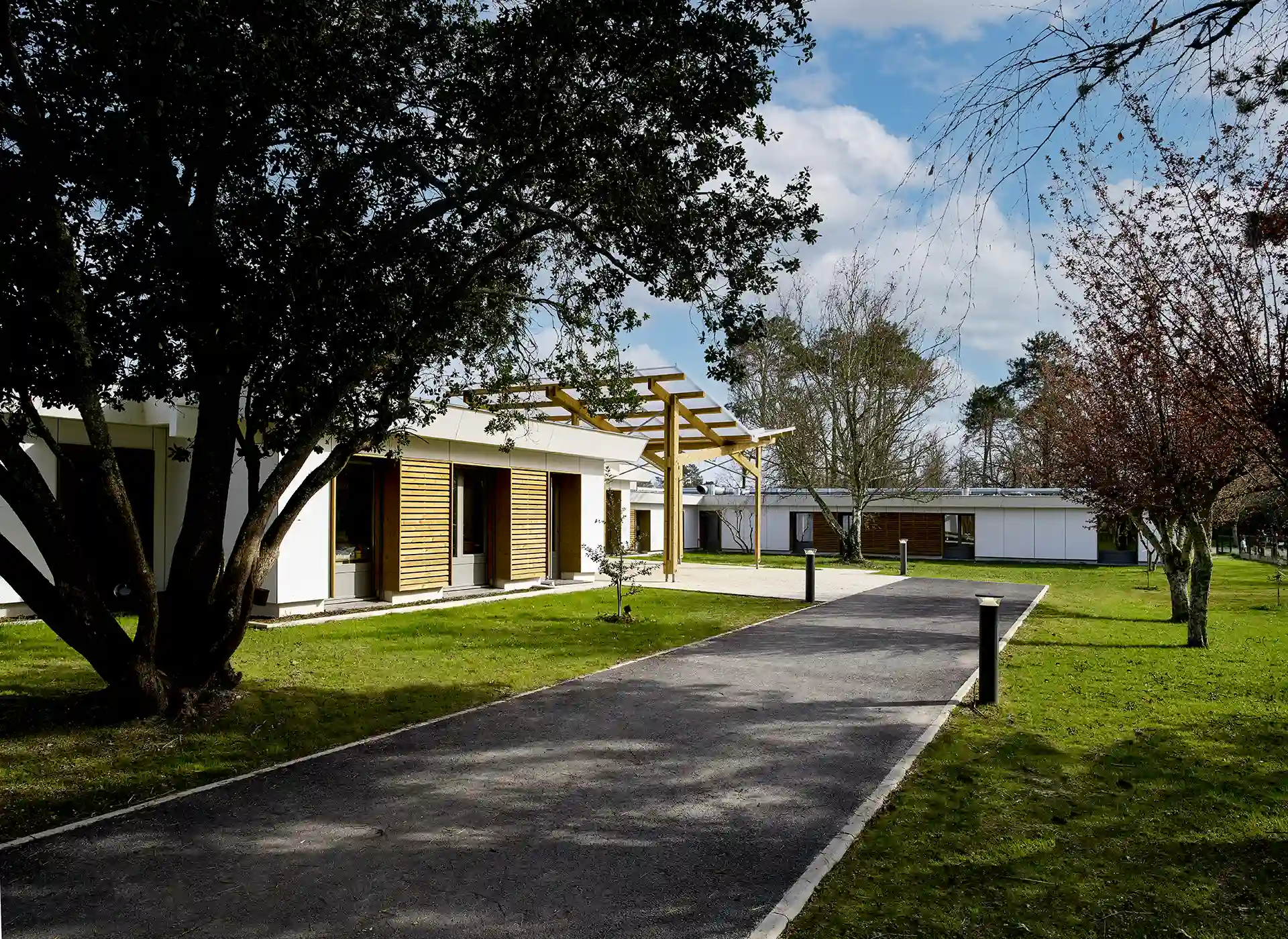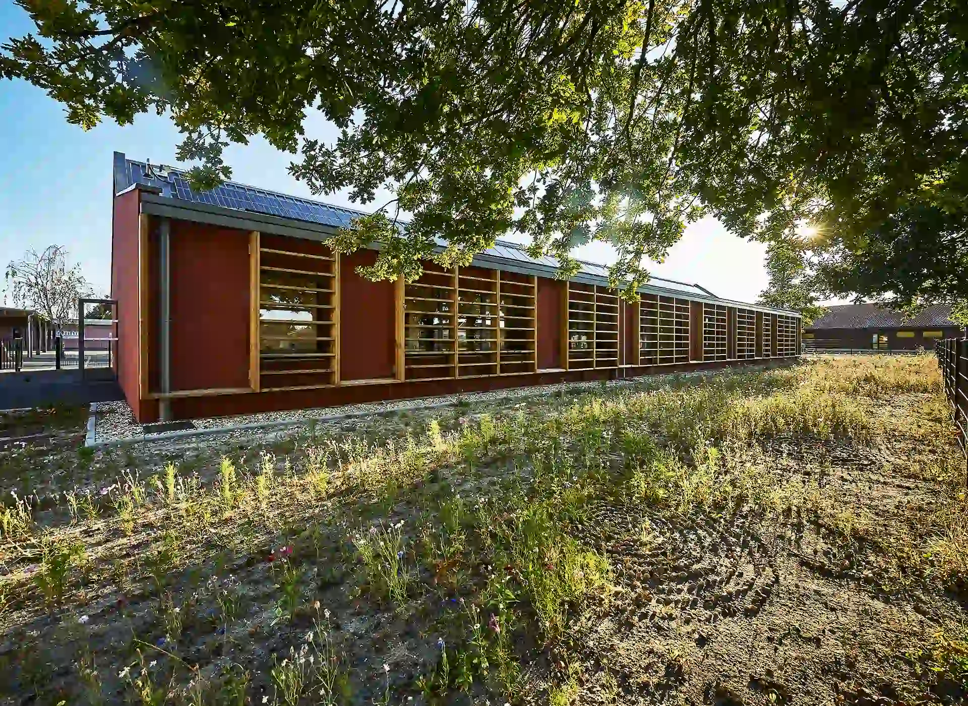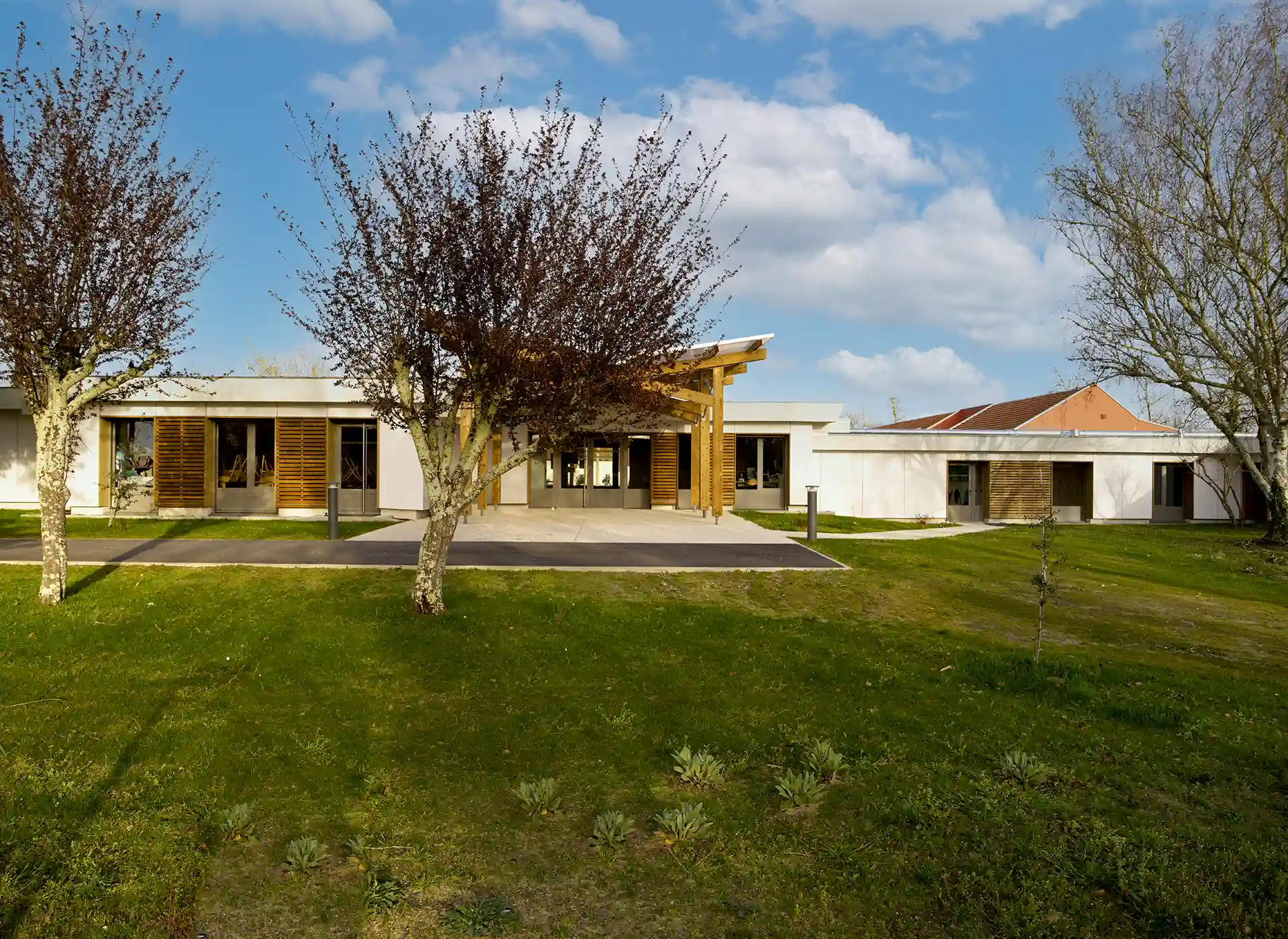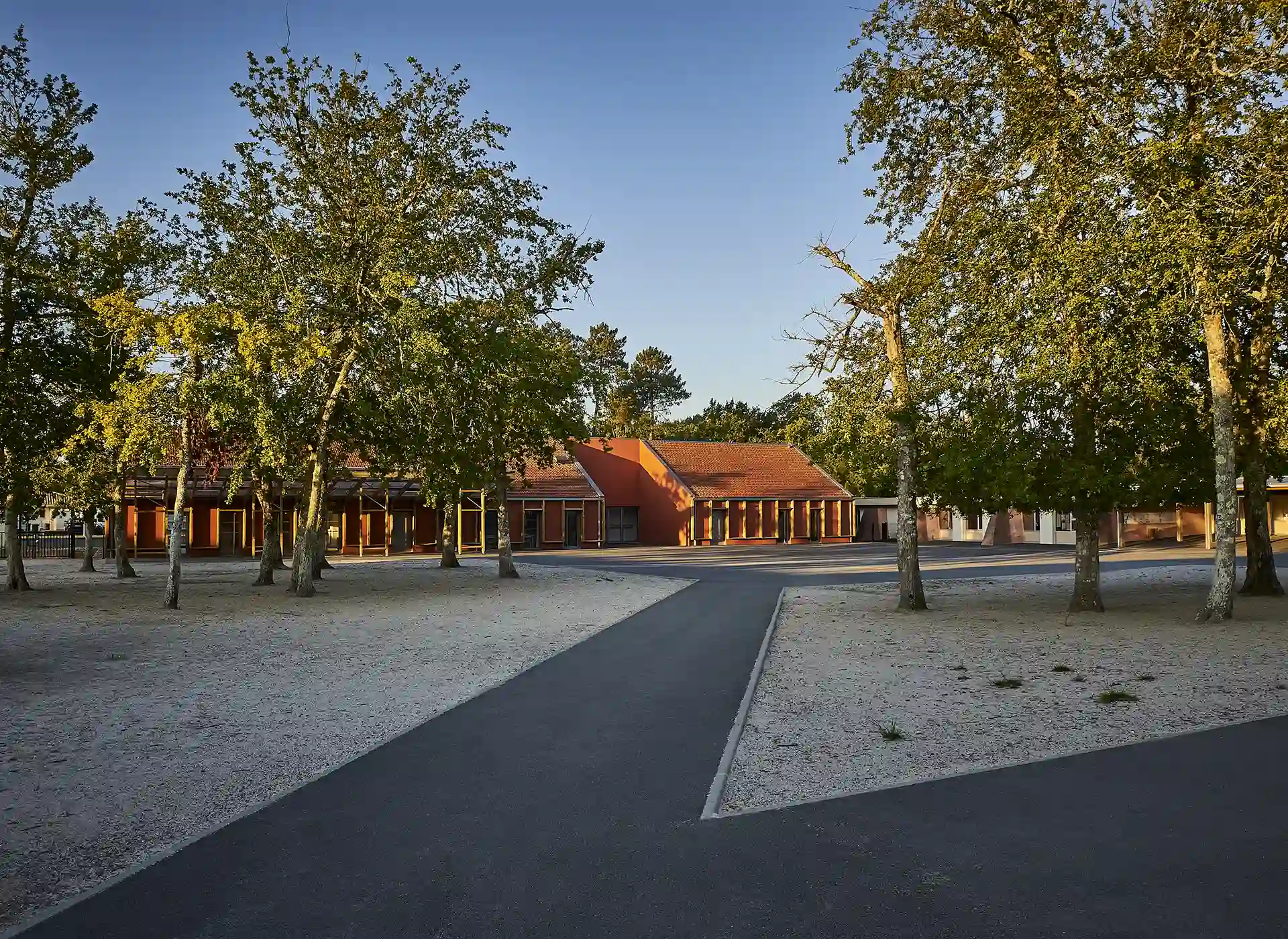 L’expression des extensions se base sur une réinterprétation contemporaine de l’architecture sud-girondine, avec des pignons, des murs longs pans et des pentes de toitures affirmés. La couleur rouge des constructions rappelle la briqueterie régionale qui occupait autrefois le site. S’inspirant du graphisme des colombages, des épines verticales en bois rythment les façades.