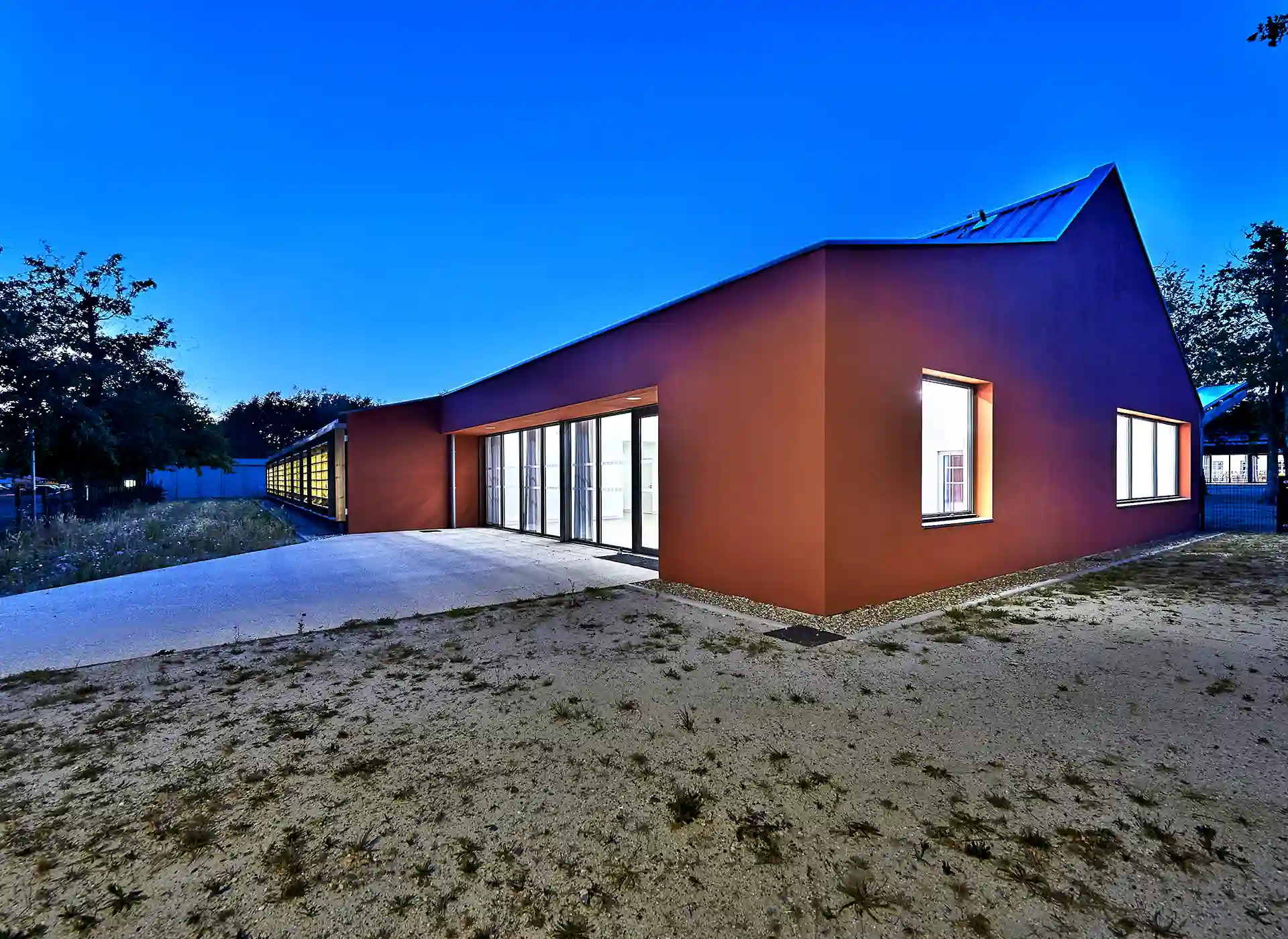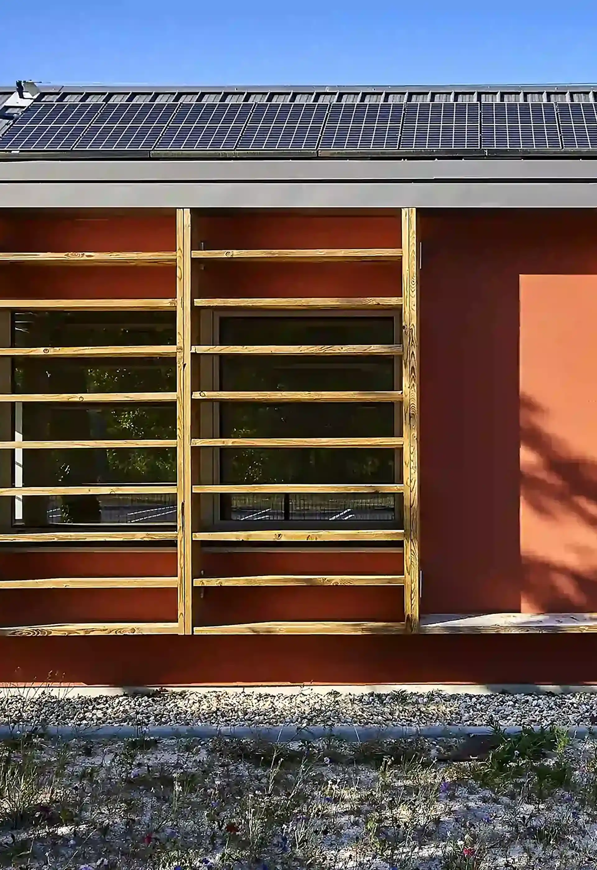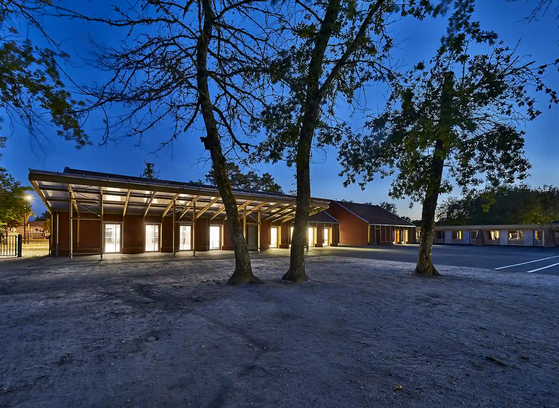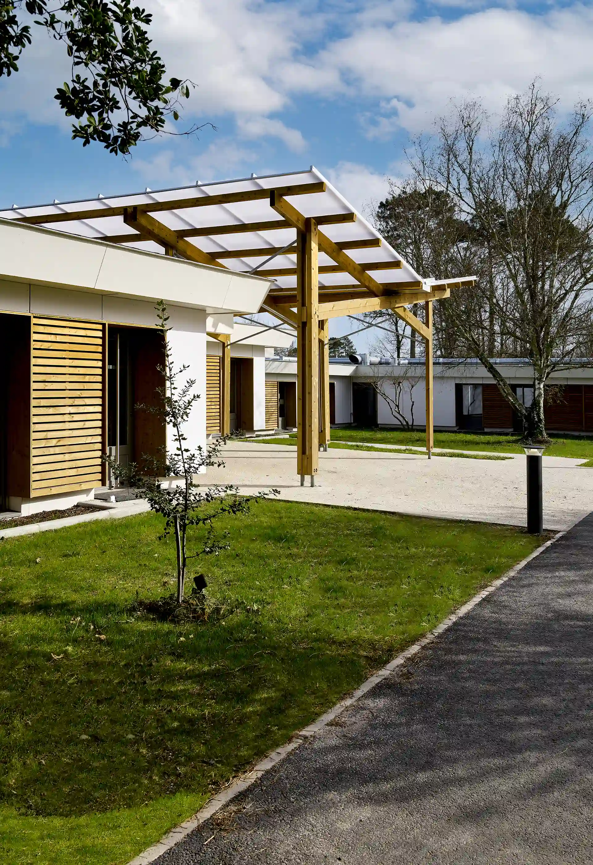 L’expression des extensions se base sur une réinterprétation contemporaine de l’architecture sud-girondine, avec des pignons, des murs longs pans et des pentes de toitures affirmés. La couleur rouge des constructions rappelle la briqueterie régionale qui occupait autrefois le site. S’inspirant du graphisme des colombages, des épines verticales en bois rythment les façades.