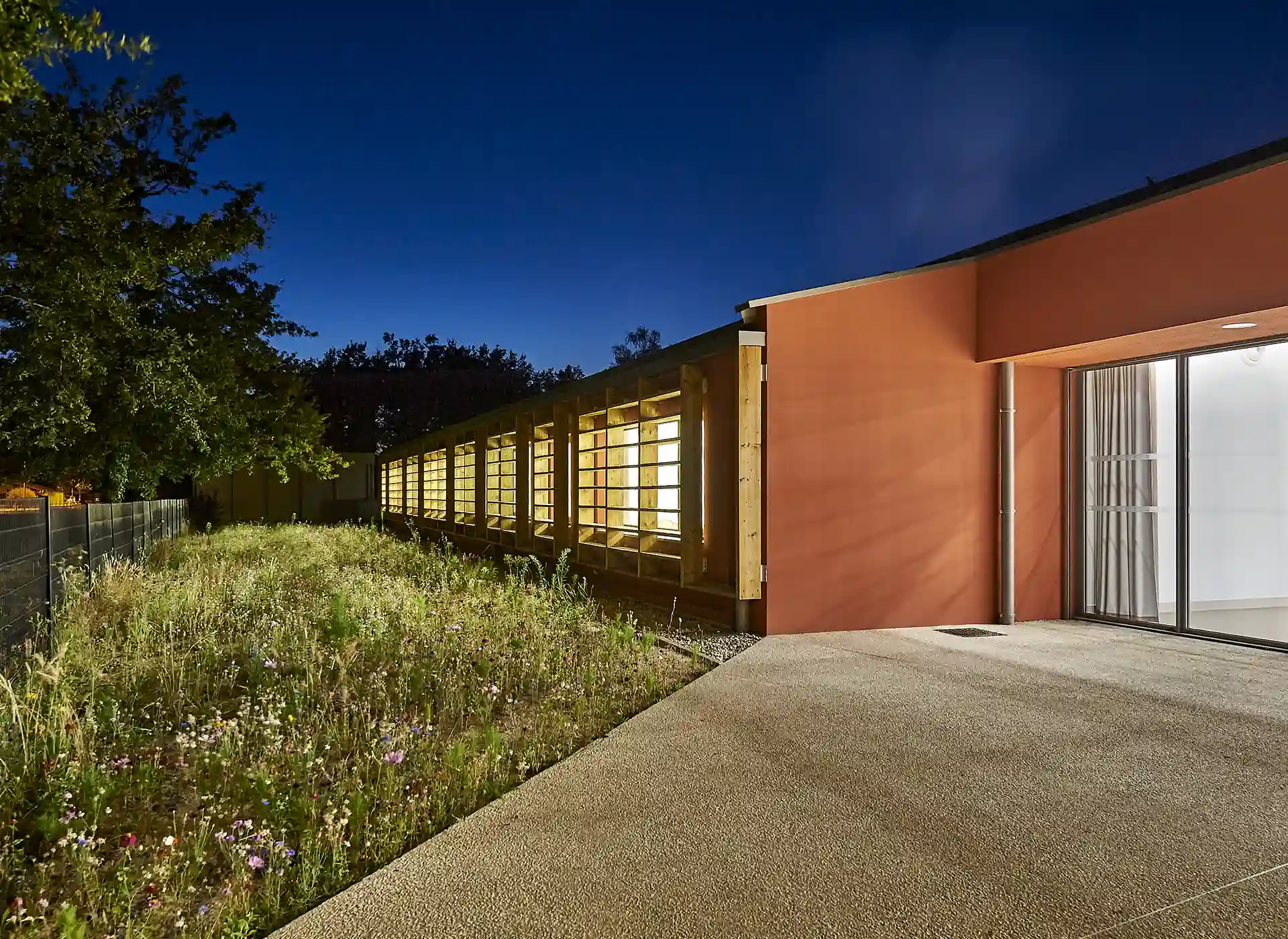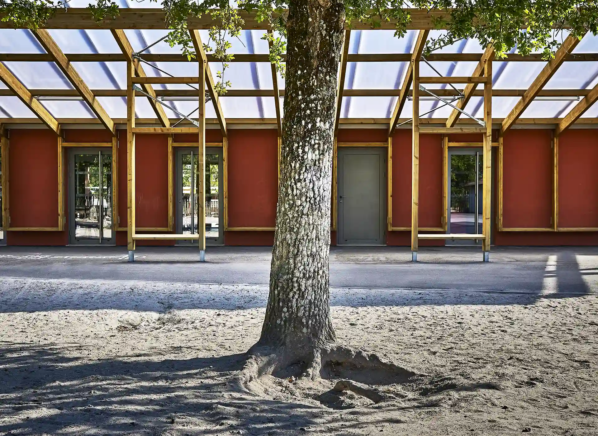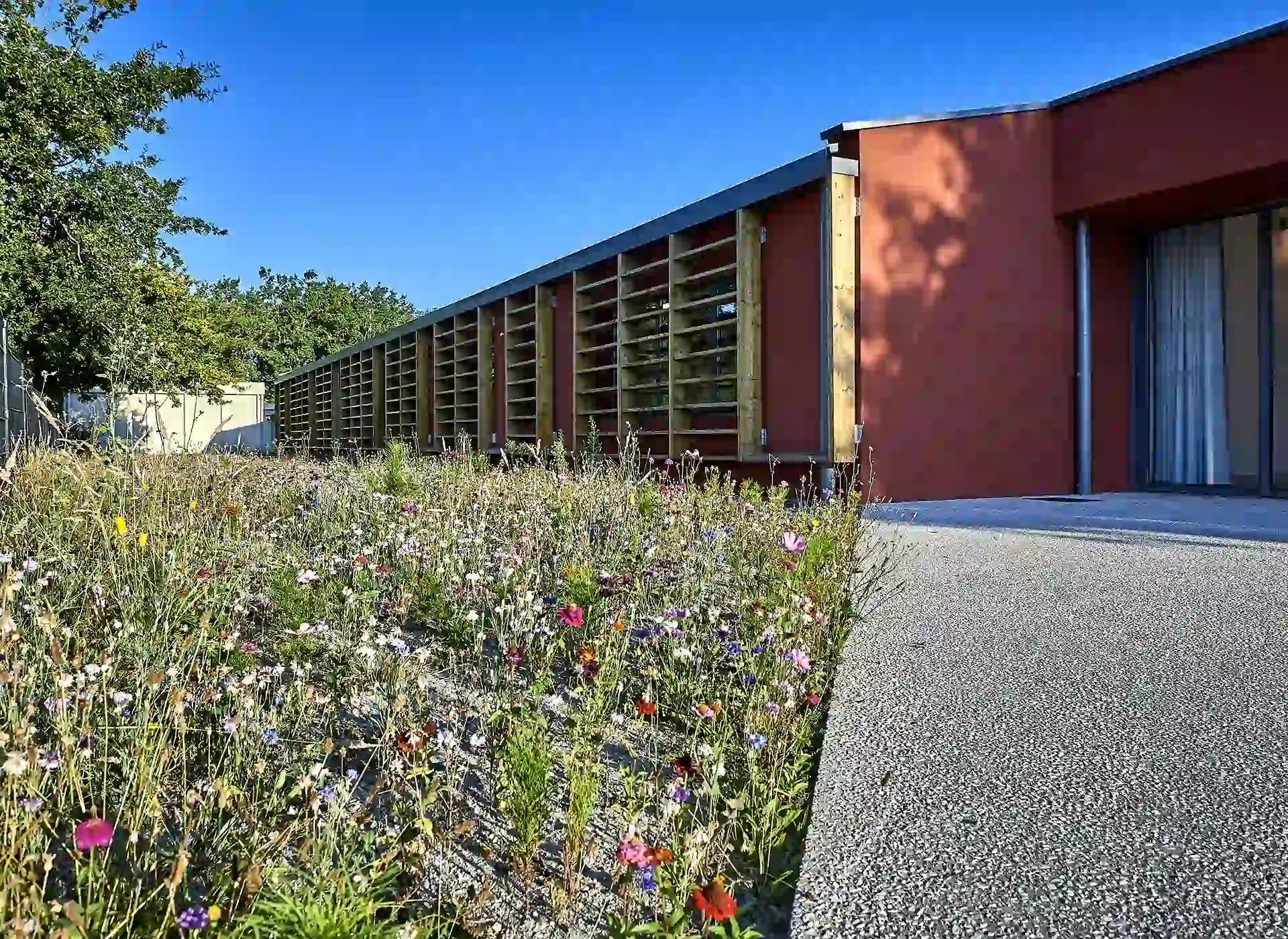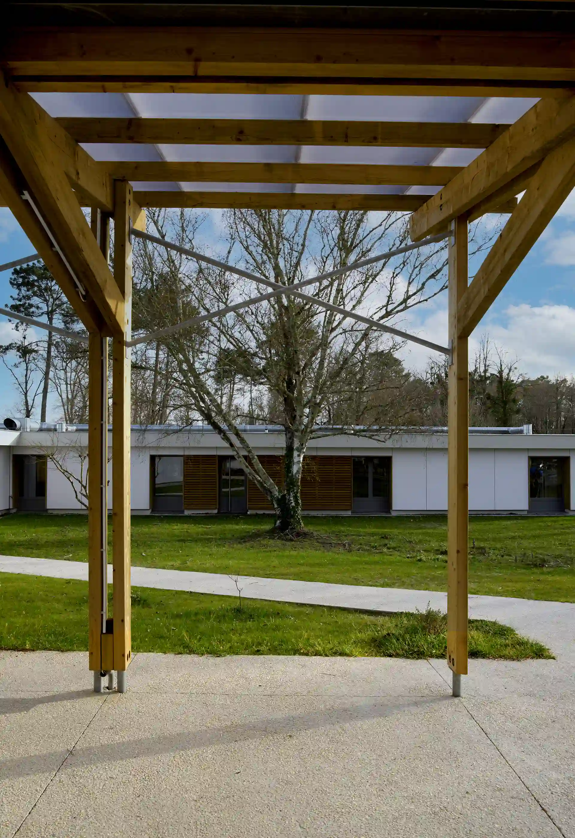 L’expression des extensions se base sur une réinterprétation contemporaine de l’architecture sud-girondine, avec des pignons, des murs longs pans et des pentes de toitures affirmés. La couleur rouge des constructions rappelle la briqueterie régionale qui occupait autrefois le site. S’inspirant du graphisme des colombages, des épines verticales en bois rythment les façades.