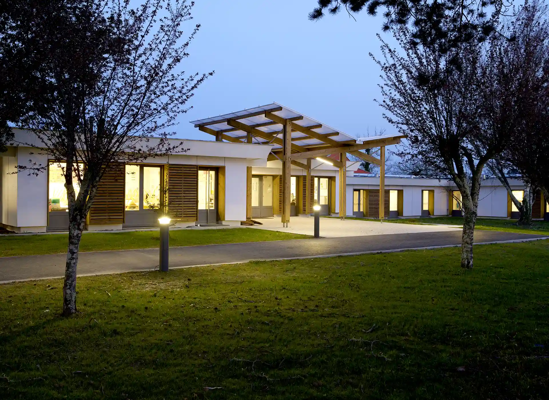 L’extension de l’établissement est le support de recomposition d’un espace récréatif déstructuré. Deux nouvelles constructions définissent des cours cadrées, aux périmètres clairs et identifiés. Le nouveau Centre de Loisirs est implanté en position centrale, entre élémentaire et maternelle.