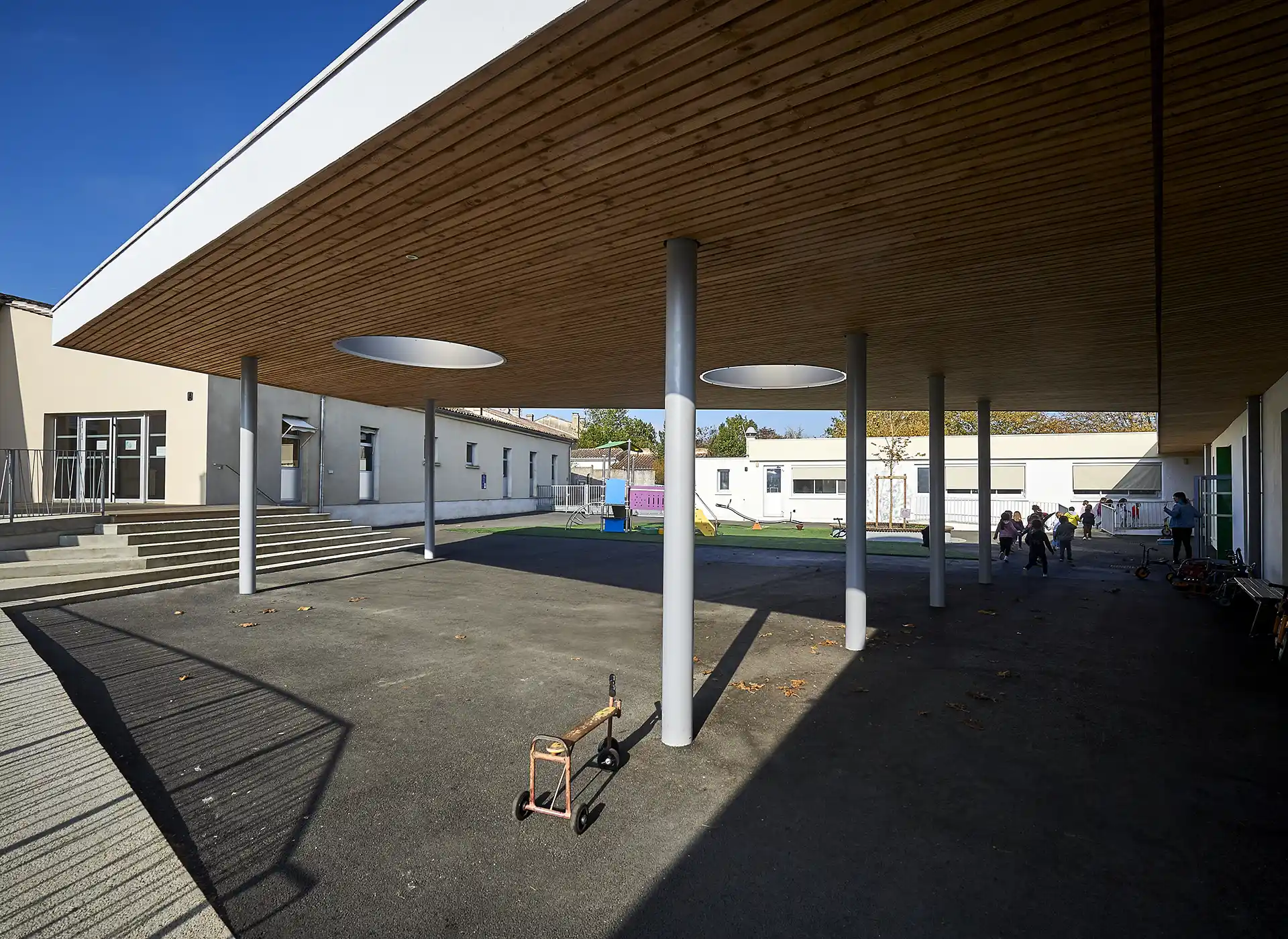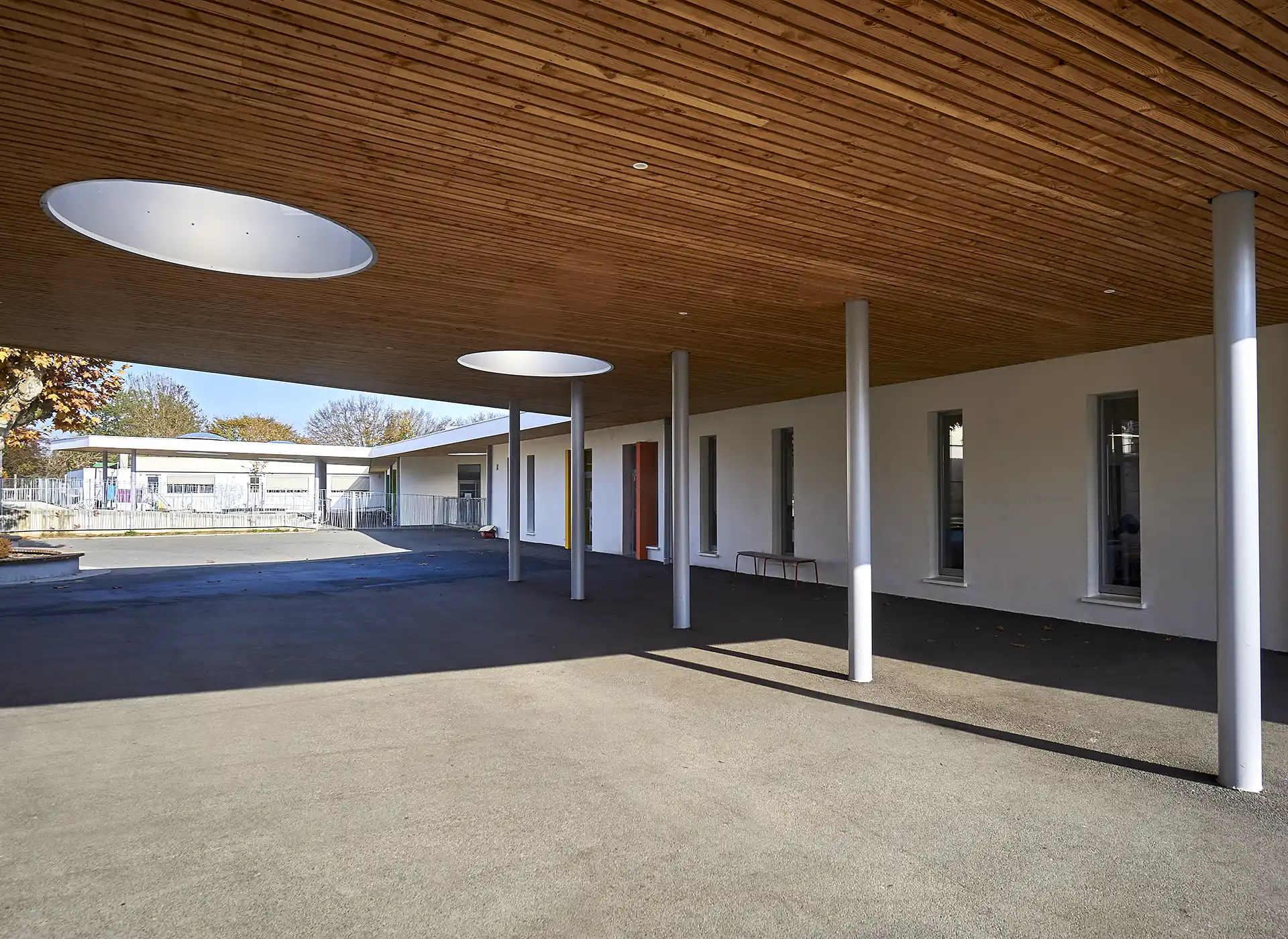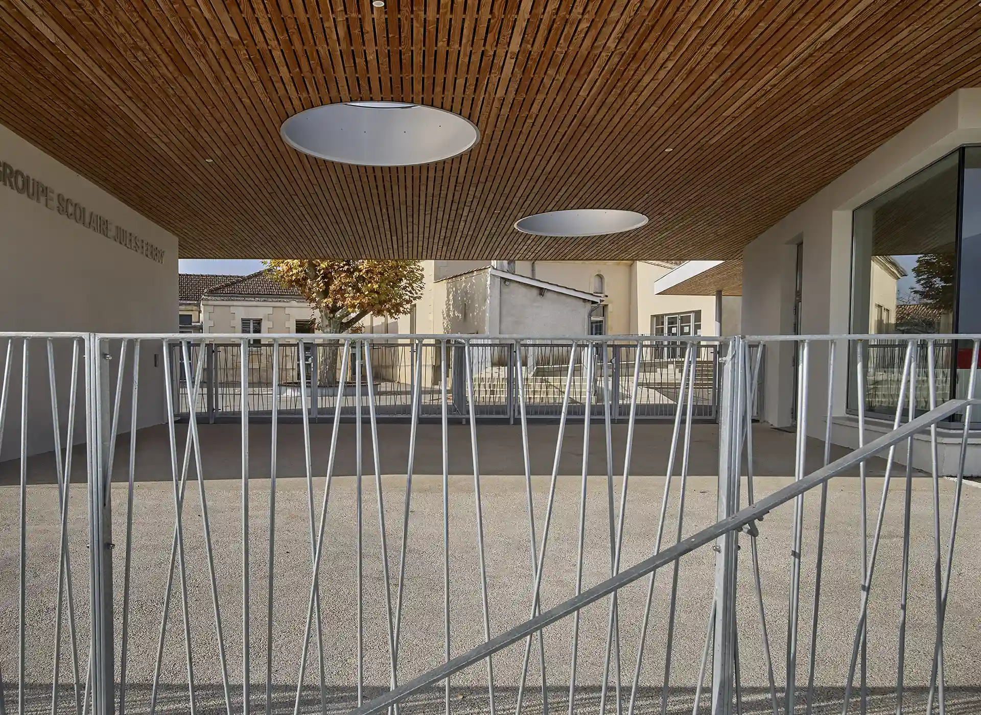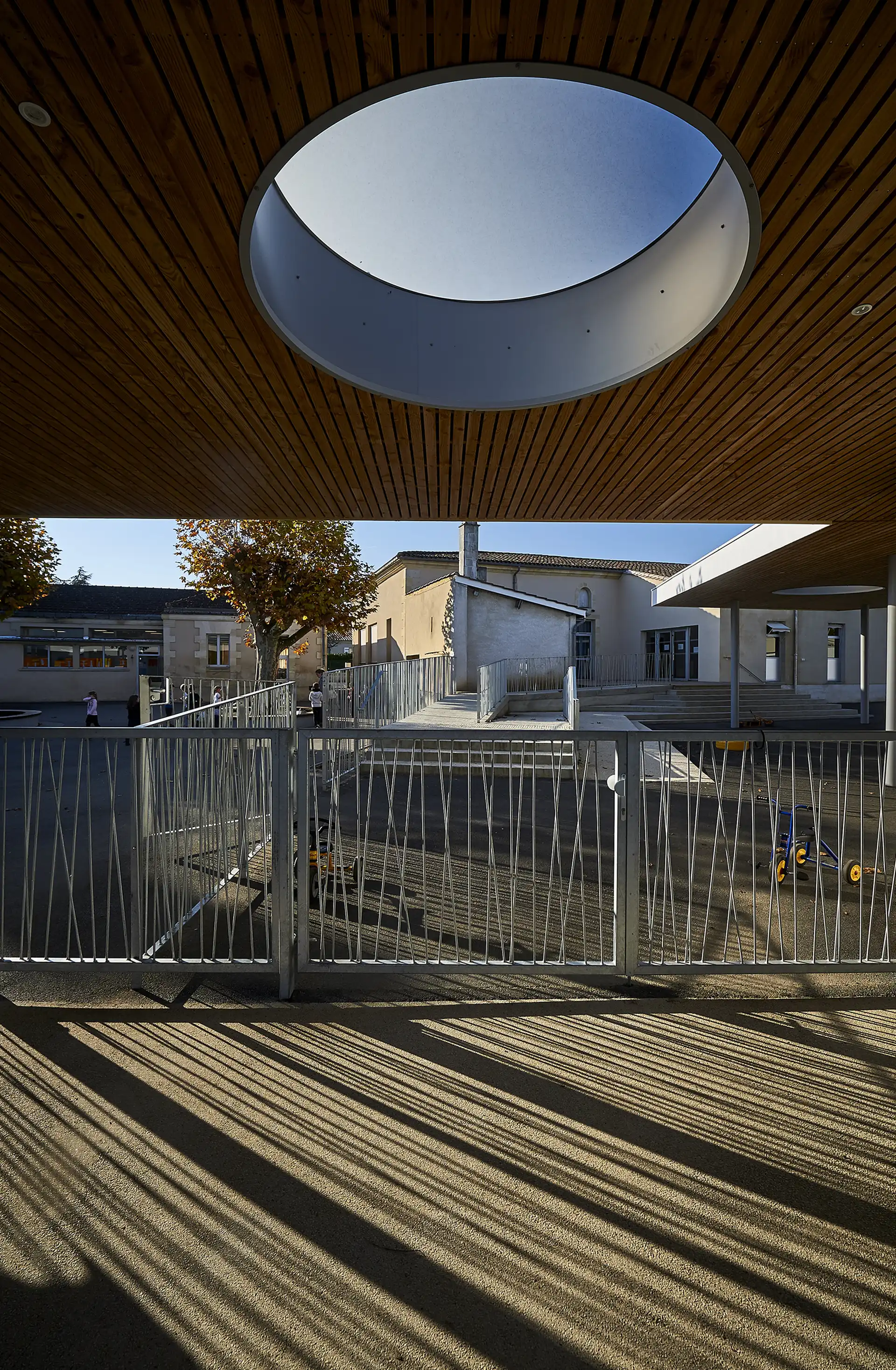 L’interface prise entre les bâtiments définit de généreuses cours intimistes, protégées des éléments et séquencées par les préaux.