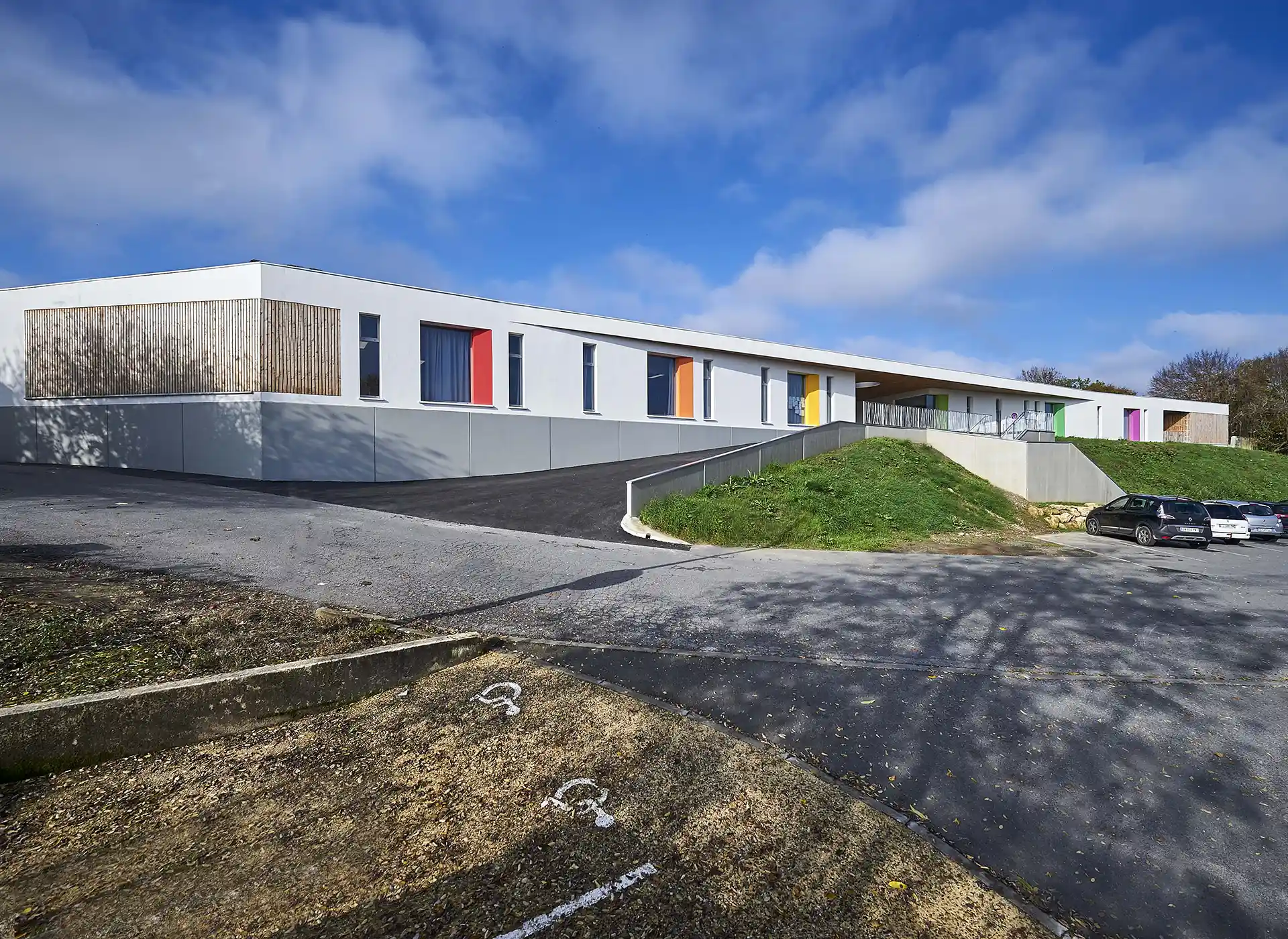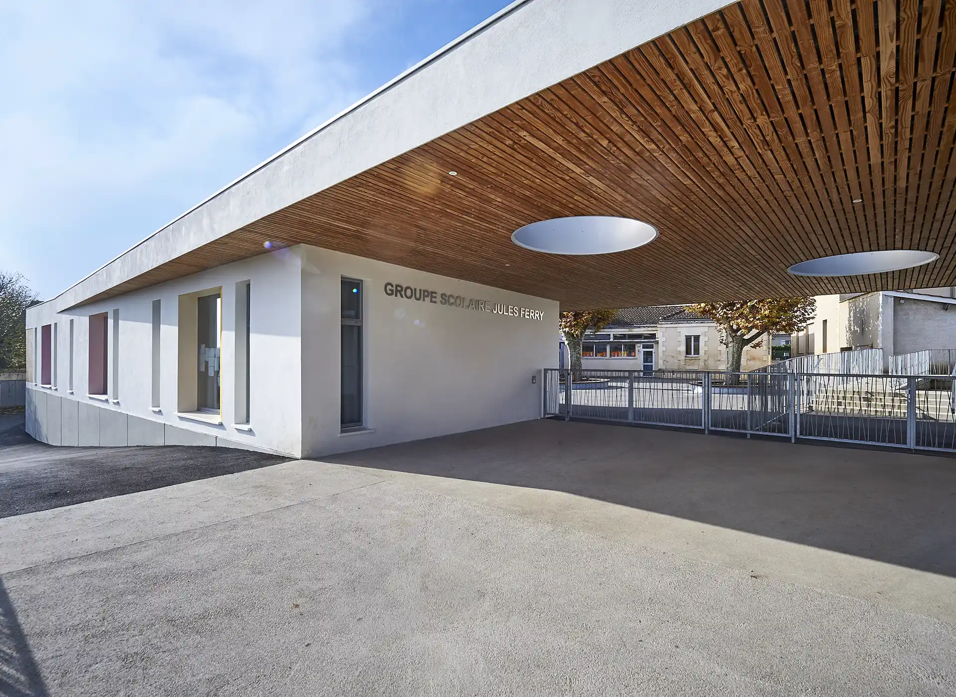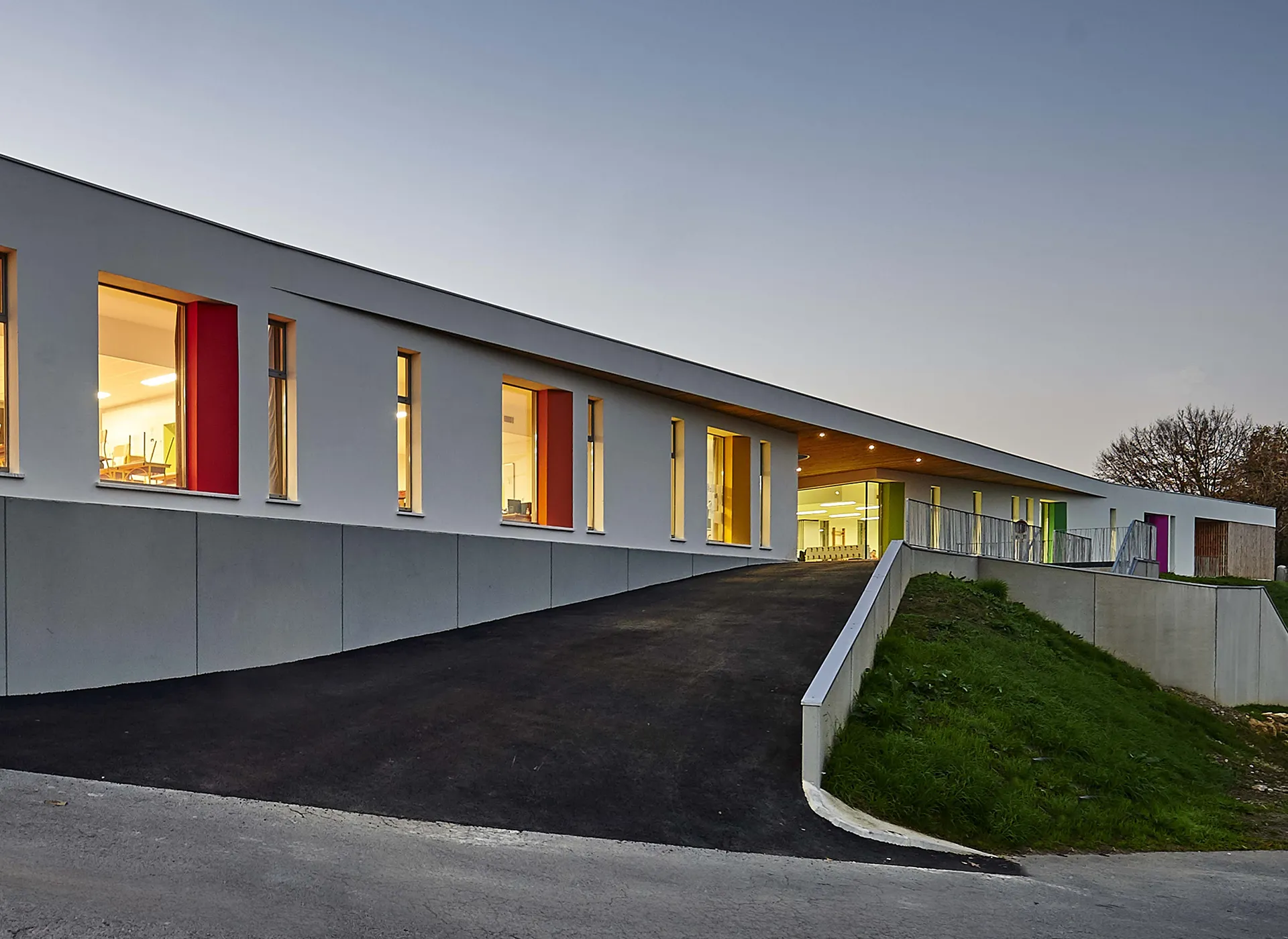 Les bâtiments projetés s’étirent sur un long talus et définissent une architecture de crête, depuis laquelle s’ouvrent des vues lointaines sur le grand paysage. Ils sont implantés en contrepoint des bâtiments remarquables anciens conservés (école Jules Ferry de la fin du XIX° siècle), qui sont partiellement rénovés, et auxquels ils sont reliés par de nouveaux préaux. Ces derners prolongent également une généreuse coursive côté cour, qui protège tous les accès aux nouveaux espaces.