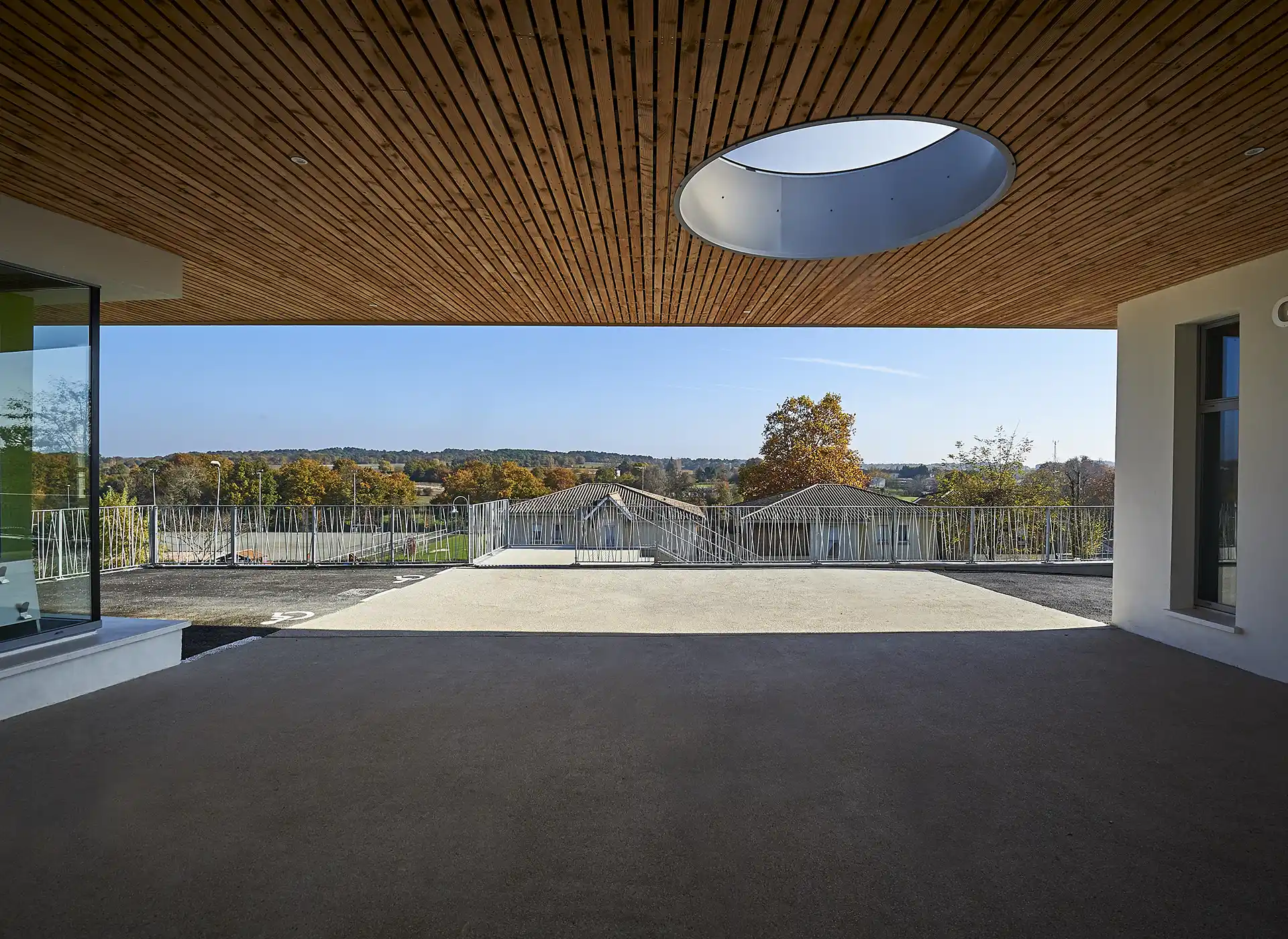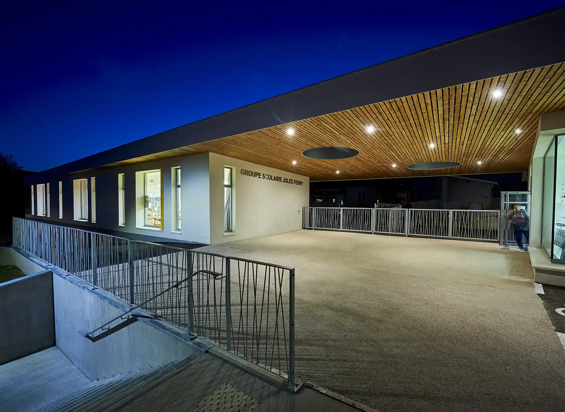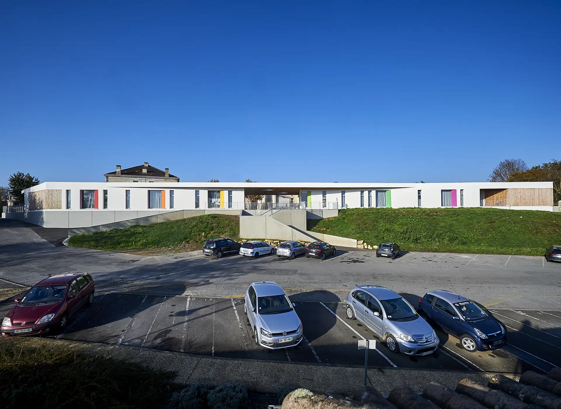 Les bâtiments projetés s’étirent sur un long talus et définissent une architecture de crête, depuis laquelle s’ouvrent des vues lointaines sur le grand paysage. Ils sont implantés en contrepoint des bâtiments remarquables anciens conservés (école Jules Ferry de la fin du XIX° siècle), qui sont partiellement rénovés, et auxquels ils sont reliés par de nouveaux préaux. Ces derners prolongent également une généreuse coursive côté cour, qui protège tous les accès aux nouveaux espaces.