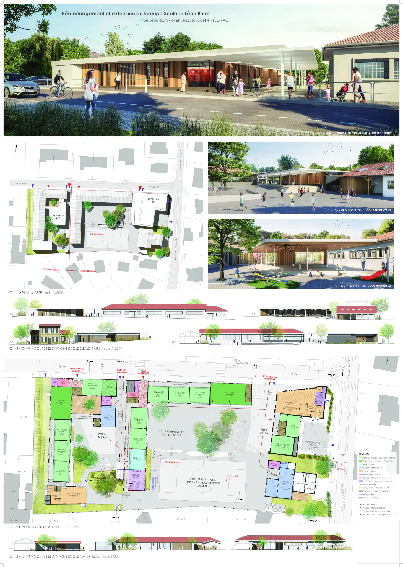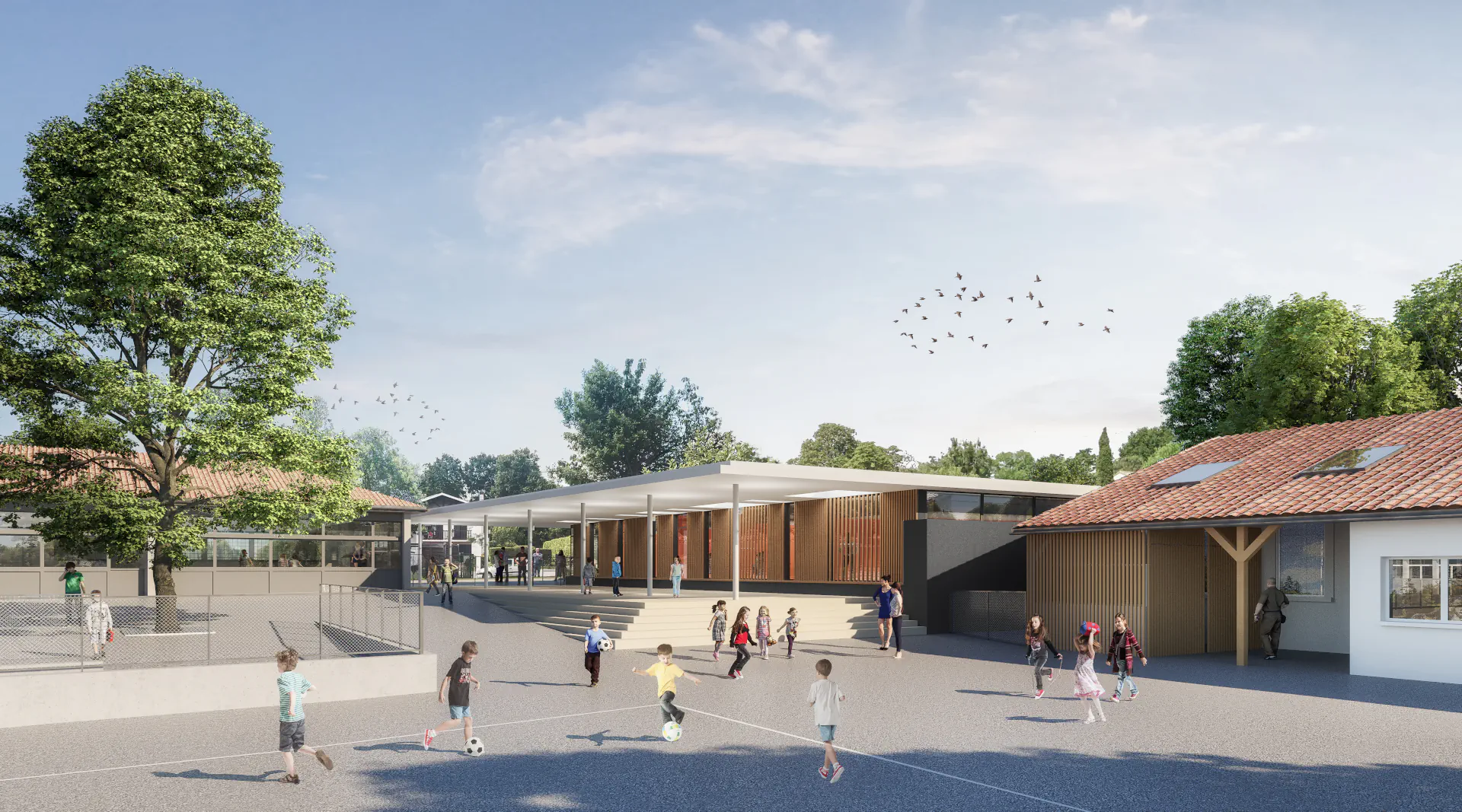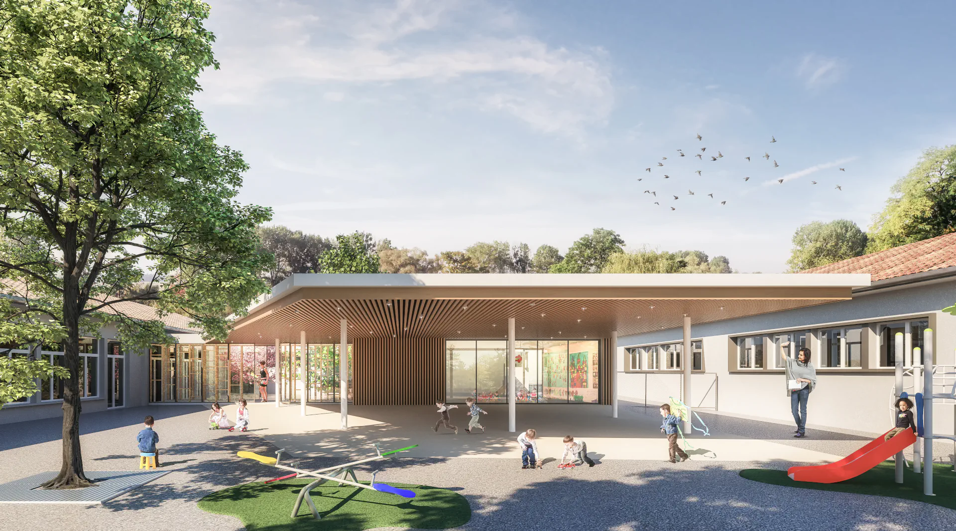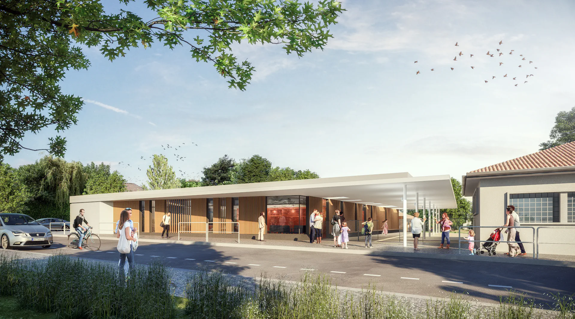 L’extension de l’école élémentaire, intervention majeure du projet, définit une nouvelle entrée très lisible qui intègre un parvis abrité propice aux échanges et aux rencontres.