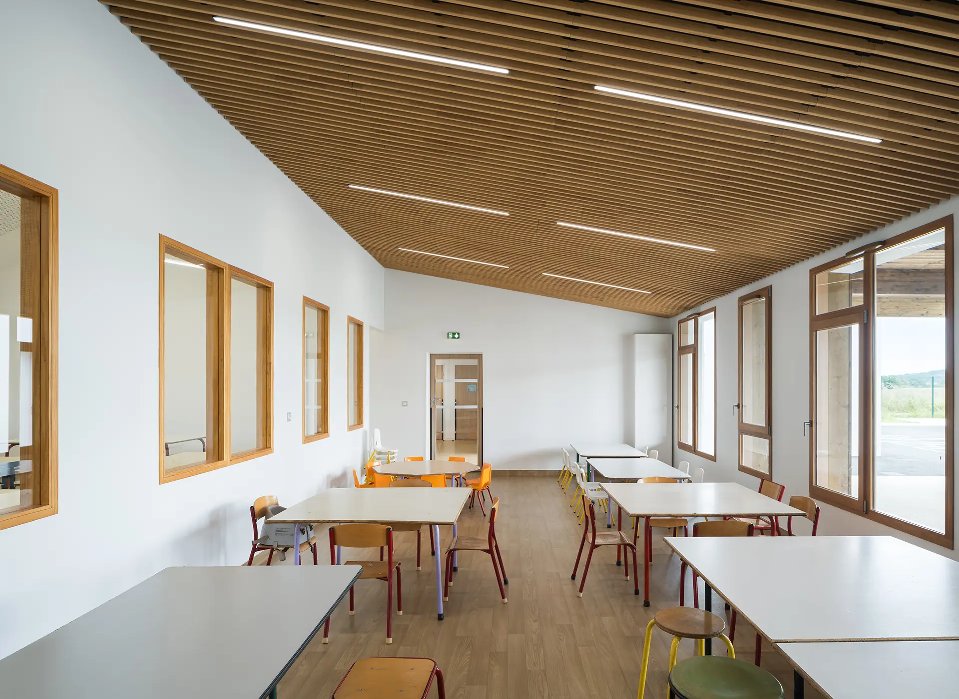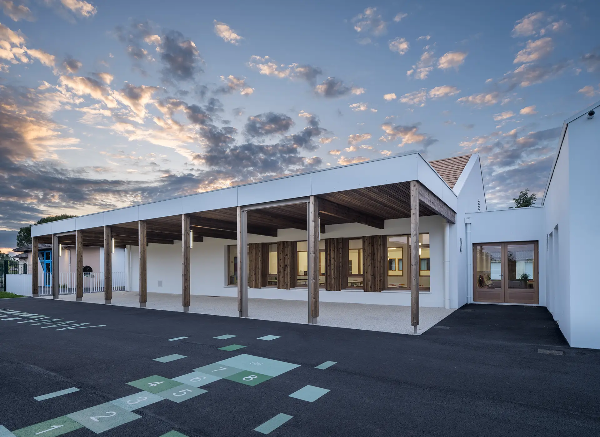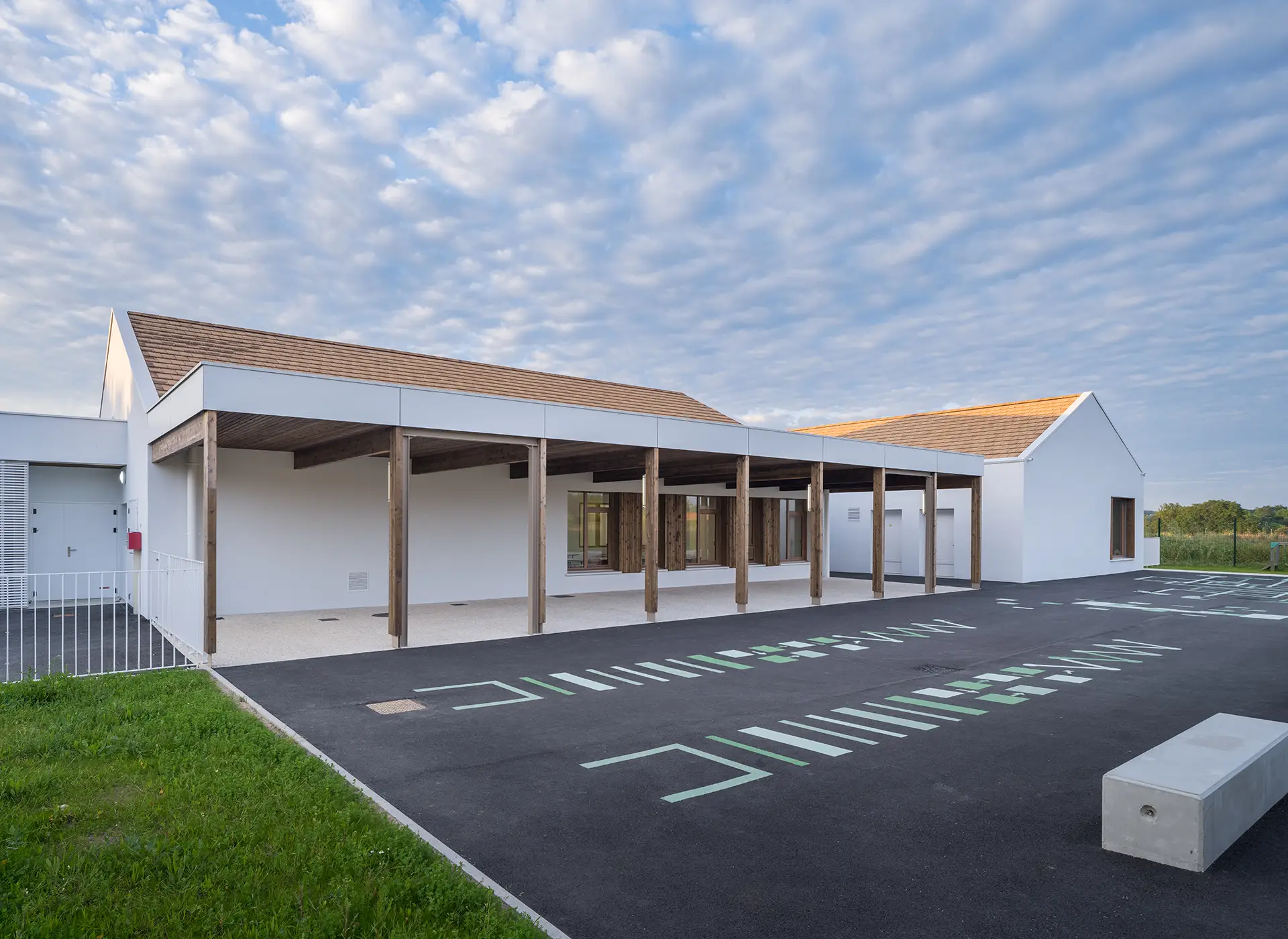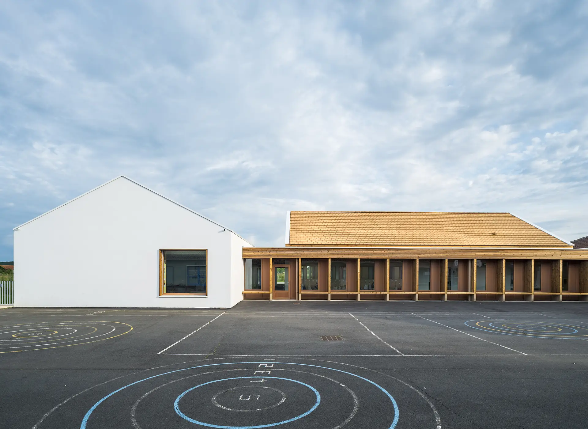 Une nouvelle école maternelle et un nouveau pôle de restauration partagé s’inscrivent dans le prolongement de l’école élémentaire existante, en créant deux cours circonscrites qui offrent des vues remarquables sur le paysage lointain.