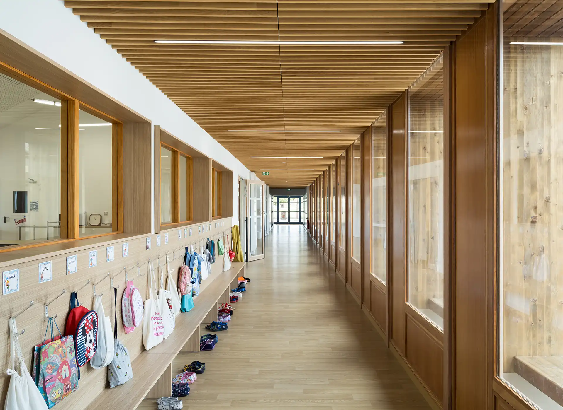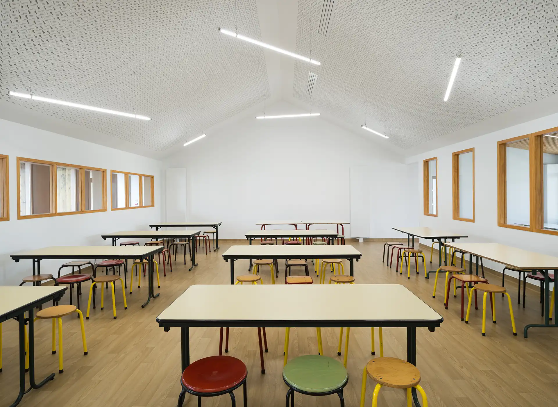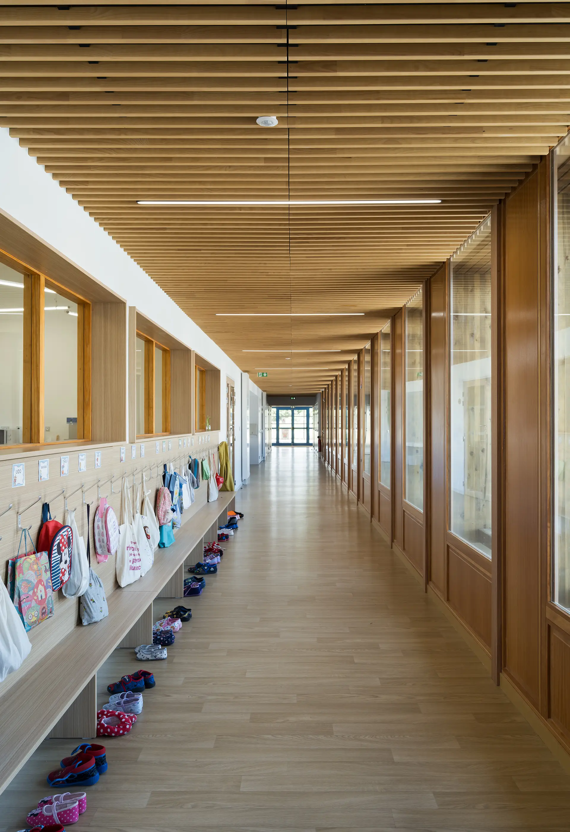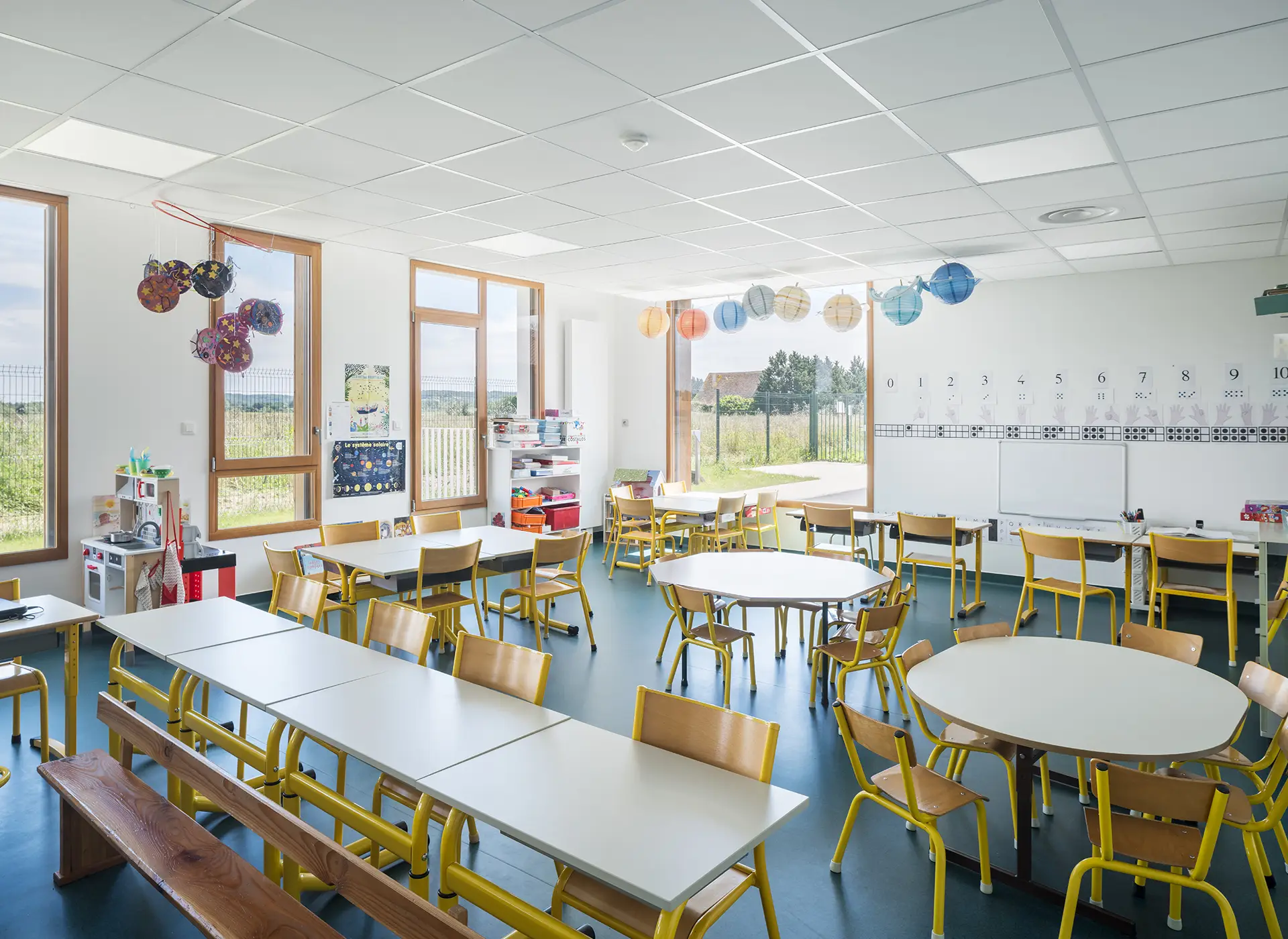 Une nouvelle école maternelle et un nouveau pôle de restauration partagé s’inscrivent dans le prolongement de l’école élémentaire existante, en créant deux cours circonscrites qui offrent des vues remarquables sur le paysage lointain.