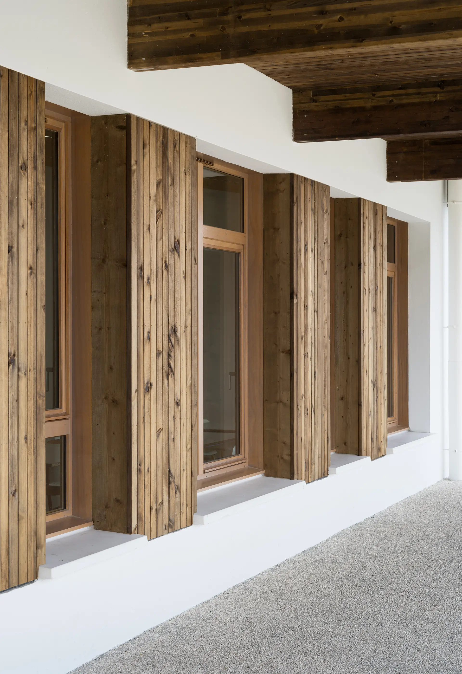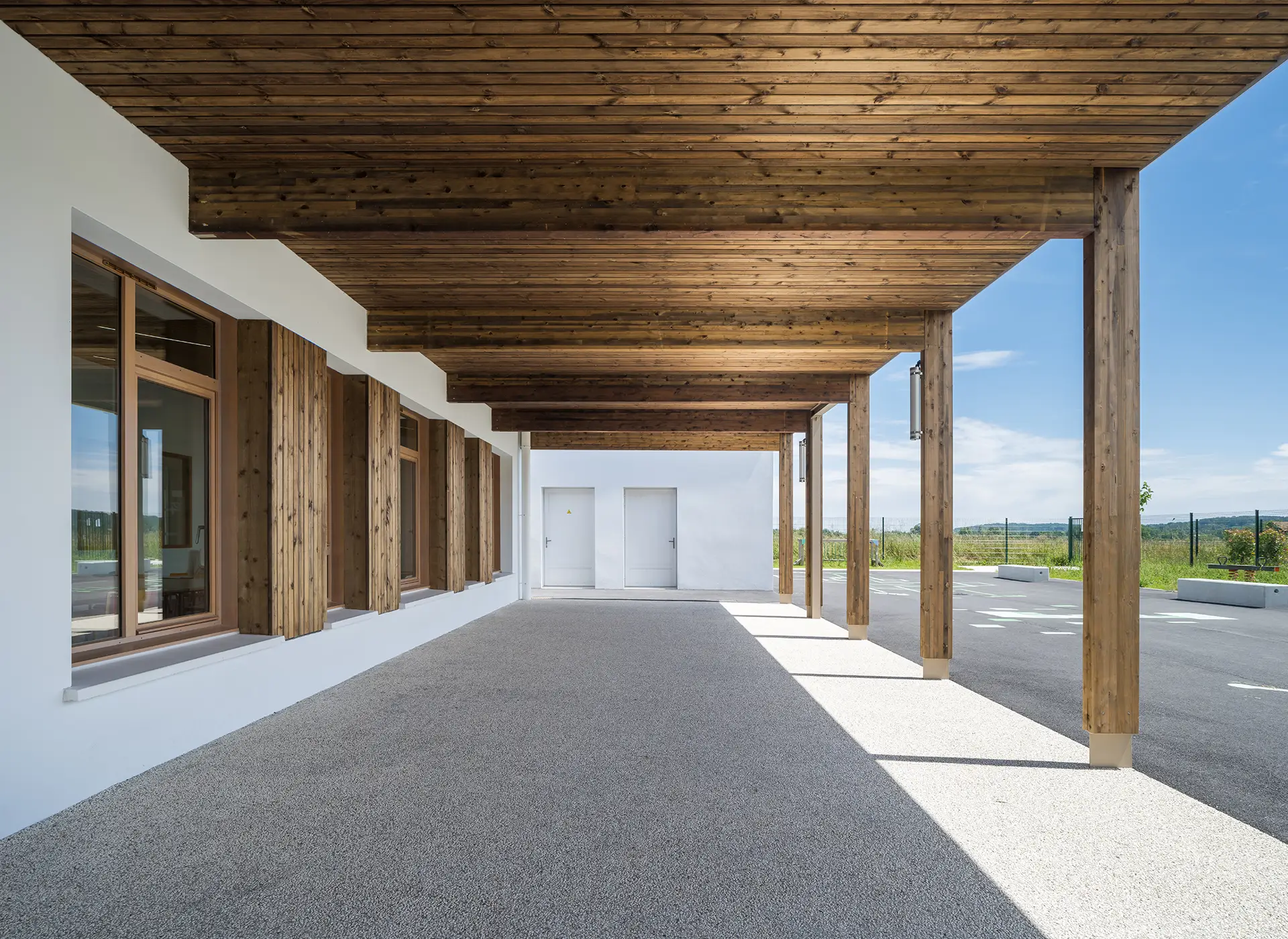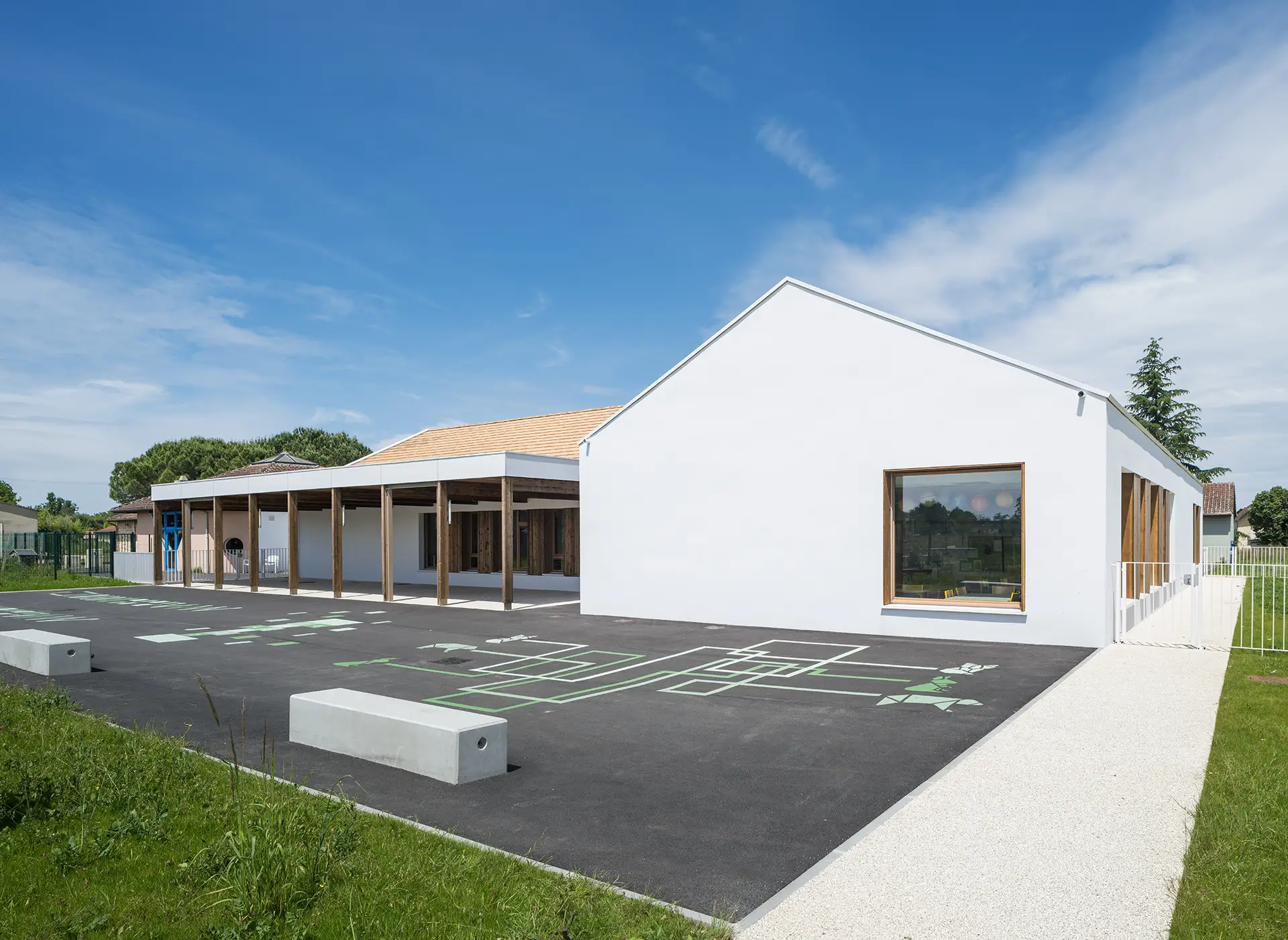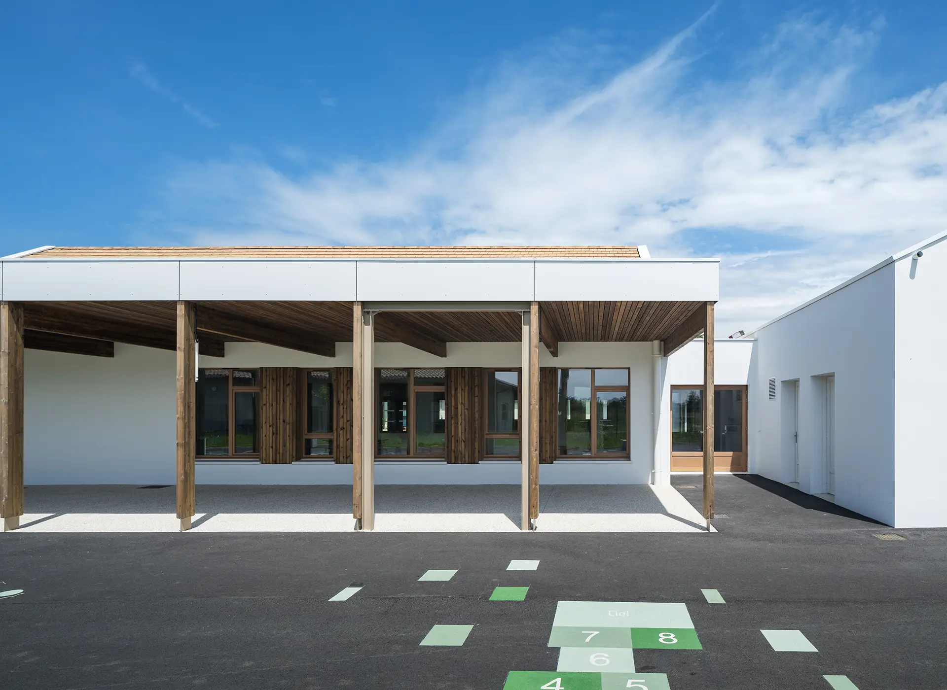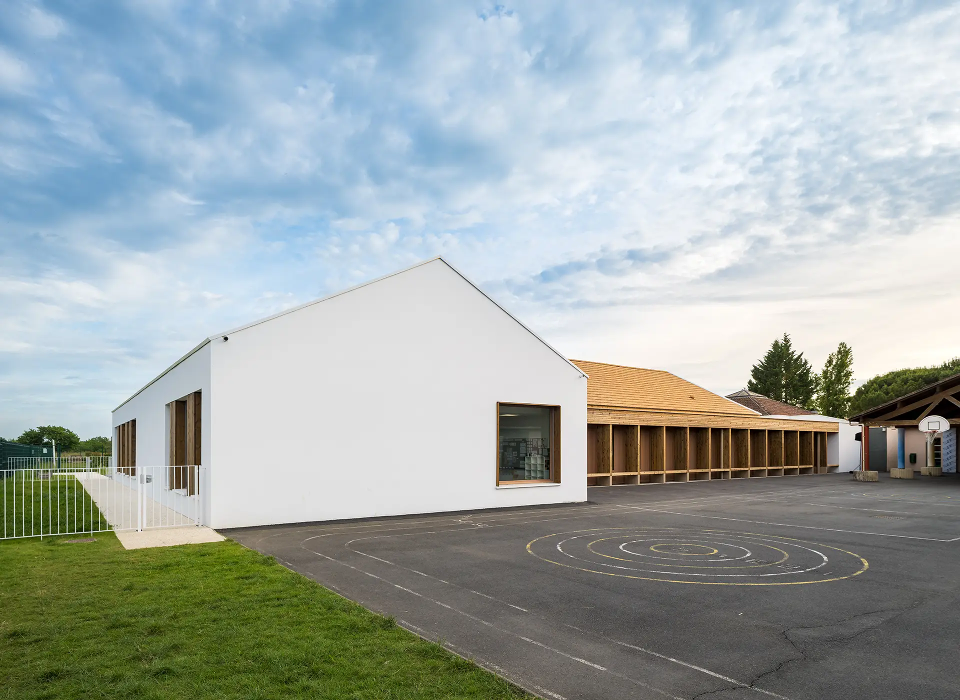 La nouvelle construction est constituée de deux volumes couverts de tuiles, dont les pignons très affirmés font écho à l’architecture traditionnelle des grandes demeures périgourdines. Ils sont reliés entre eux et à la construction existante par une circulation très ouverte sur l’extérieur, traitée en galerie faite d’alcôves qui intègrent des assises contemplatives dans la cour élémentaire. L’ancien restaurant scolaire est restructuré en pôle de motricité. Le projet fait enfin la part belle aux matériaux bio et géo-sourcés : charpentes de toiture et vêtures en bois local, couvertures en terre cuite, menuiseries en bois, isolants en laine de bois, linoleum.